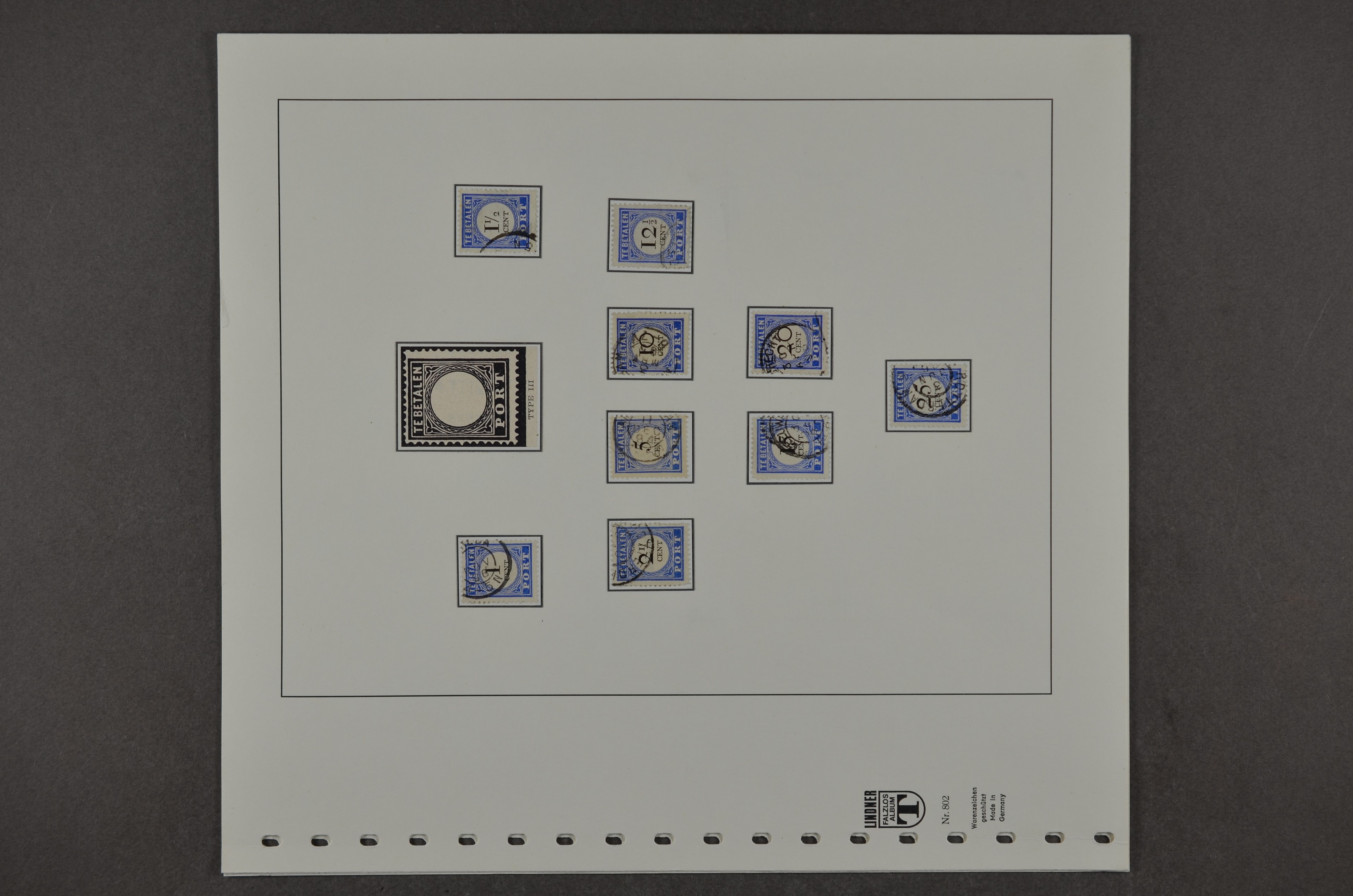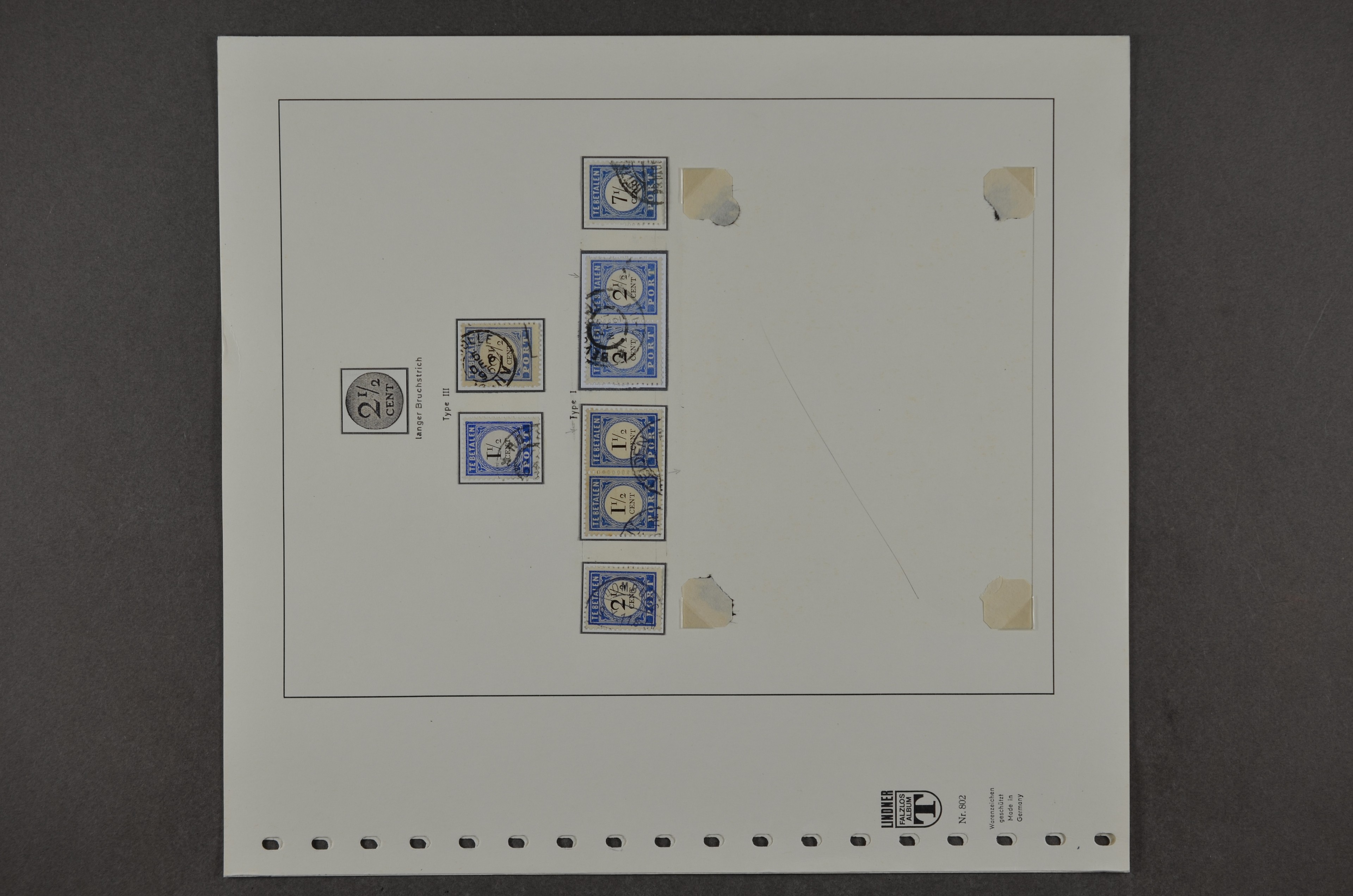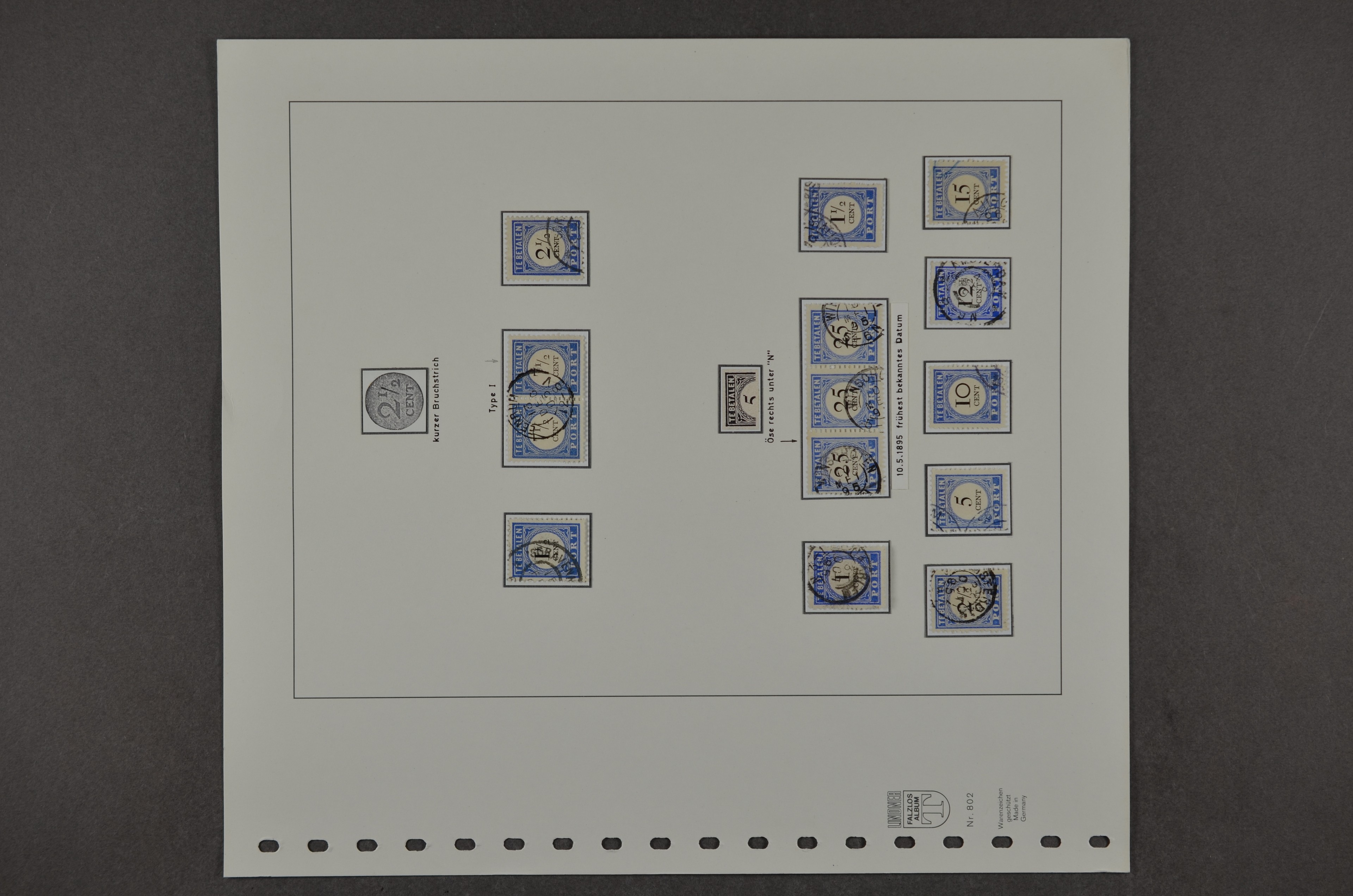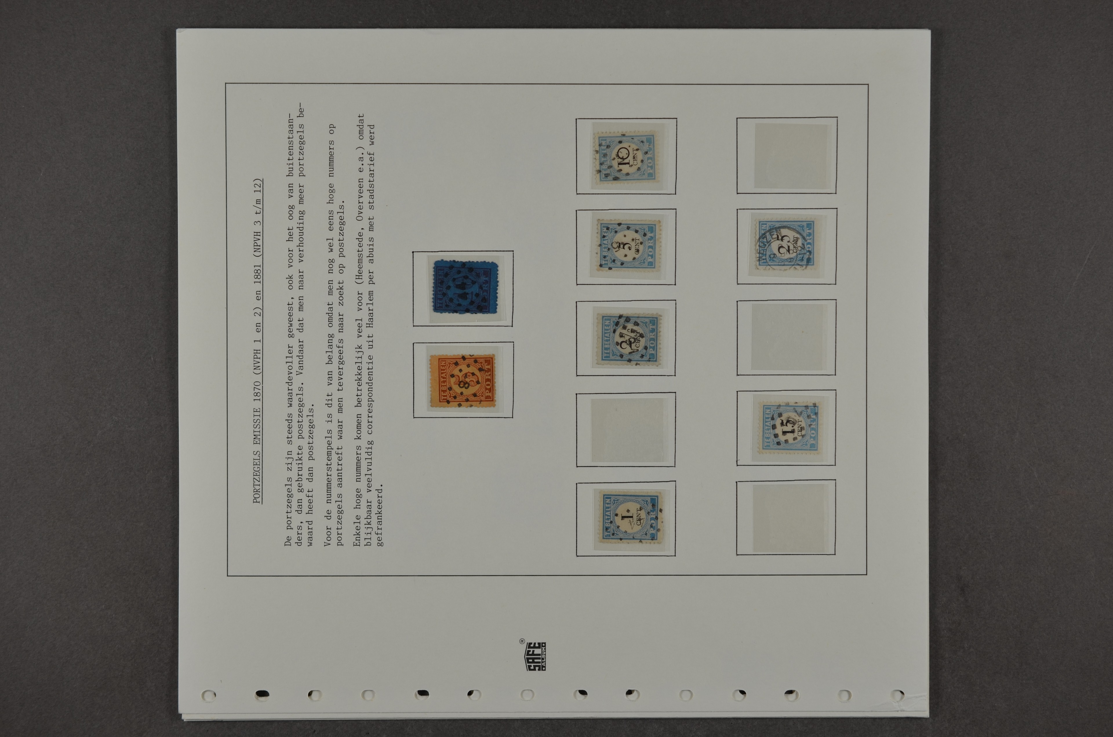 PORT 1870-1894, gebruikte verzameling van vnl. de donkerblauwe porten in type I w.o. P20fa, type III w.o. met plaatfout ´Haakje´ P14f-24f, lange breukstreep, op 5 bladen