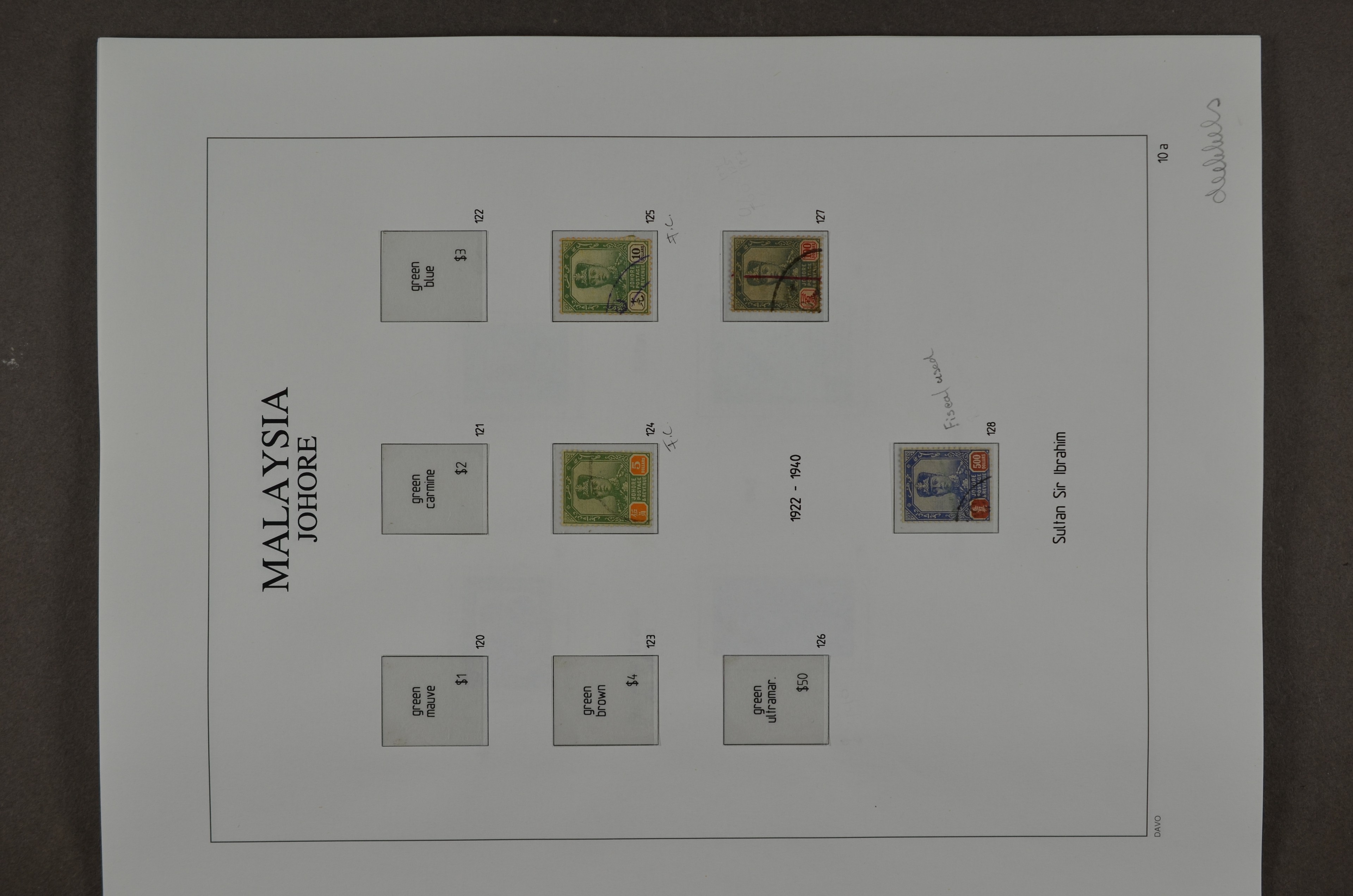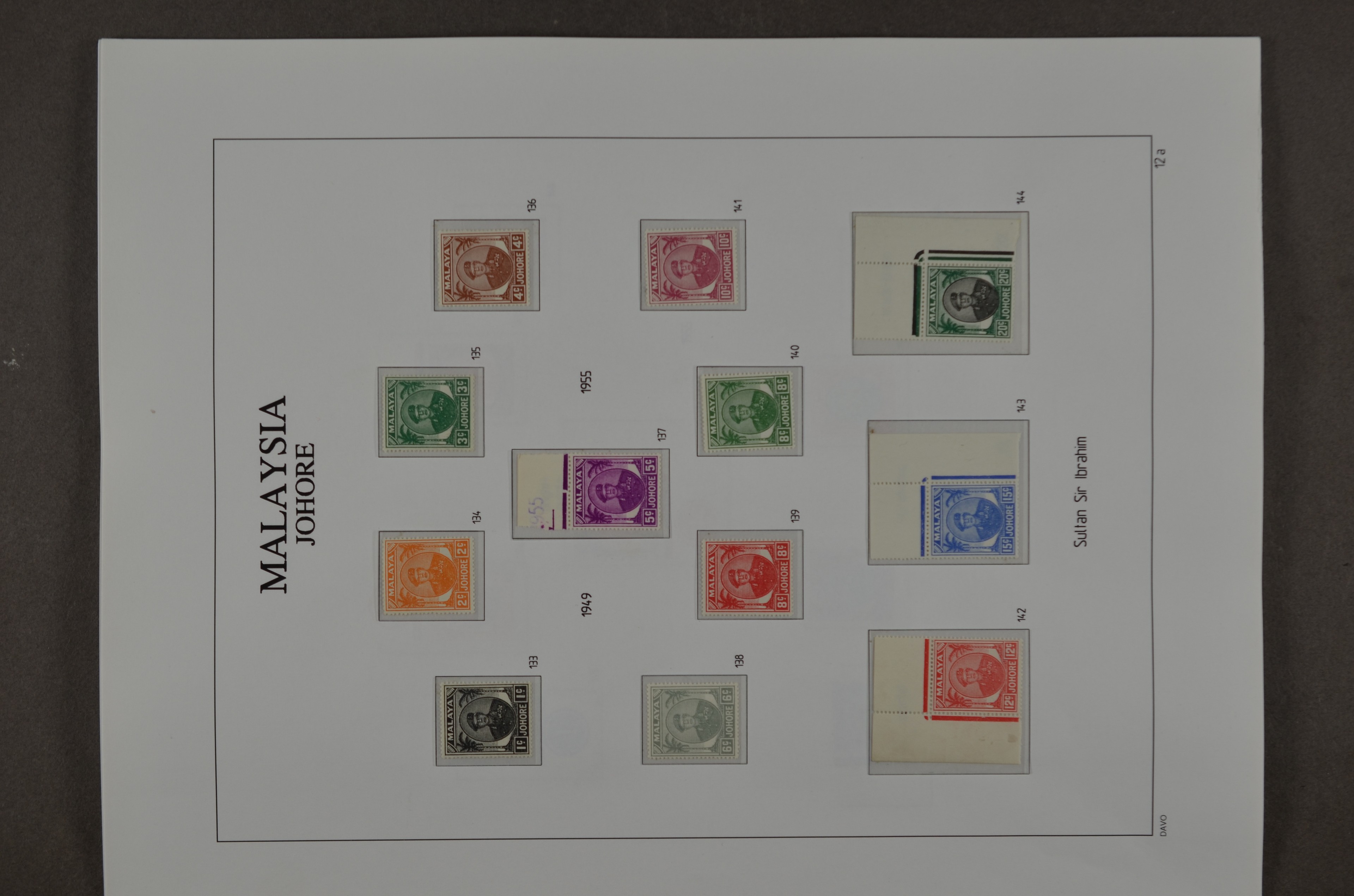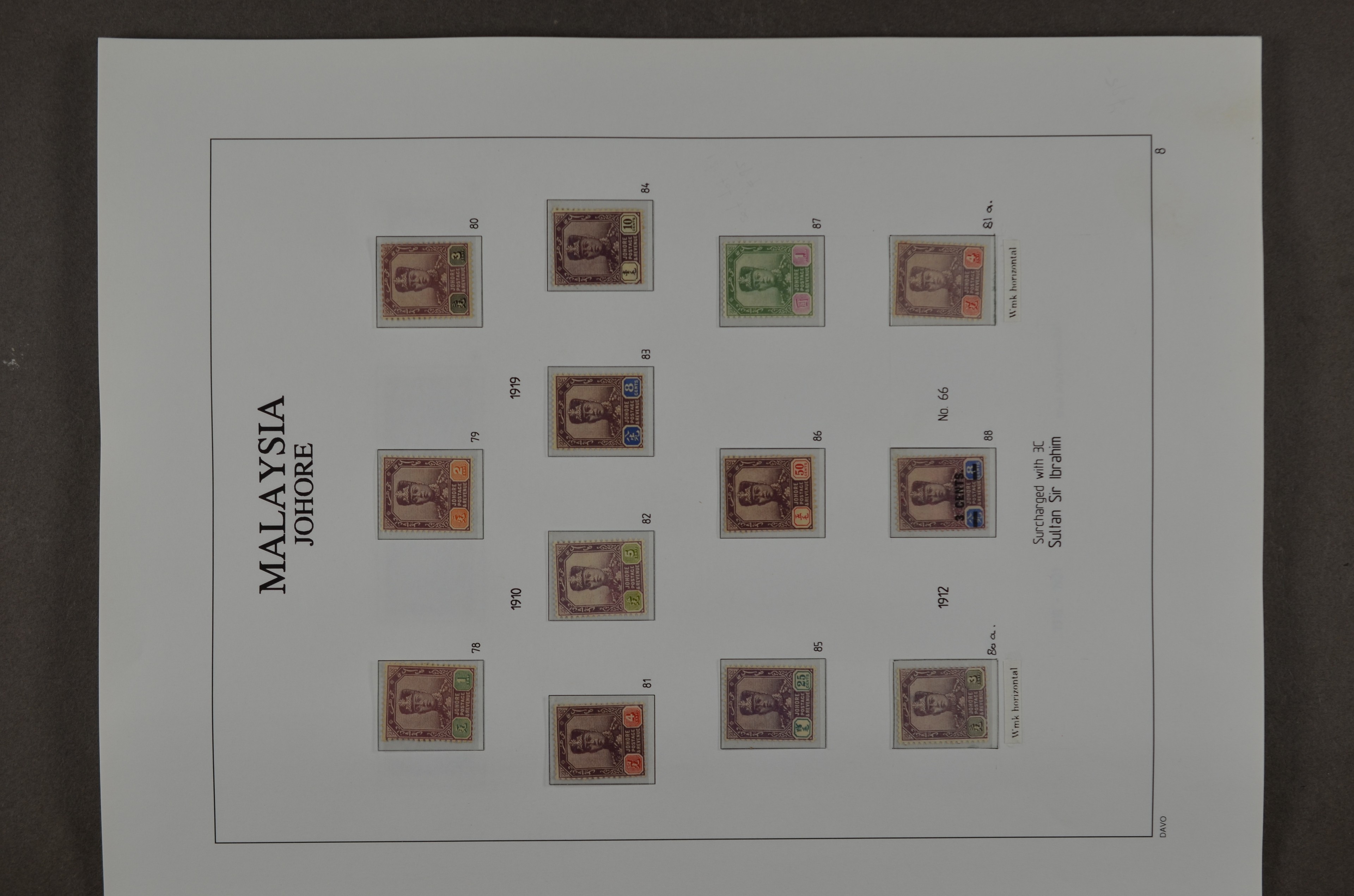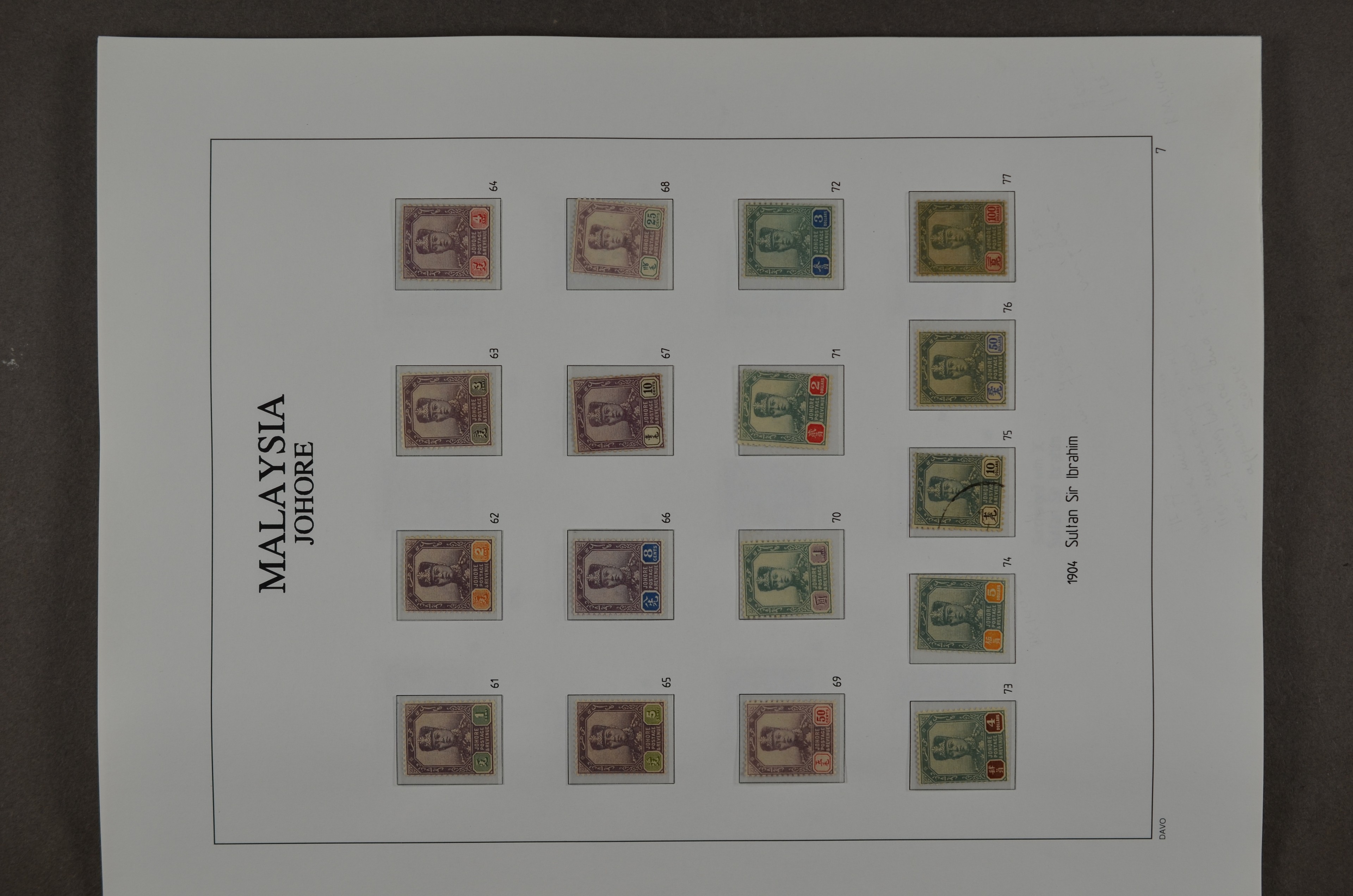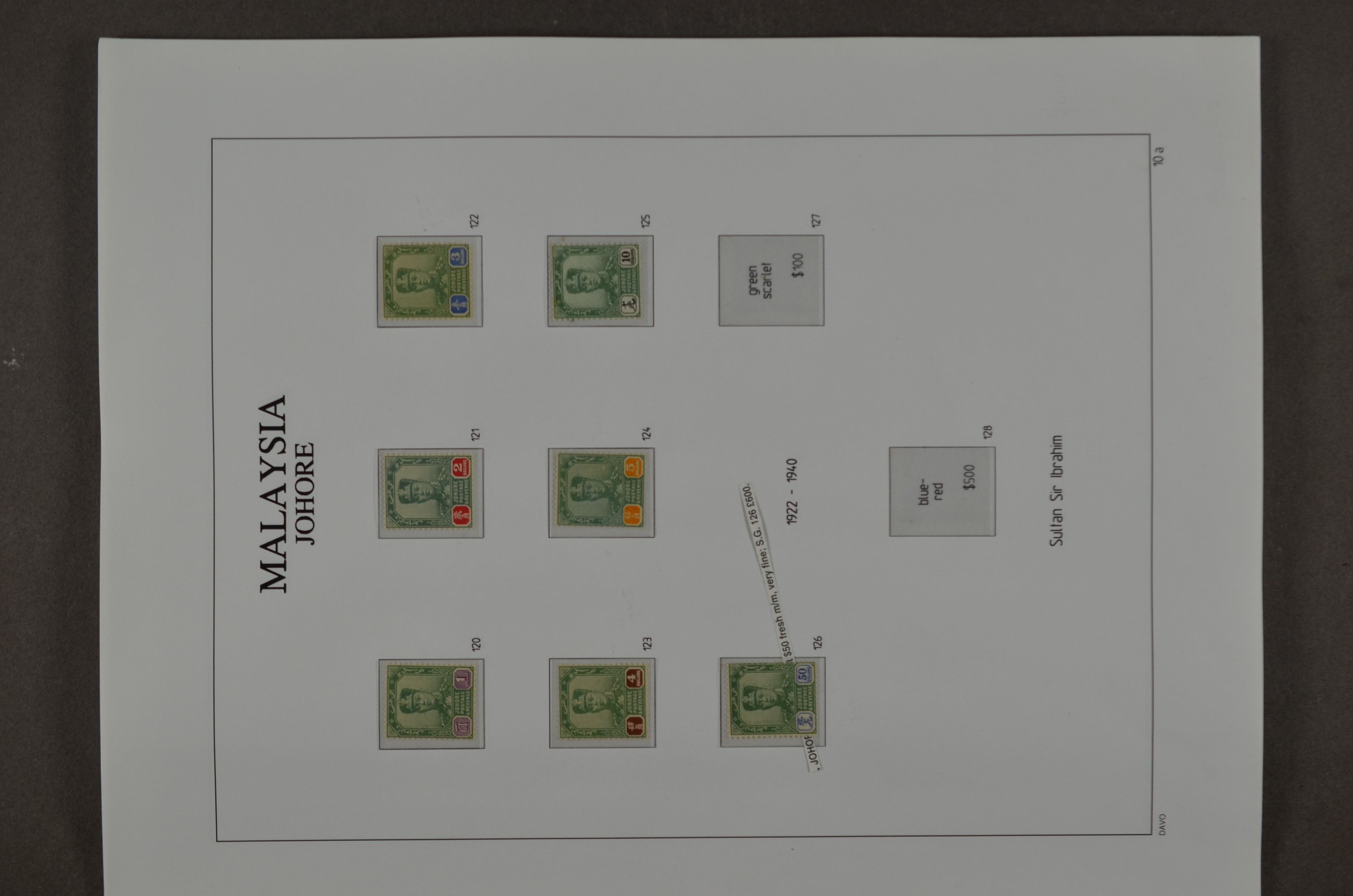BR.COMMONWEALTH, Malaysian States, Johore 1884-1979, o/*/** collection on albumpages with good numbers and sets, f.e.: S.G.3, 5, 6, 14, 39/53, 61/77, 78/87, 101, 103/25, 126, 127 (f.c.), 128 (f.c.), 133/47 and D1/5. Beautiful lot with very high value!