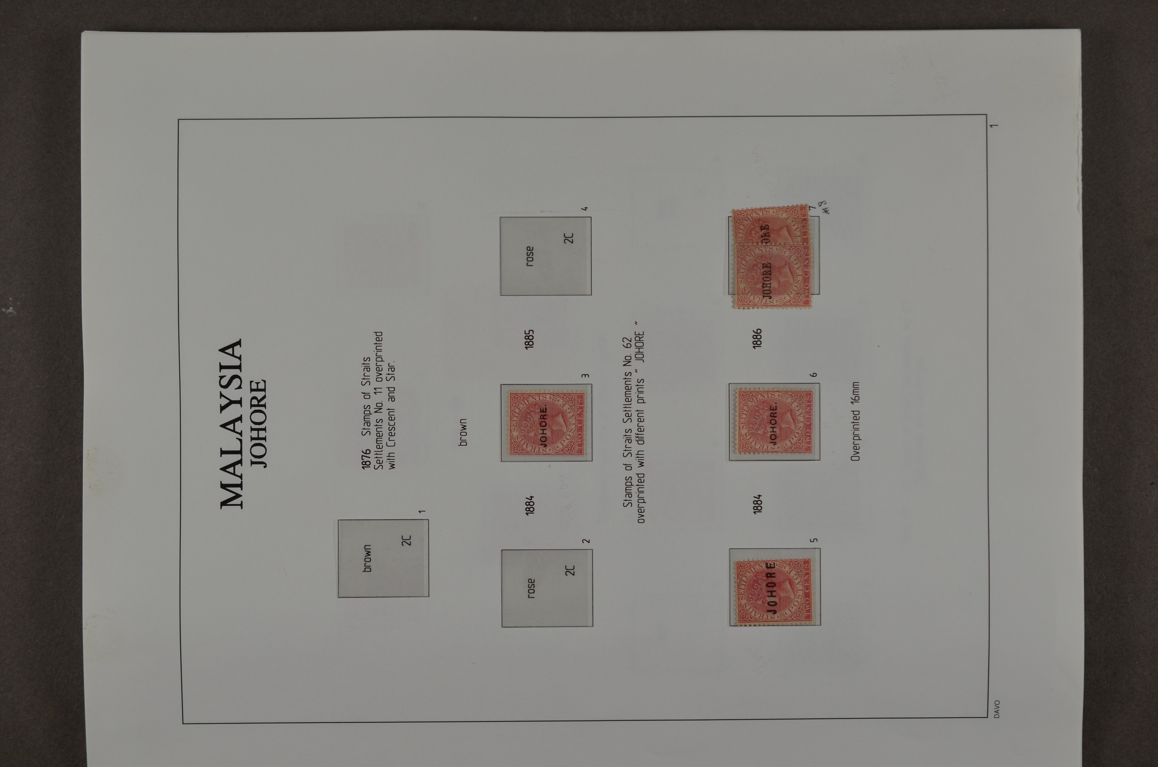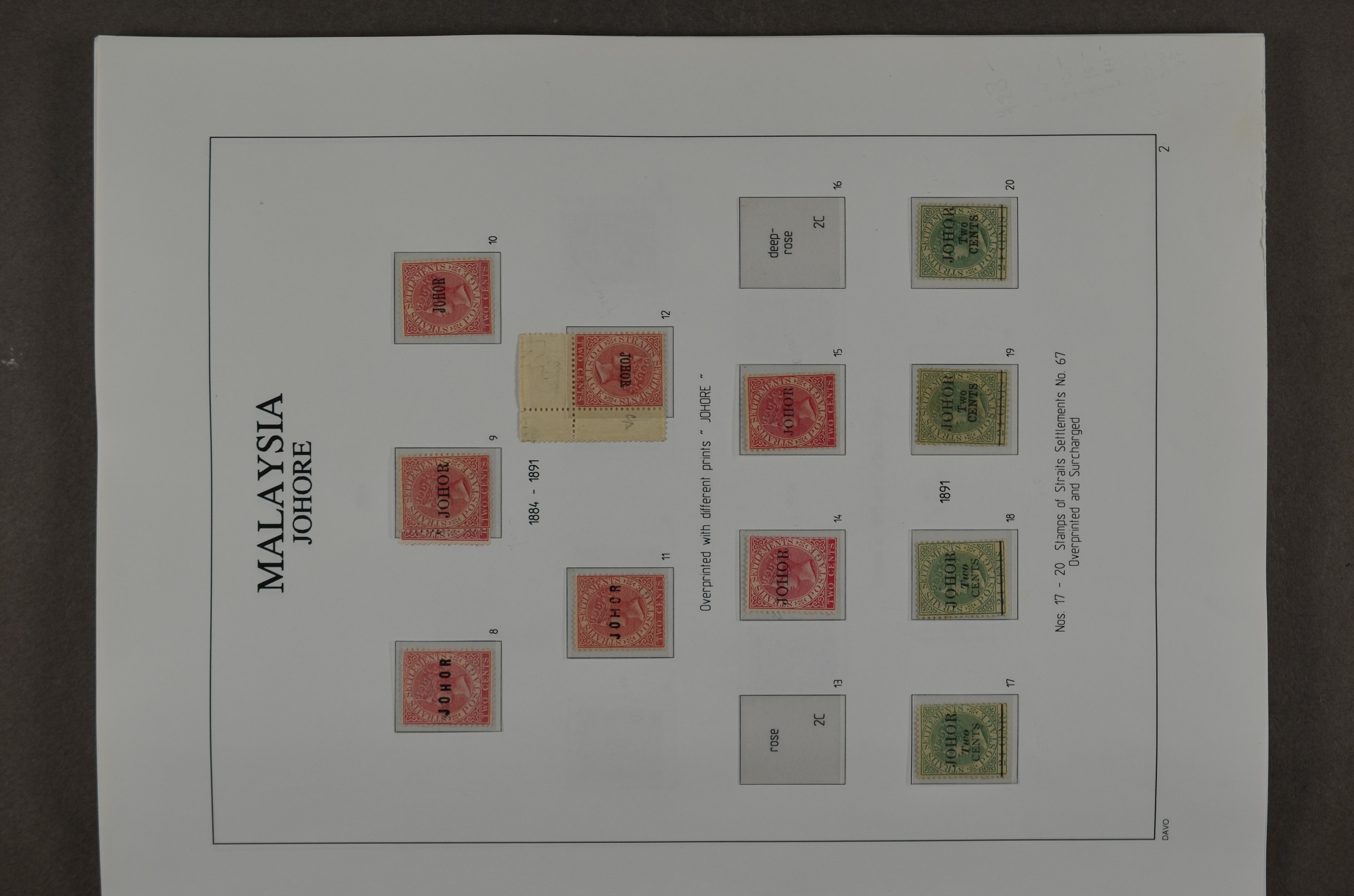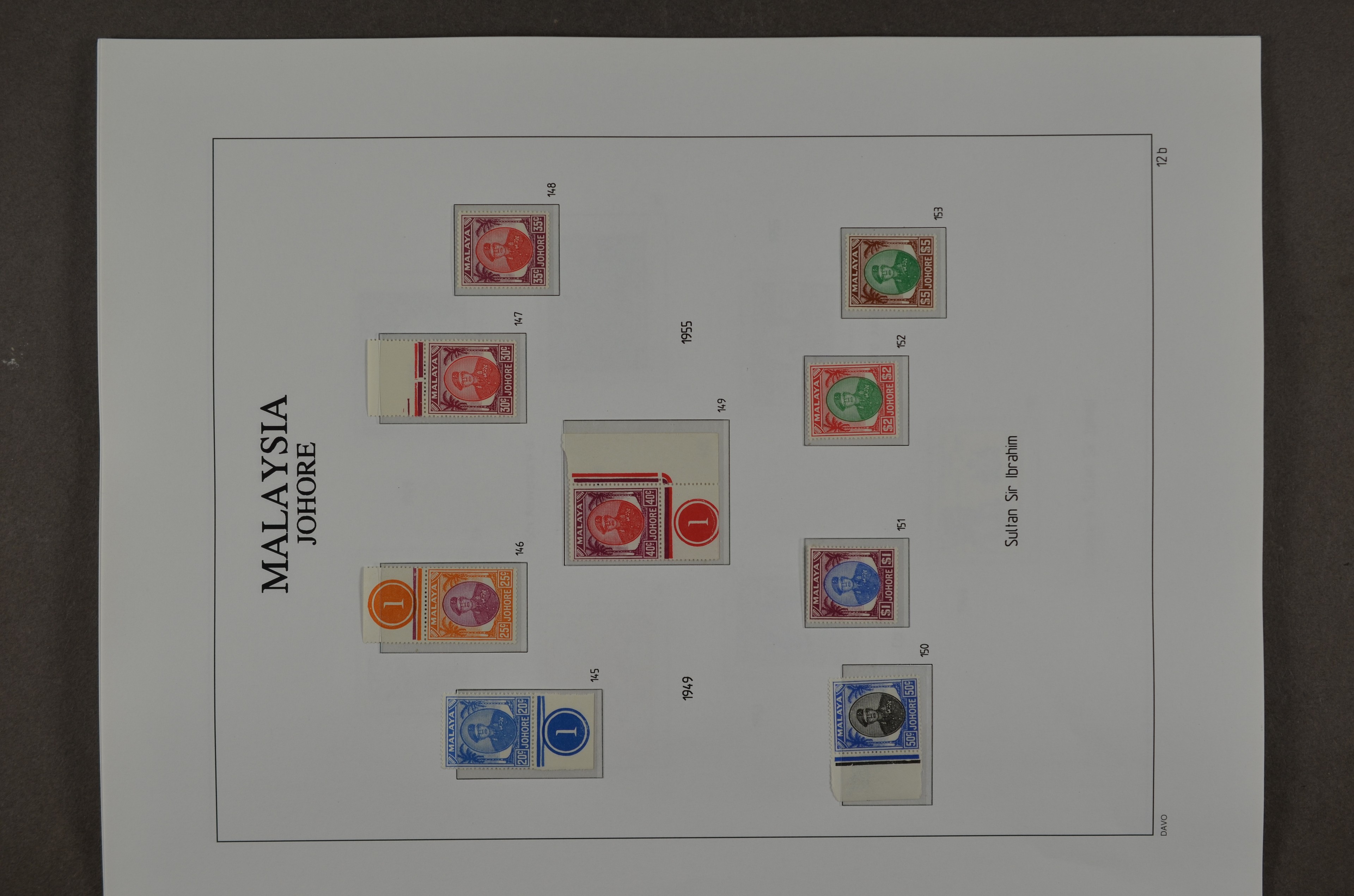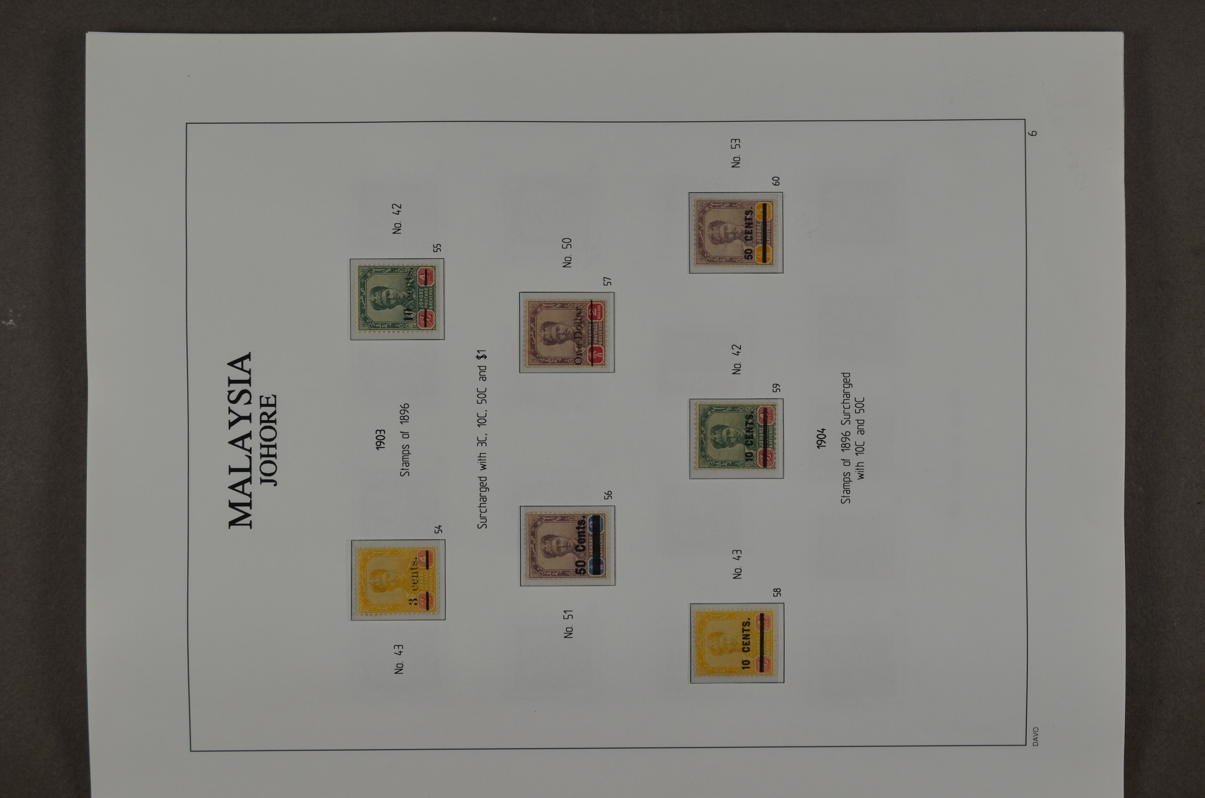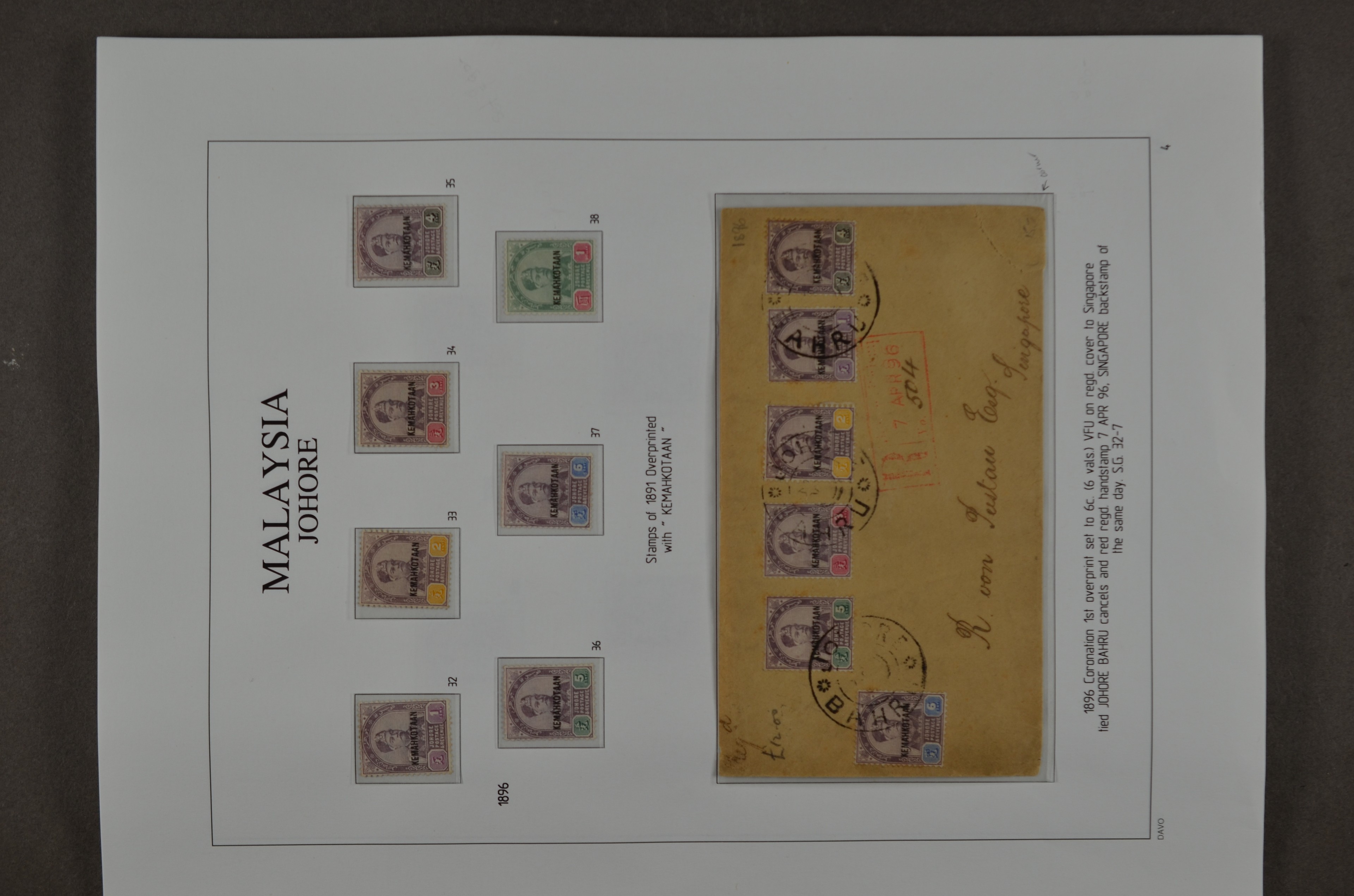 BR.COMMONWEALTH, Malaysian States, Johore 1884-1979, o/*/** collection on albumpages with good numbers and sets, f.e.: S.G.3, 5, 6, 14, 39/53, 61/77, 78/87, 101, 103/25, 126, 127 (f.c.), 128 (f.c.), 133/47 and D1/5. Beautiful lot with very high value!