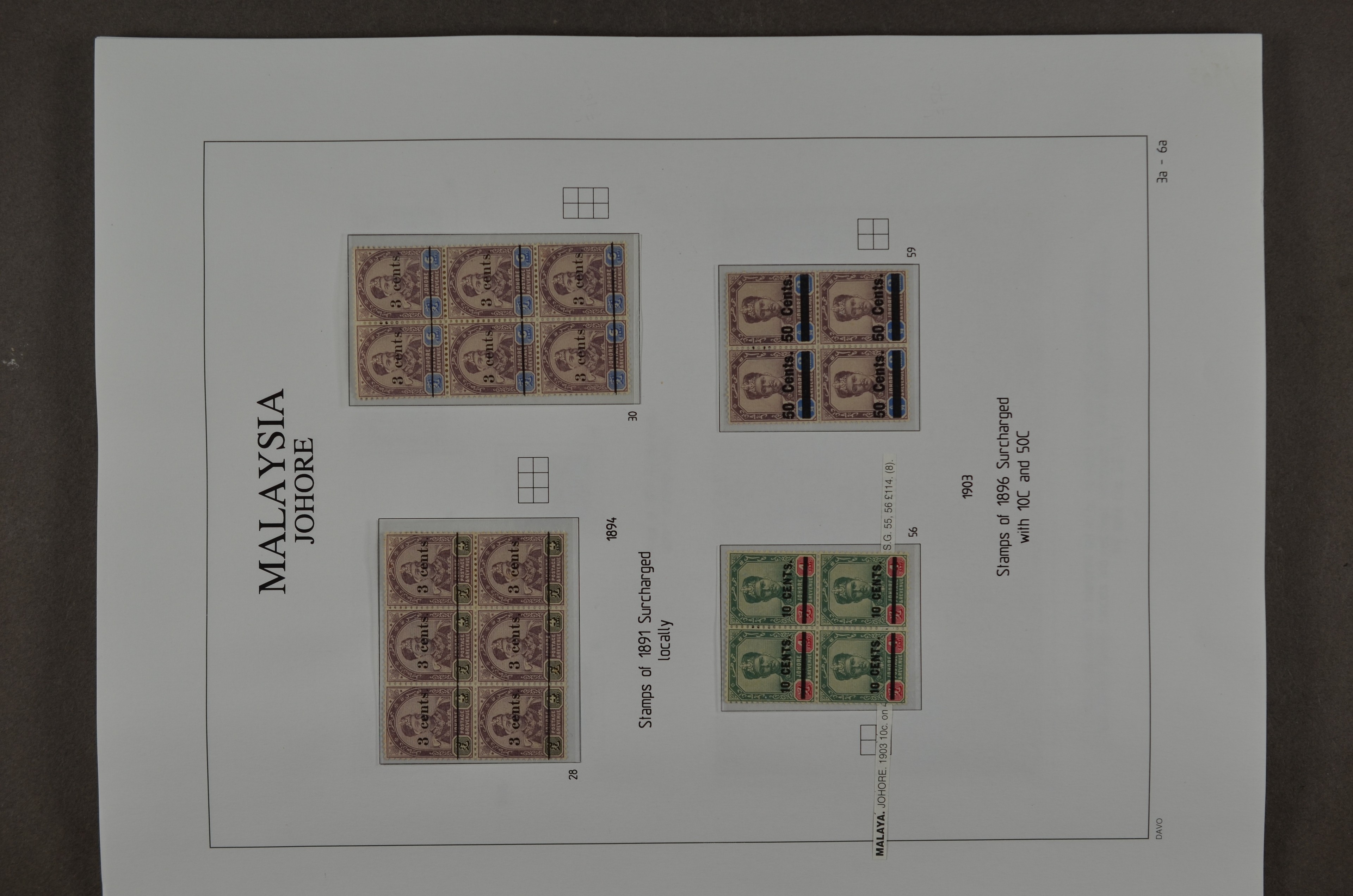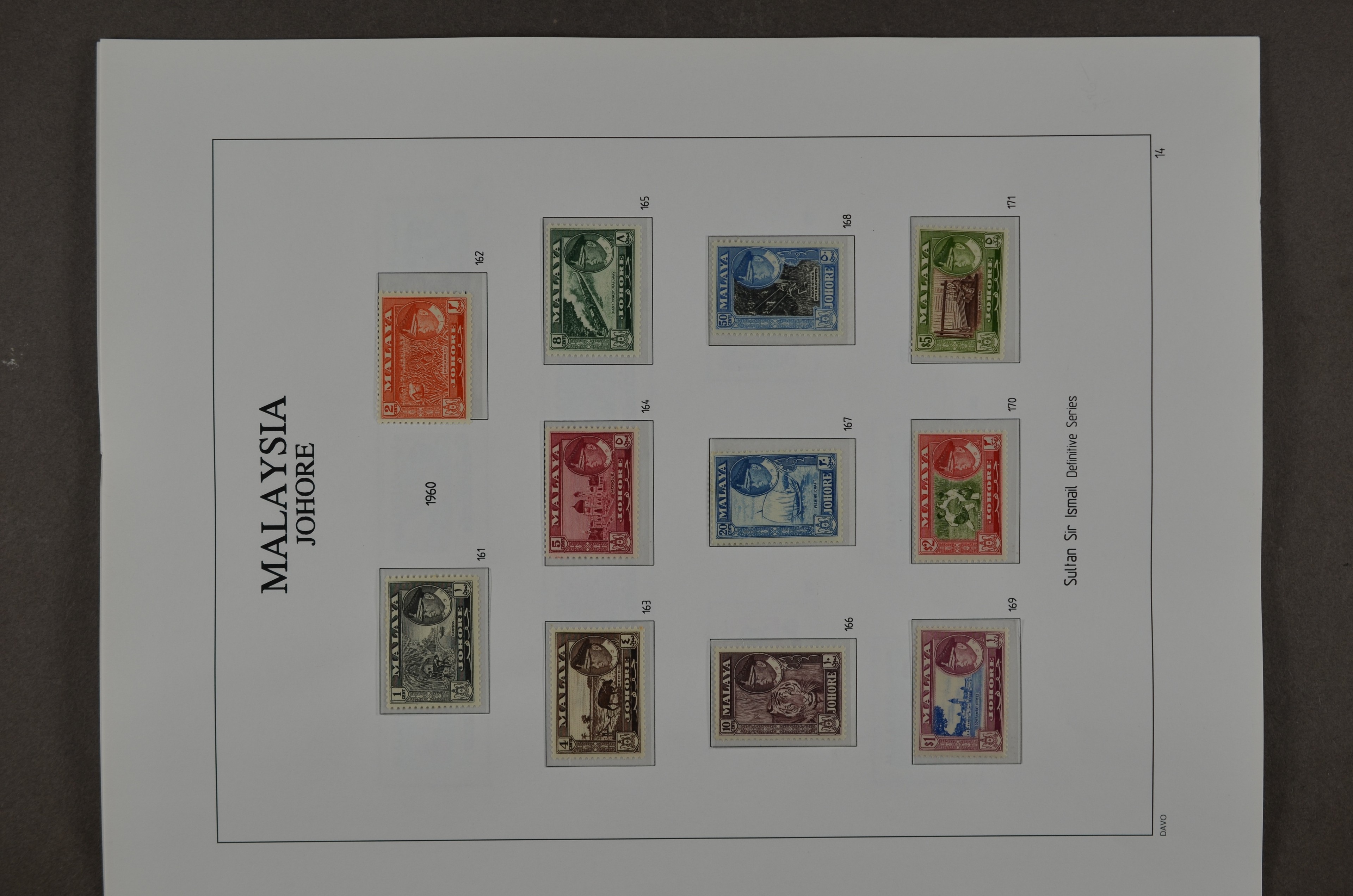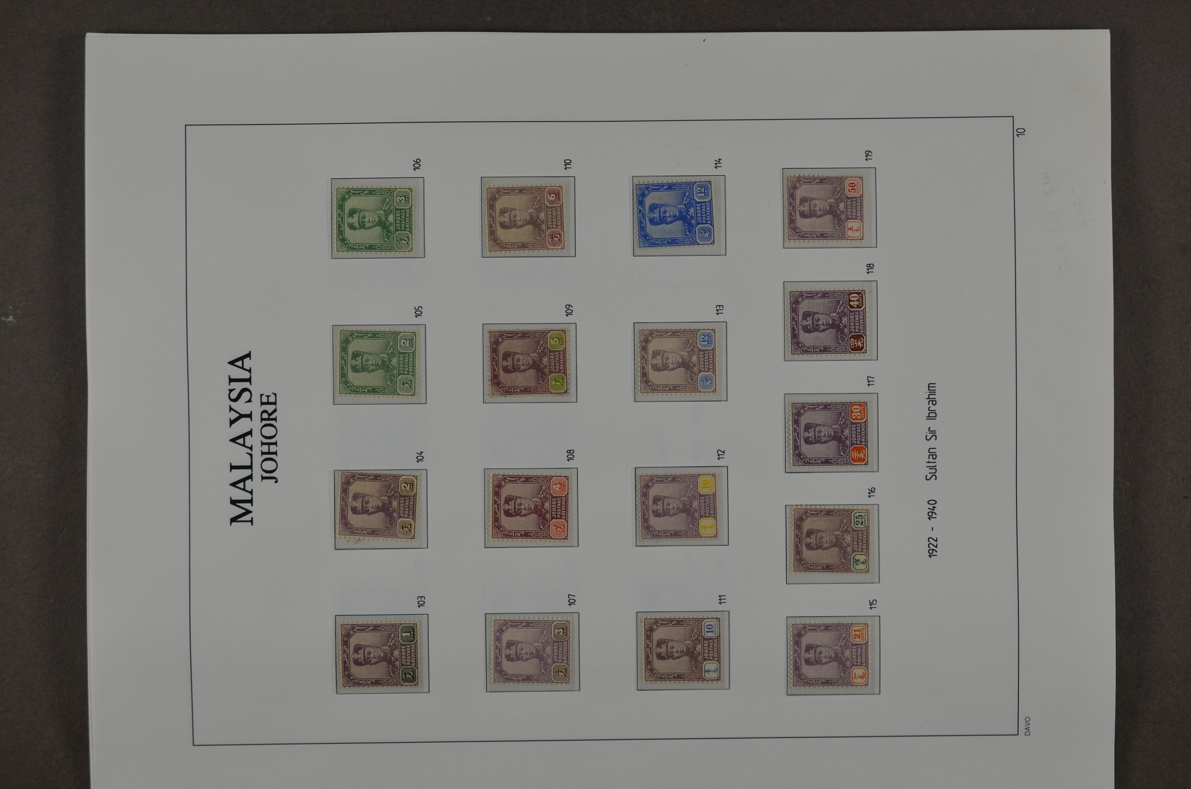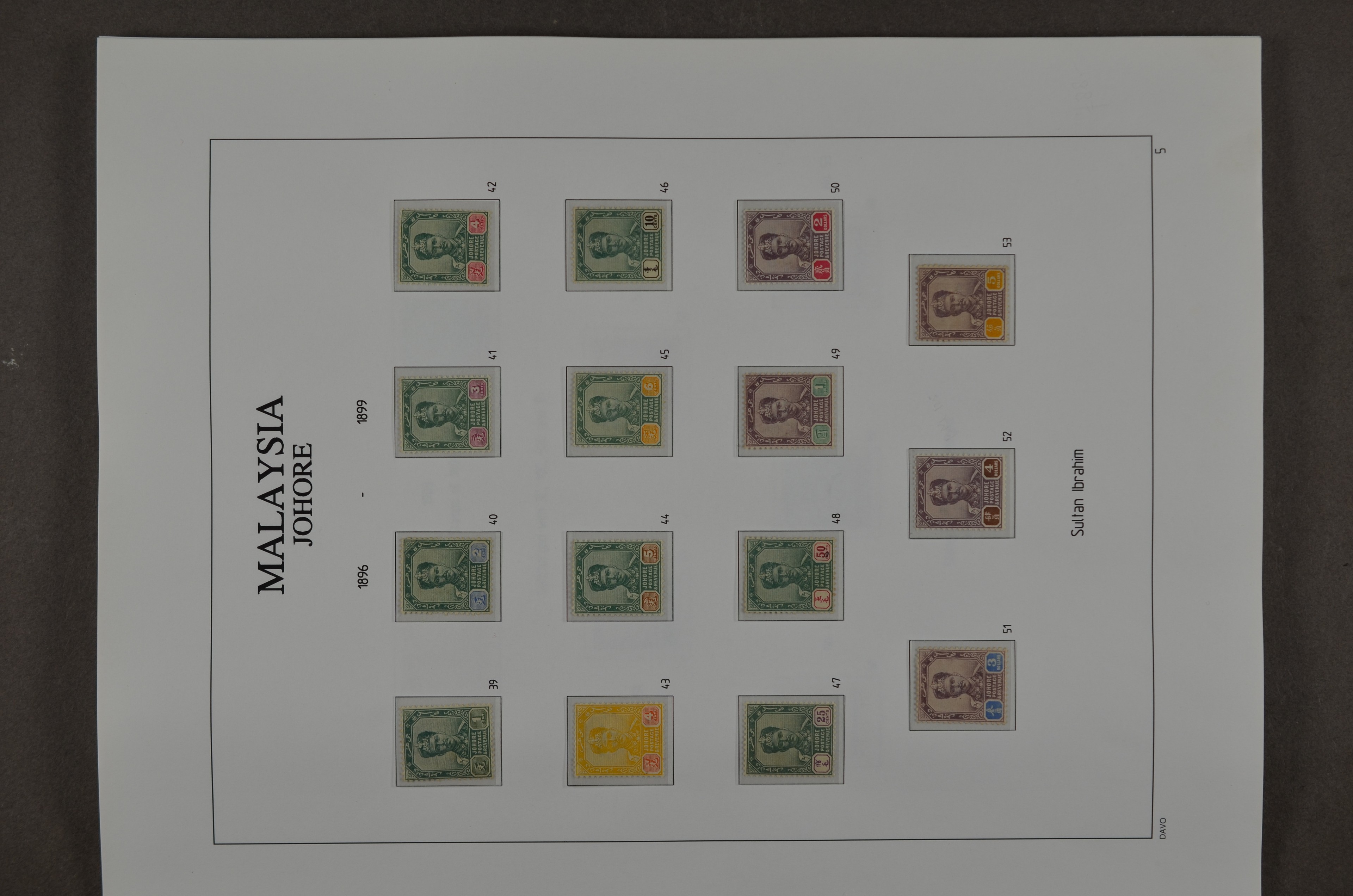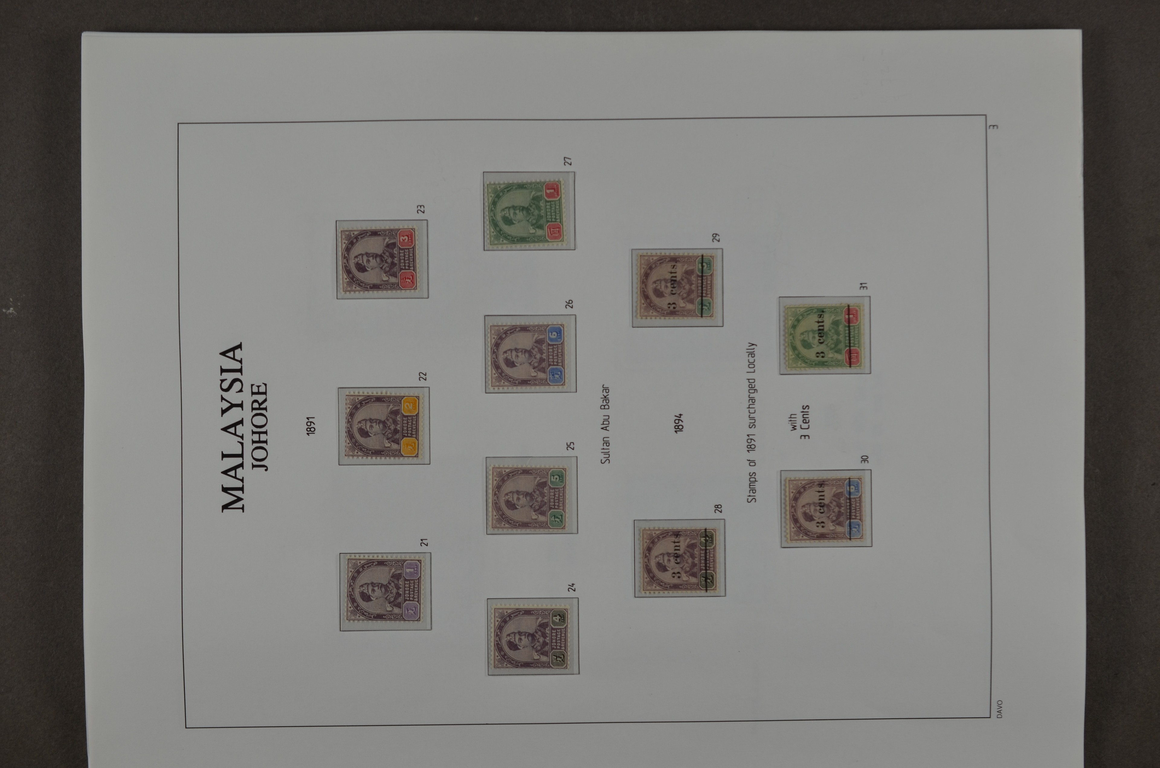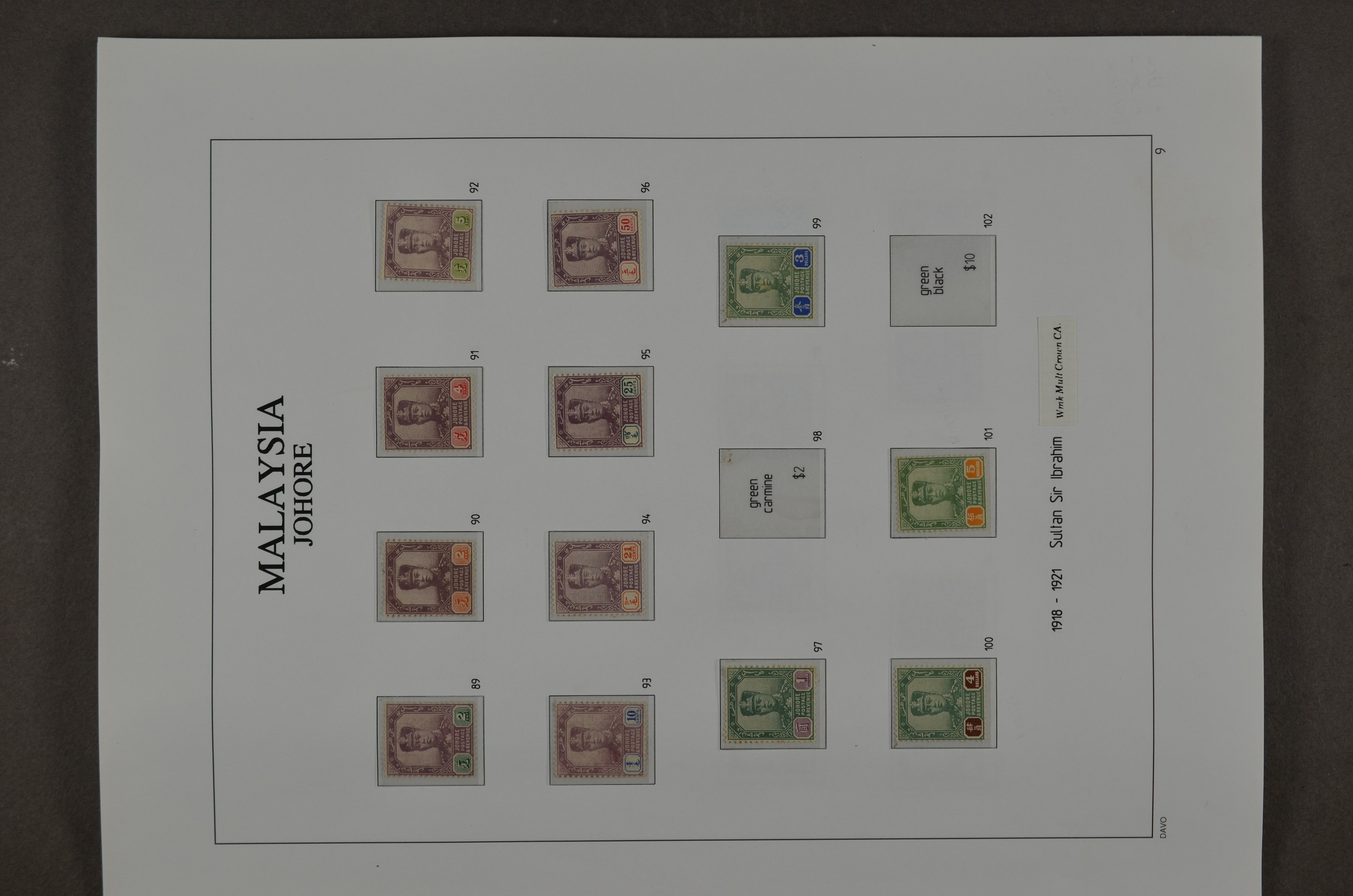 BR.COMMONWEALTH, Malaysian States, Johore 1884-1979, o/*/** collection on albumpages with good numbers and sets, f.e.: S.G.3, 5, 6, 14, 39/53, 61/77, 78/87, 101, 103/25, 126, 127 (f.c.), 128 (f.c.), 133/47 and D1/5. Beautiful lot with very high value!