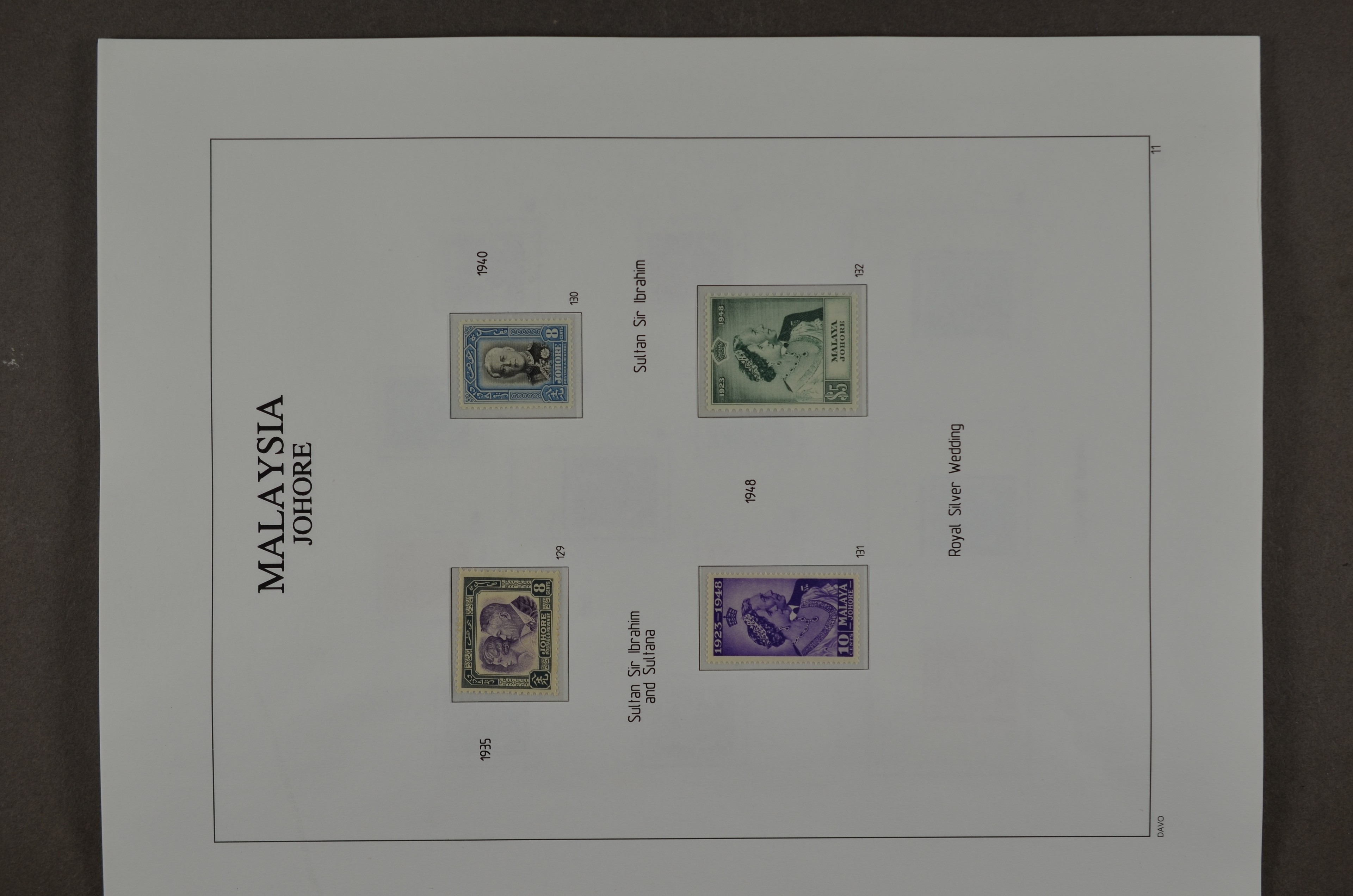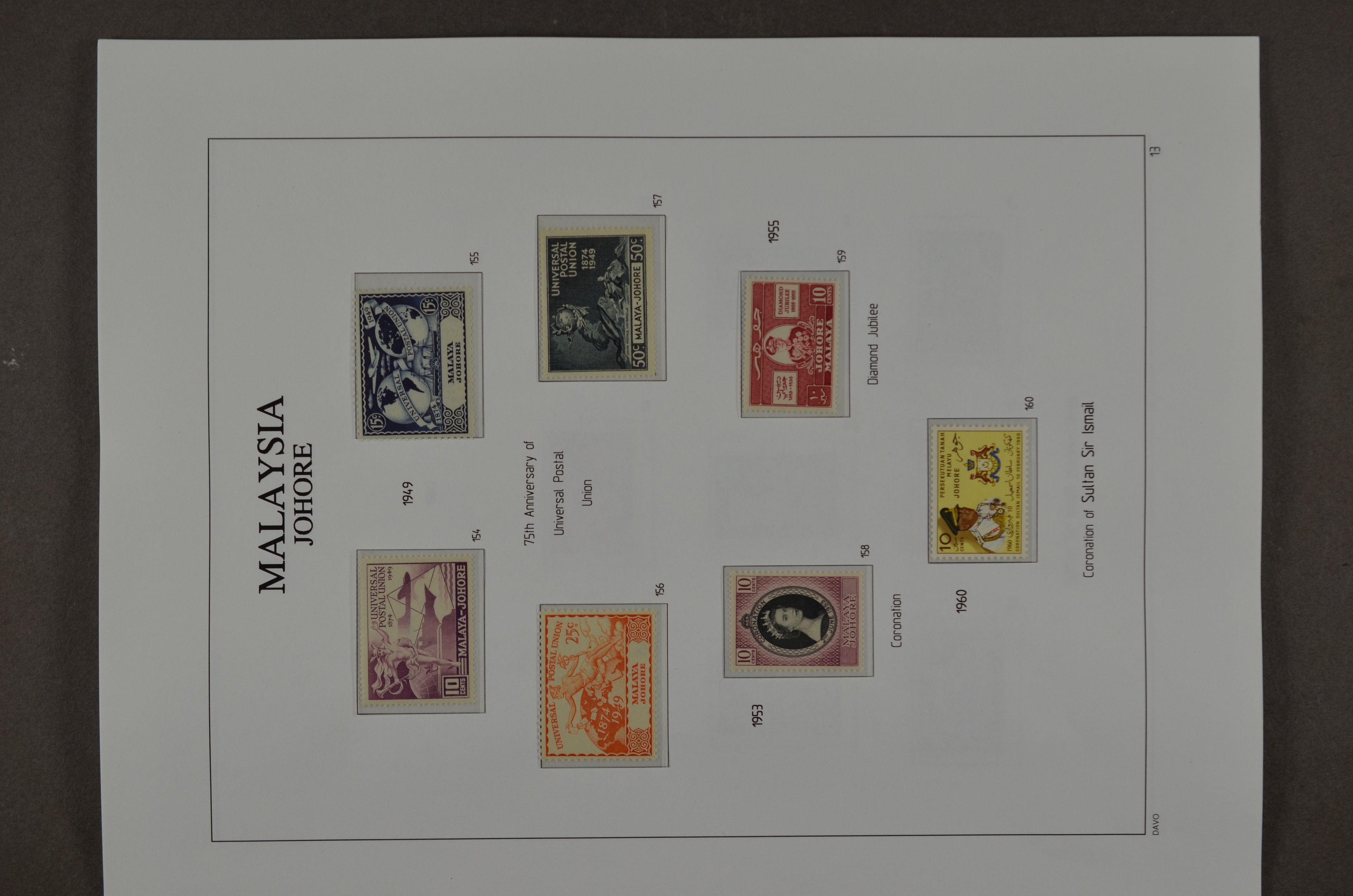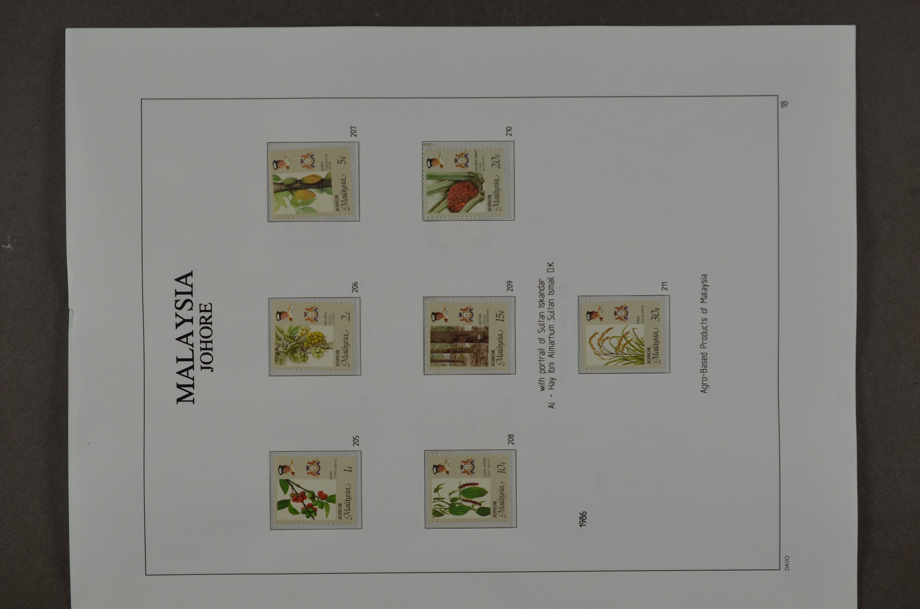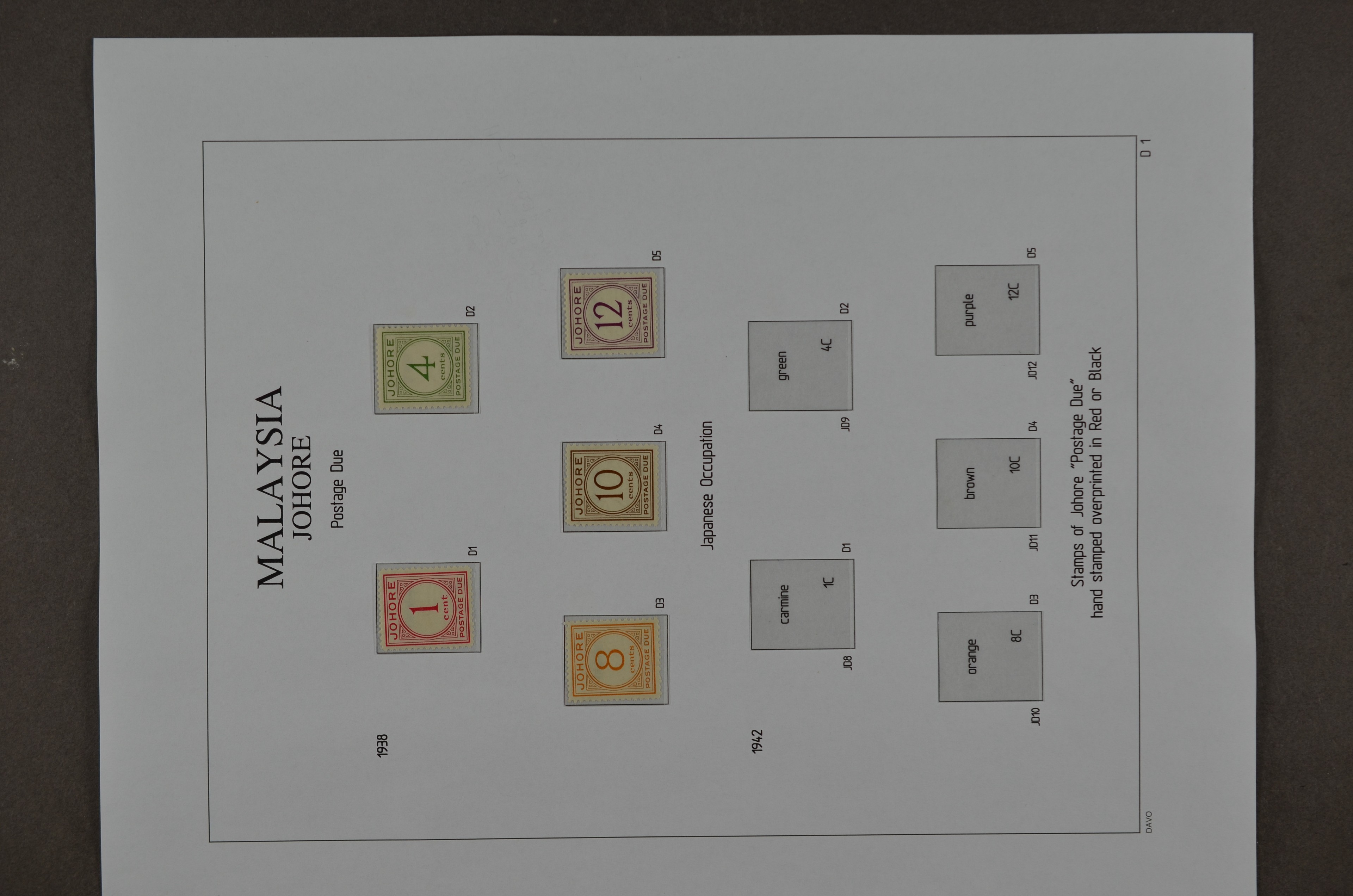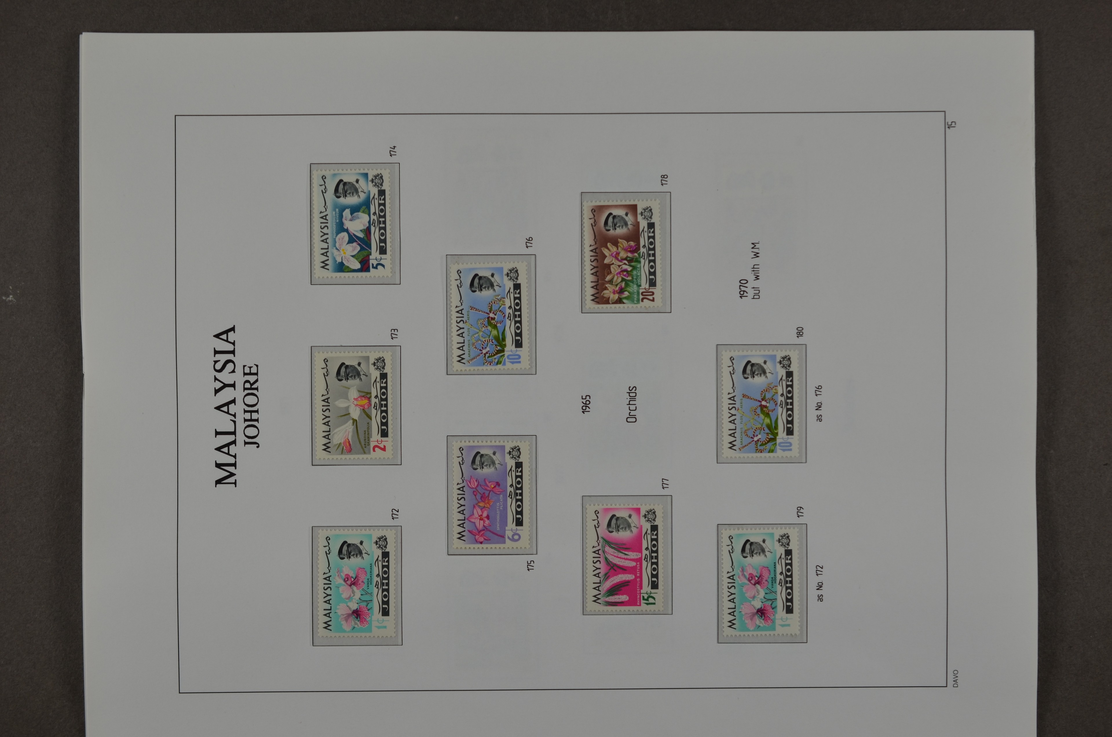 BR.COMMONWEALTH, Malaysian States, Johore 1884-1979, o/*/** collection on albumpages with good numbers and sets, f.e.: S.G.3, 5, 6, 14, 39/53, 61/77, 78/87, 101, 103/25, 126, 127 (f.c.), 128 (f.c.), 133/47 and D1/5. Beautiful lot with very high value!