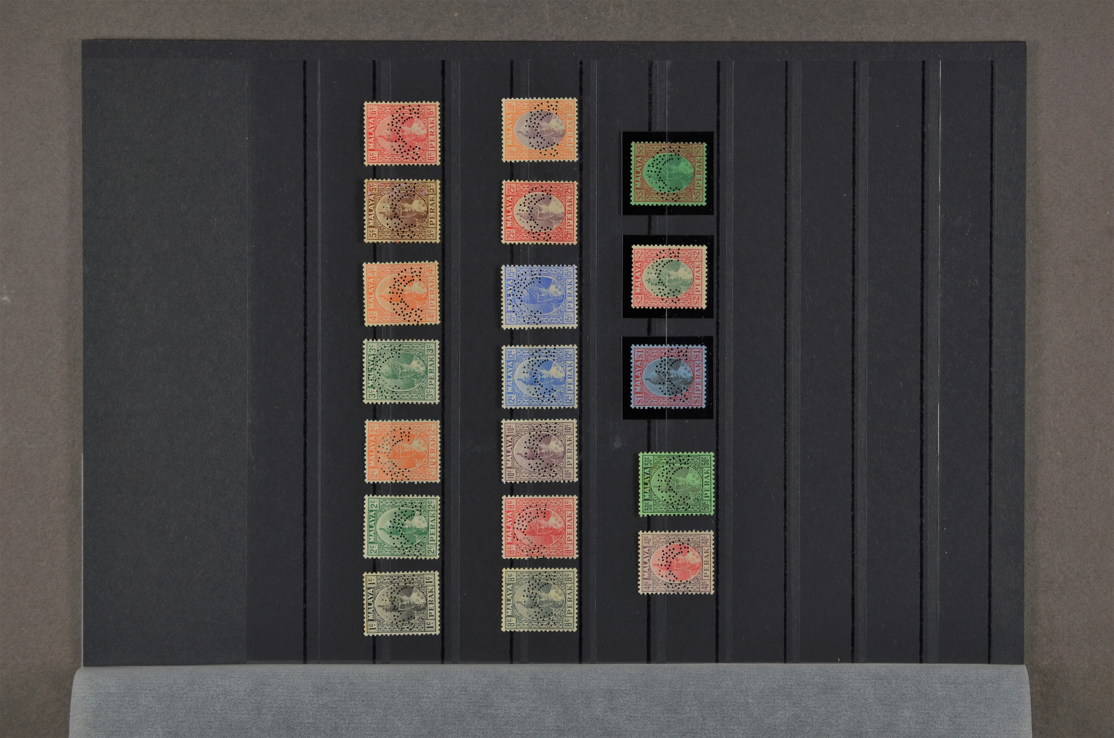 BR.COMMONWEALTH, Malaysian States, Perak 1938-1941, S.G.103s/21s, perforated Specimen-set of 19, 1 cent /$.5,-, a few stamps have toned gum, cat.value £.600