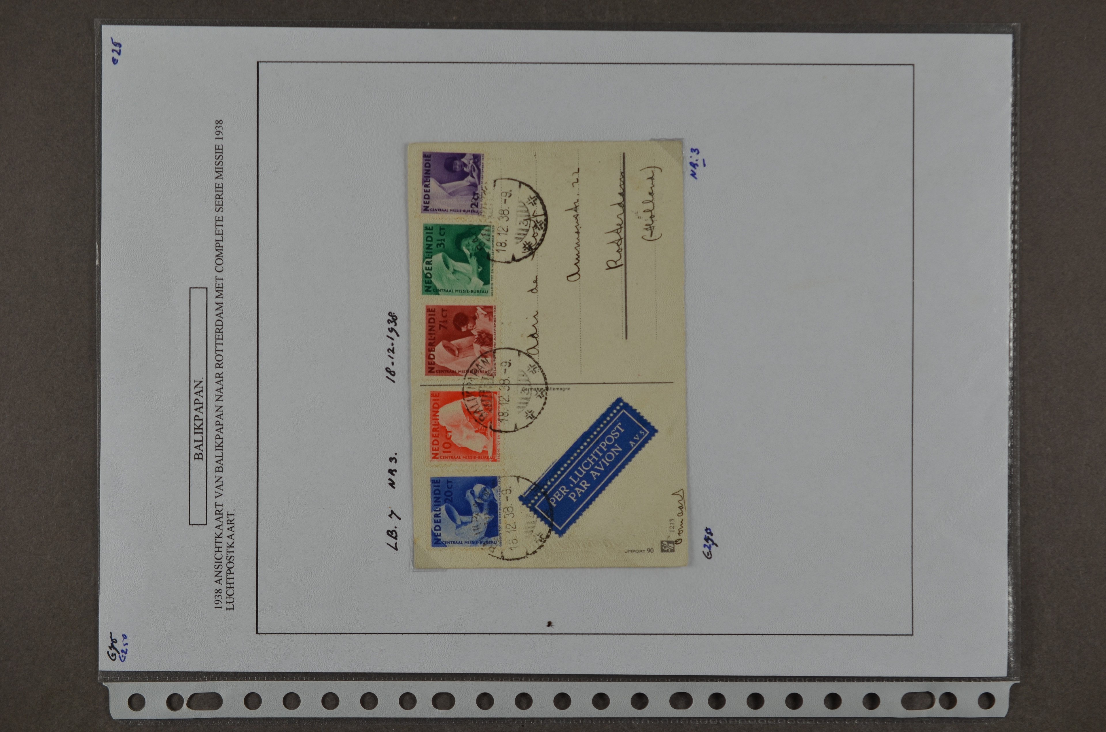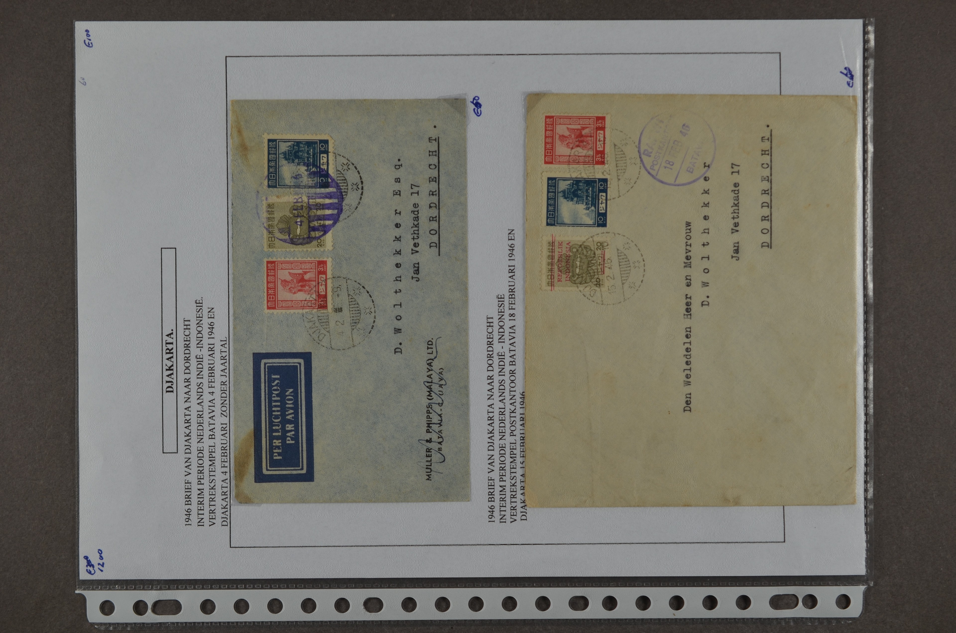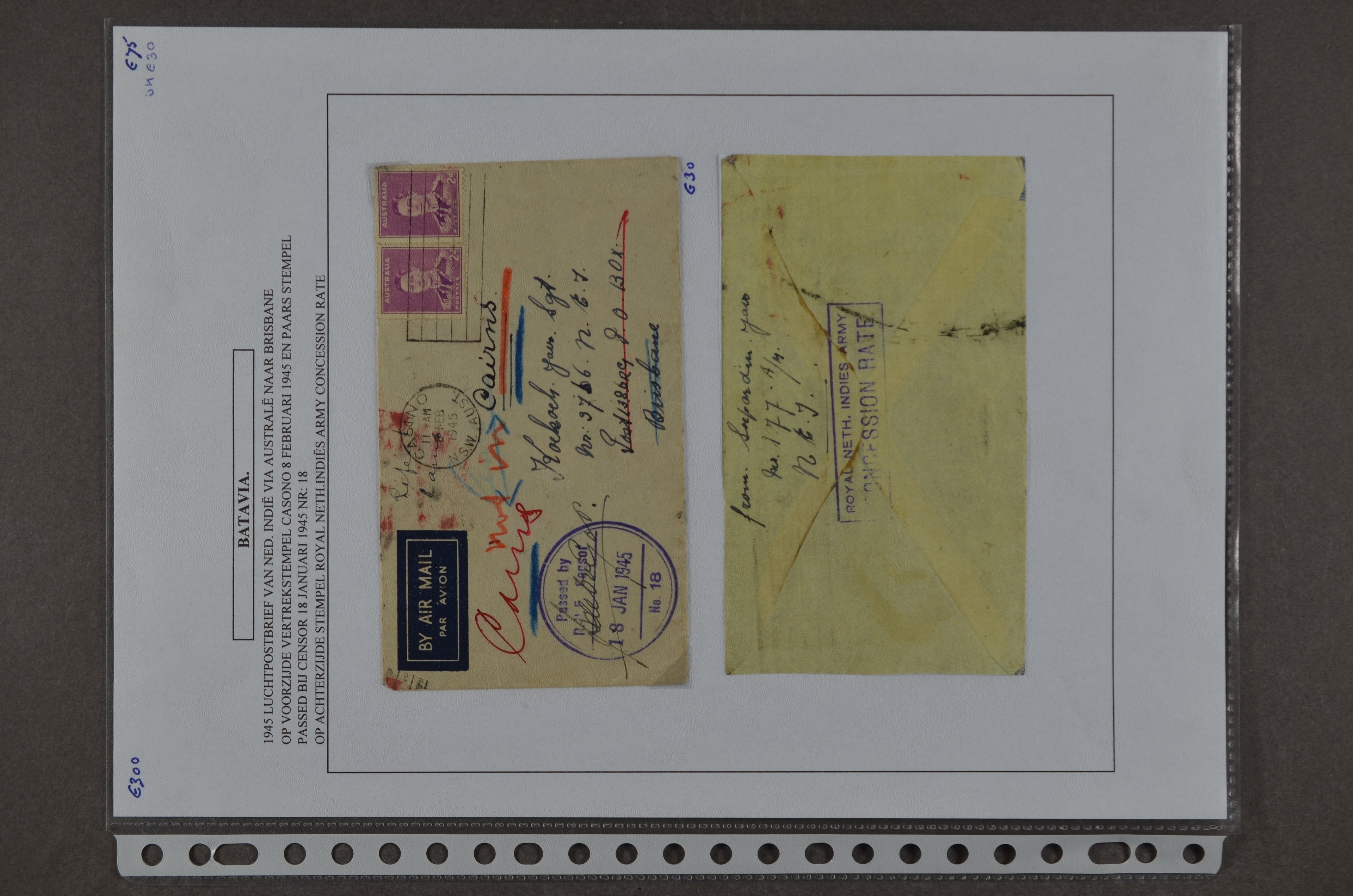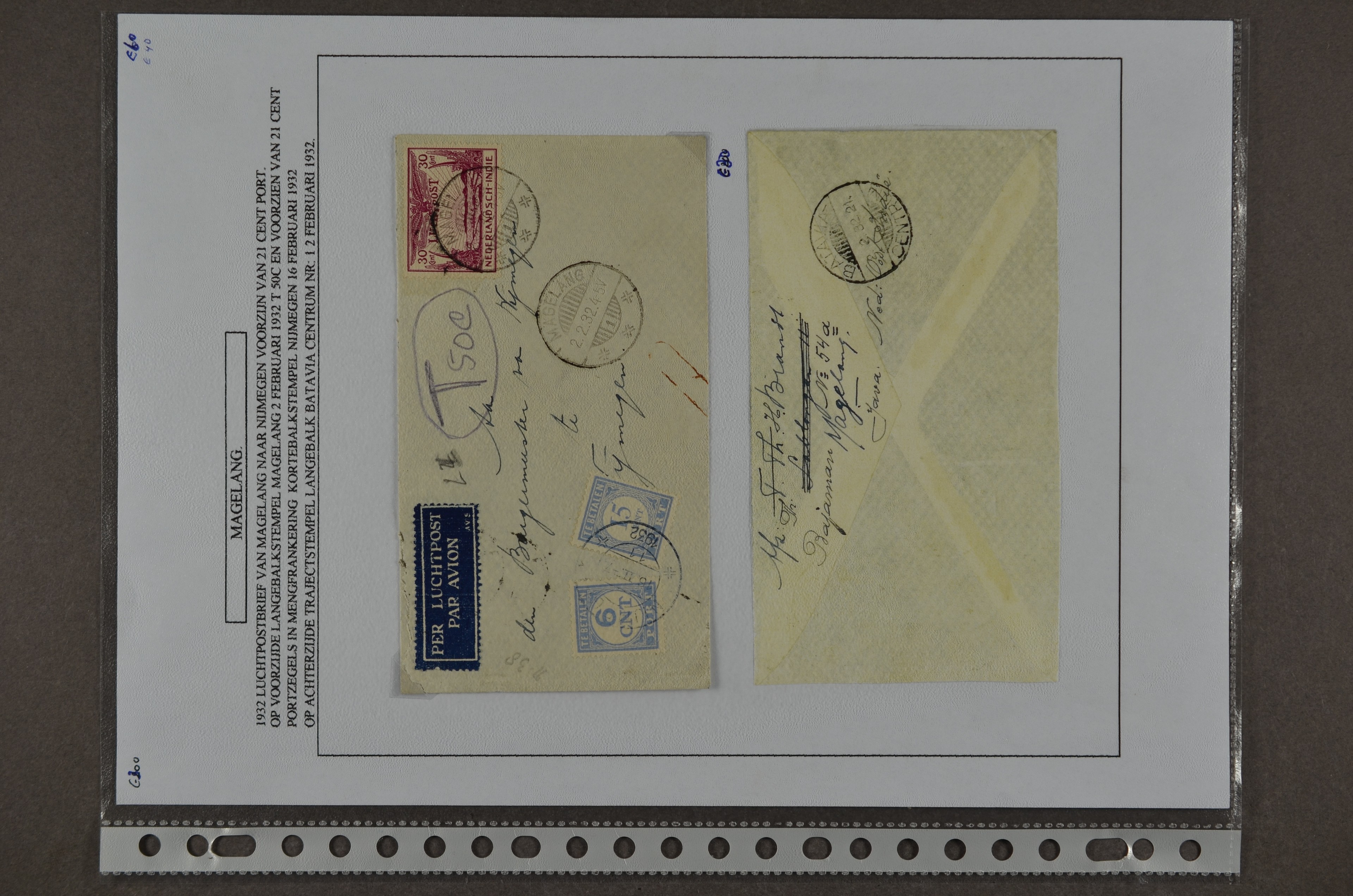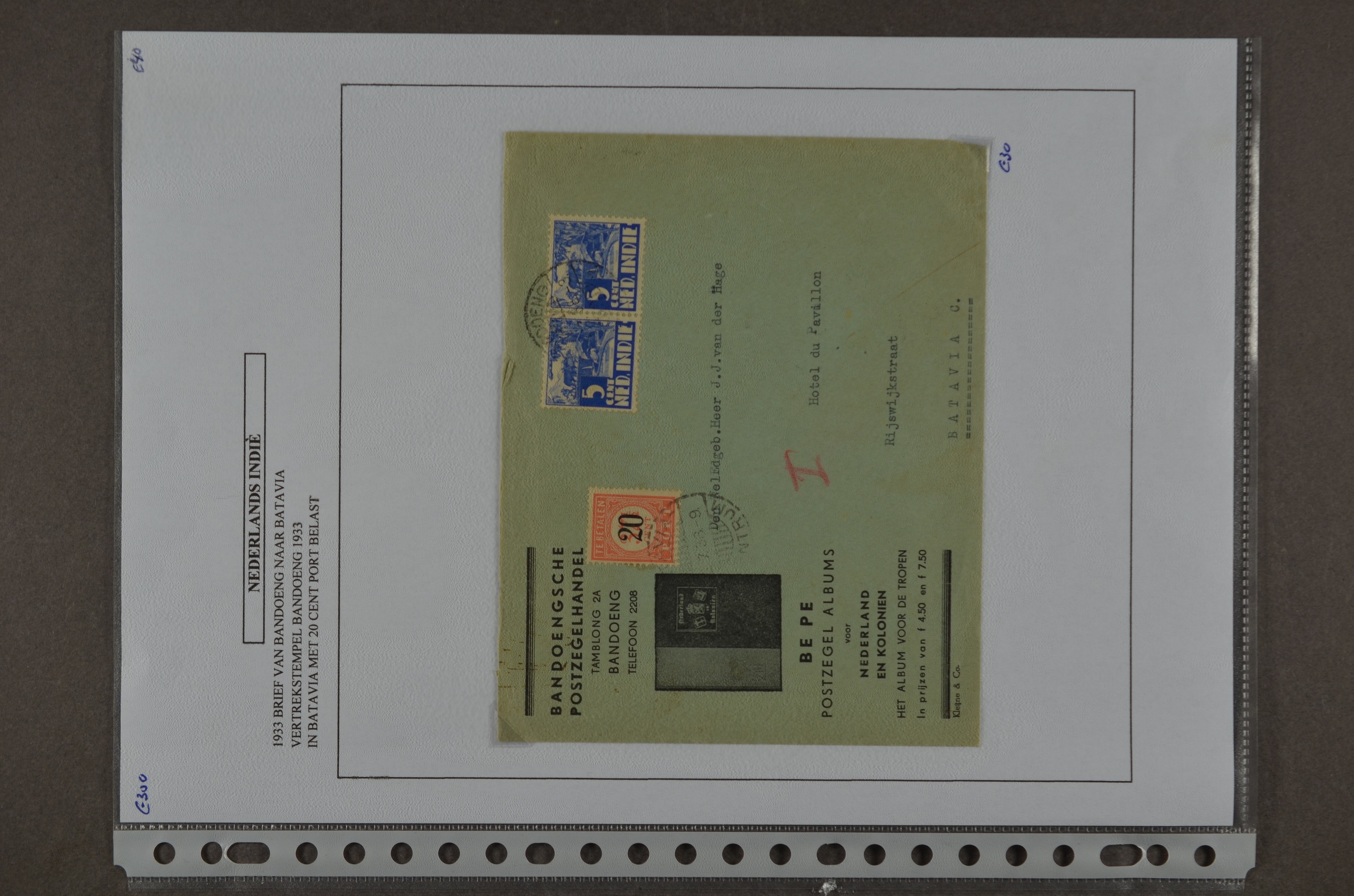 NED.- INDIË POSTHISTORIE, 32 behoorlijk betere poststukken 1890-1949 w.o. stempels, (enkel)frankeringen, beport, luchtpost, aangetekend, geadviseerd, Royal Neth. Indies Army/Concession Rate (rood en violet, 1945), Hollandia Bu.Y, etc. opgezet op bladen in ringband