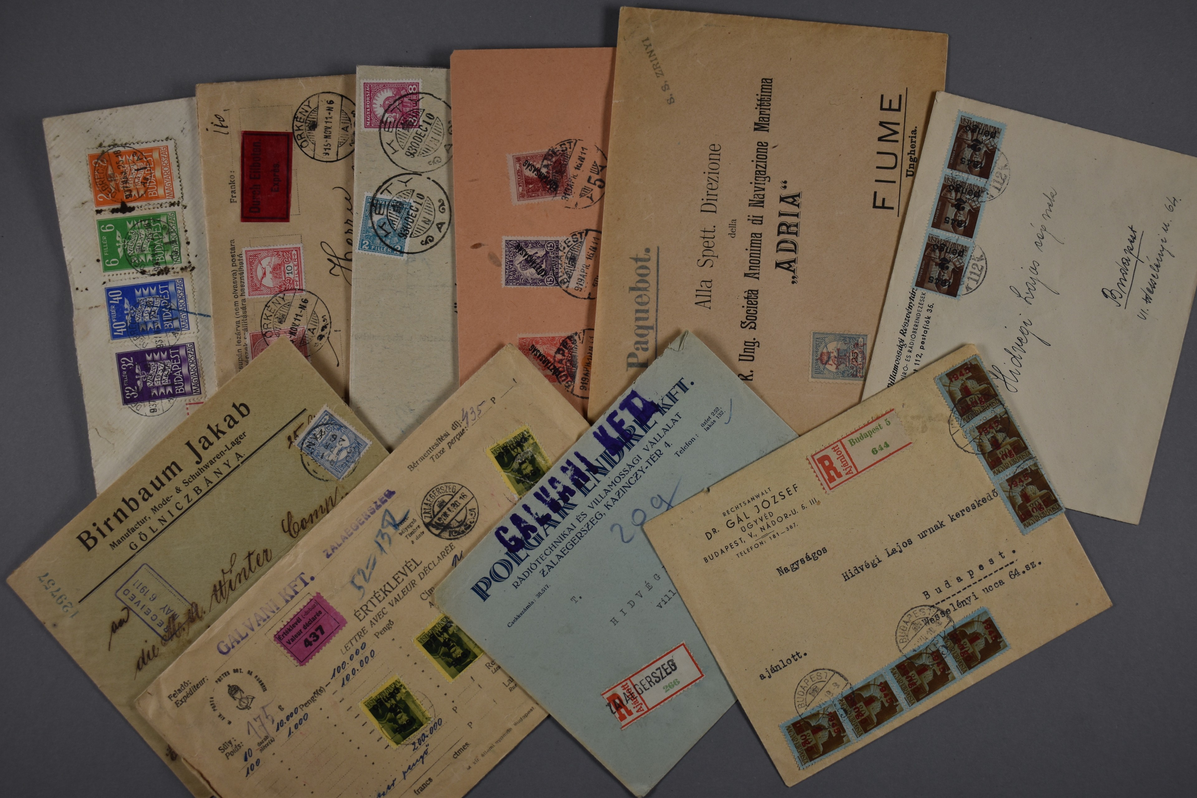 HUNGARY POSTAL HISTORY, over 650 postal entires sent before 1950 with (single) frankings including interesting covers from the hyperinflation period, stamps with perfins, machine frankings, an interesting and wide variety of postmarks, registered, express delivery, declared value, international money orders and other forms, inconnu, (unused) postal stationery, postage due, censorship, wonderful illustrated commercial envelopes, and so on. Very pleasant sorting out job for helping you through the long winter months!