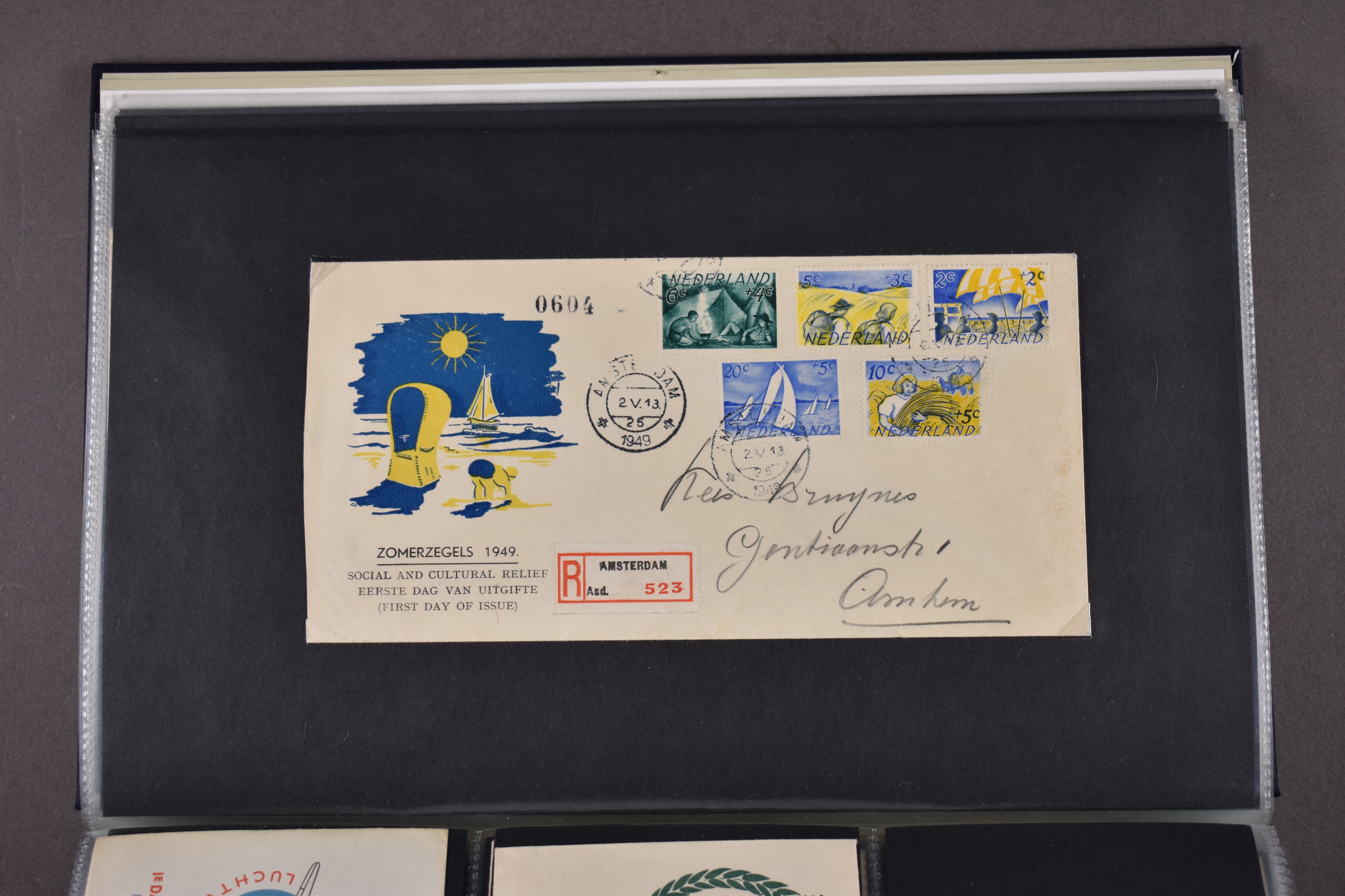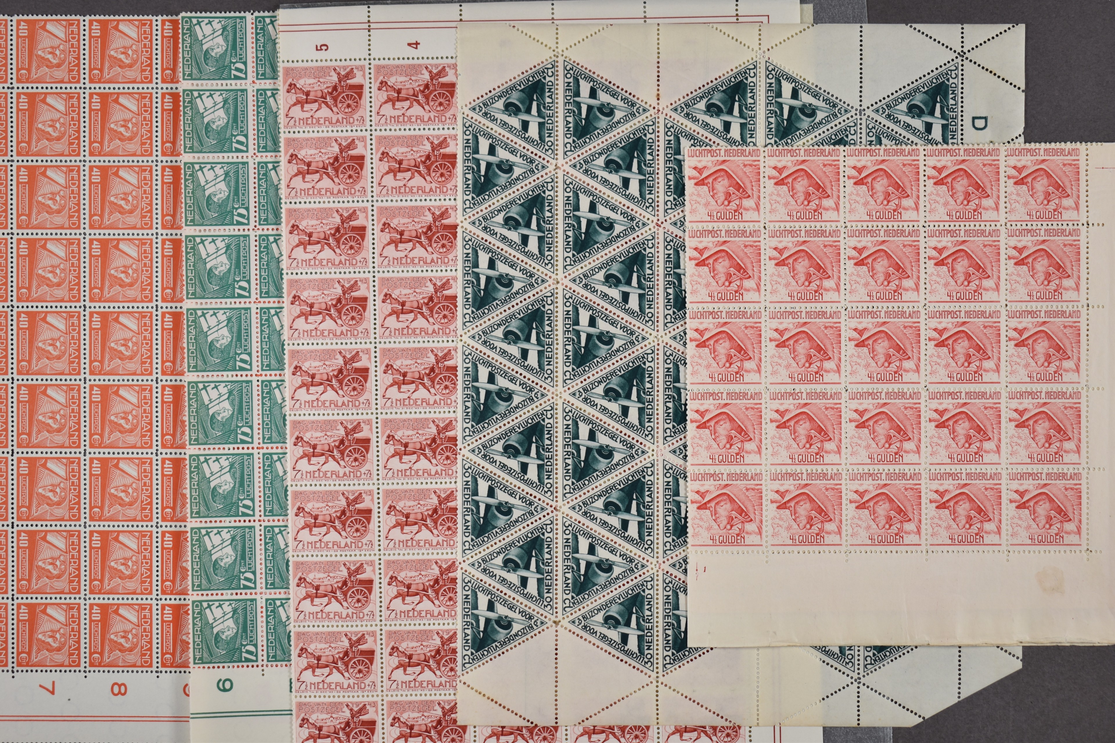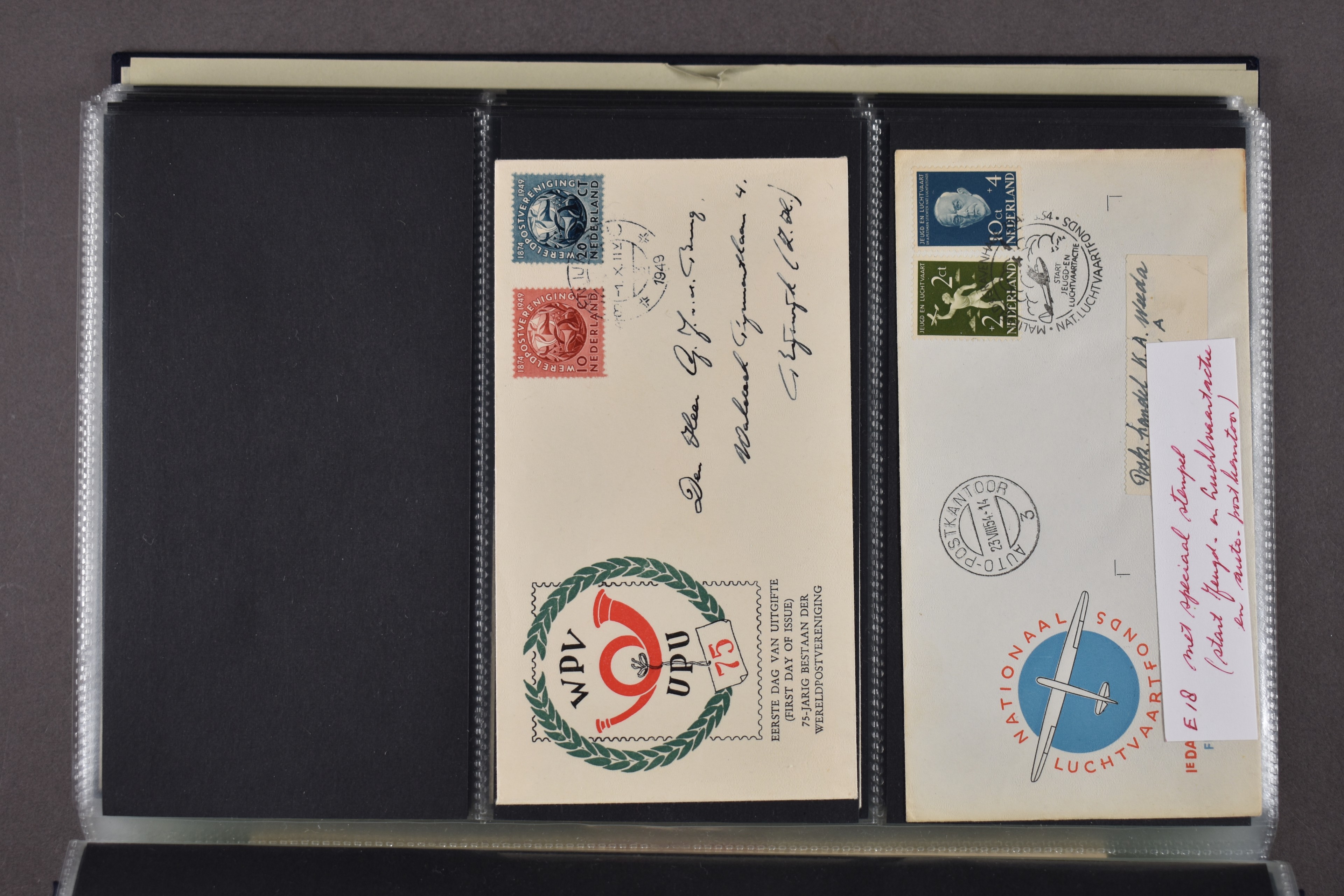 NEDERLAND, diversen waarbij Fdc's in 2 albums met voorlopers en eerste vluchten, blokken van vier, vellen, iets buitenland, etc., etc.