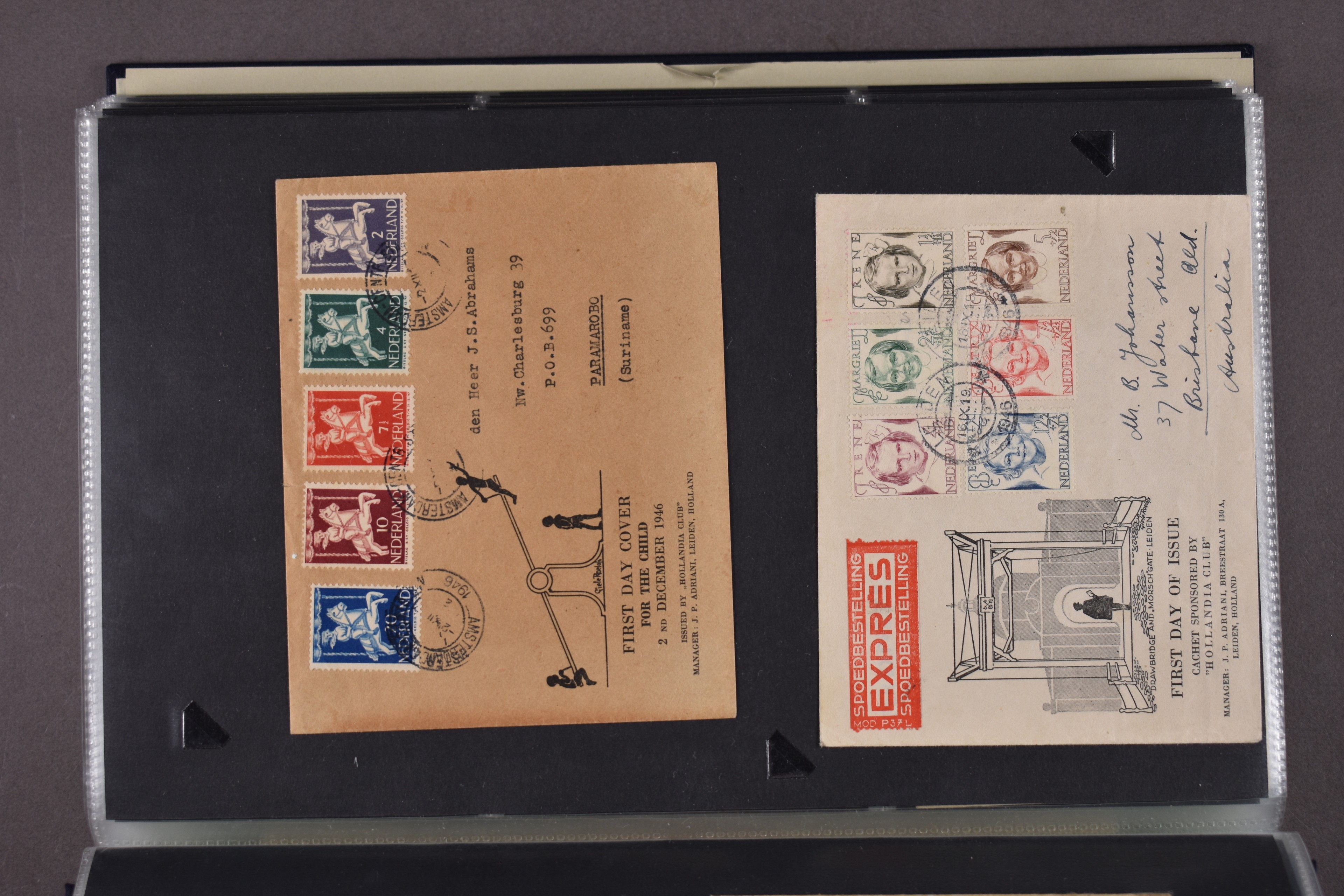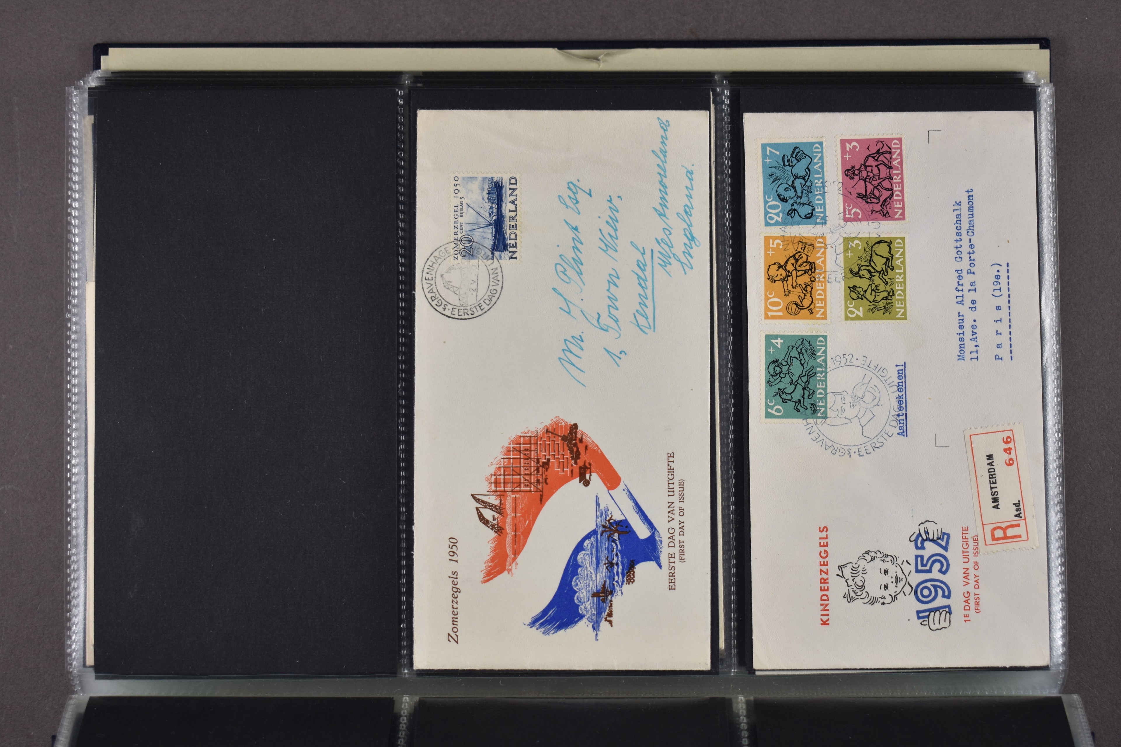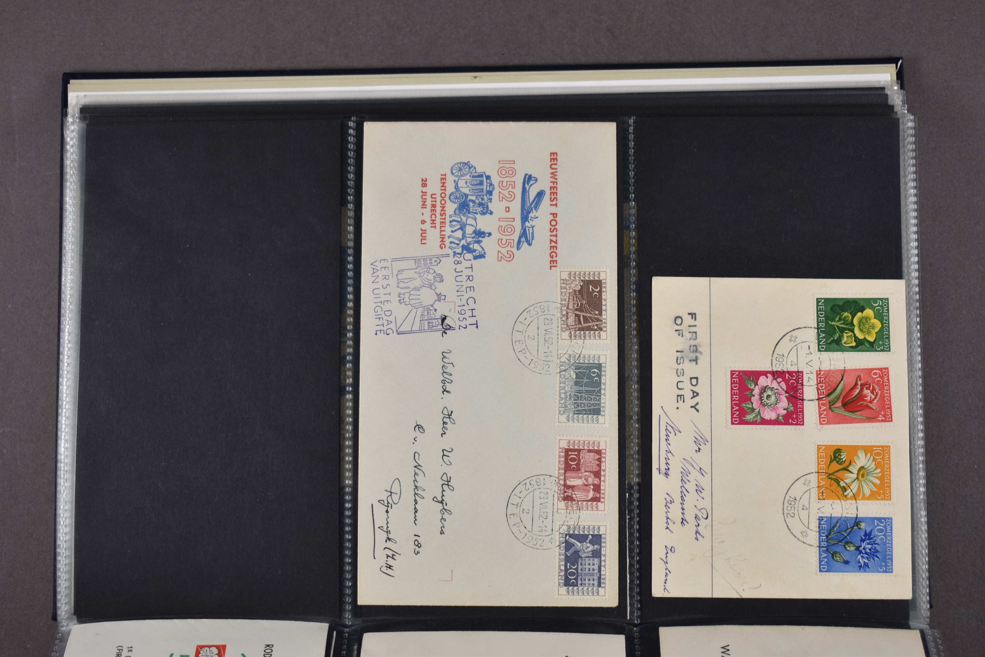 NEDERLAND, diversen waarbij Fdc's in 2 albums met voorlopers en eerste vluchten, blokken van vier, vellen, iets buitenland, etc., etc.