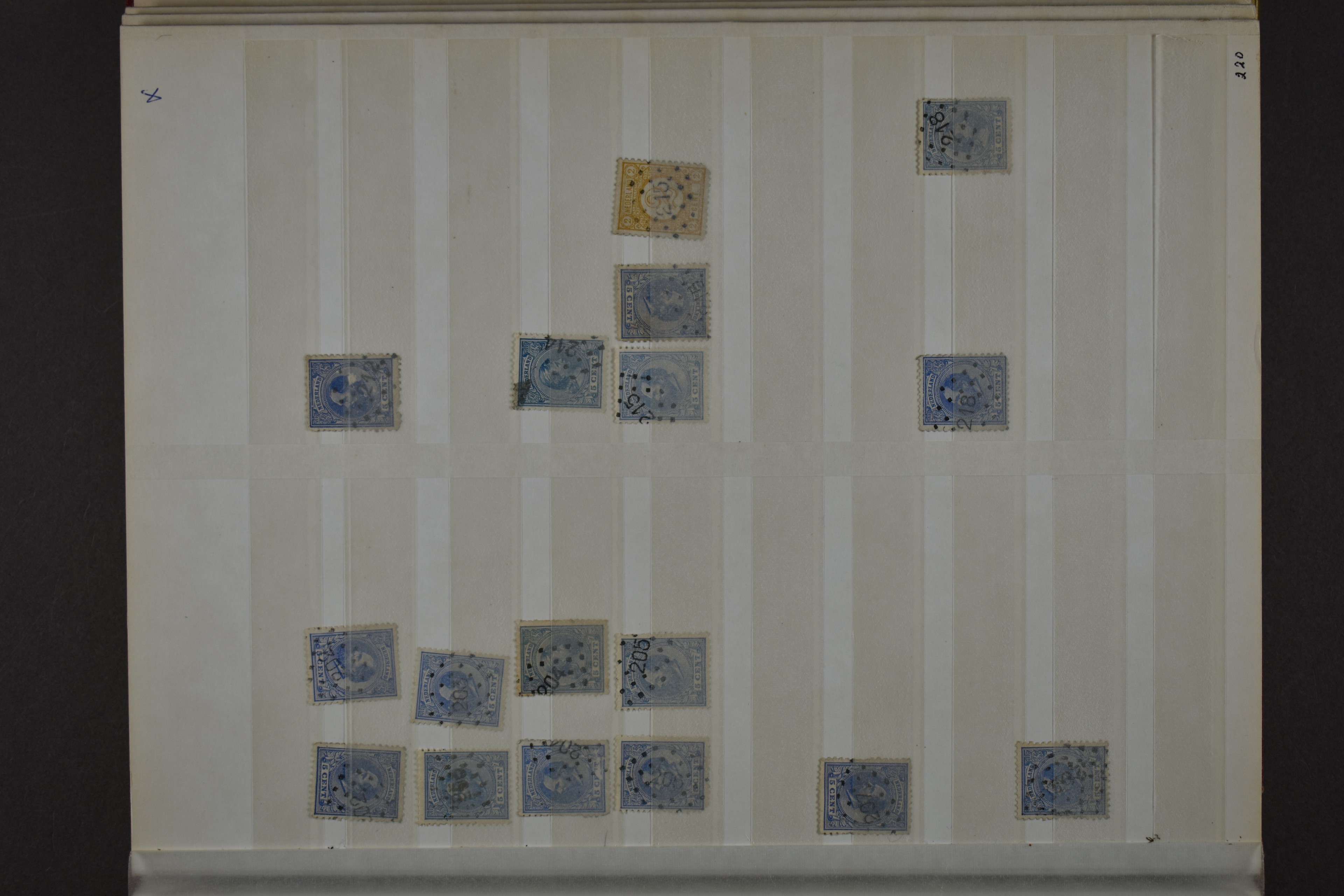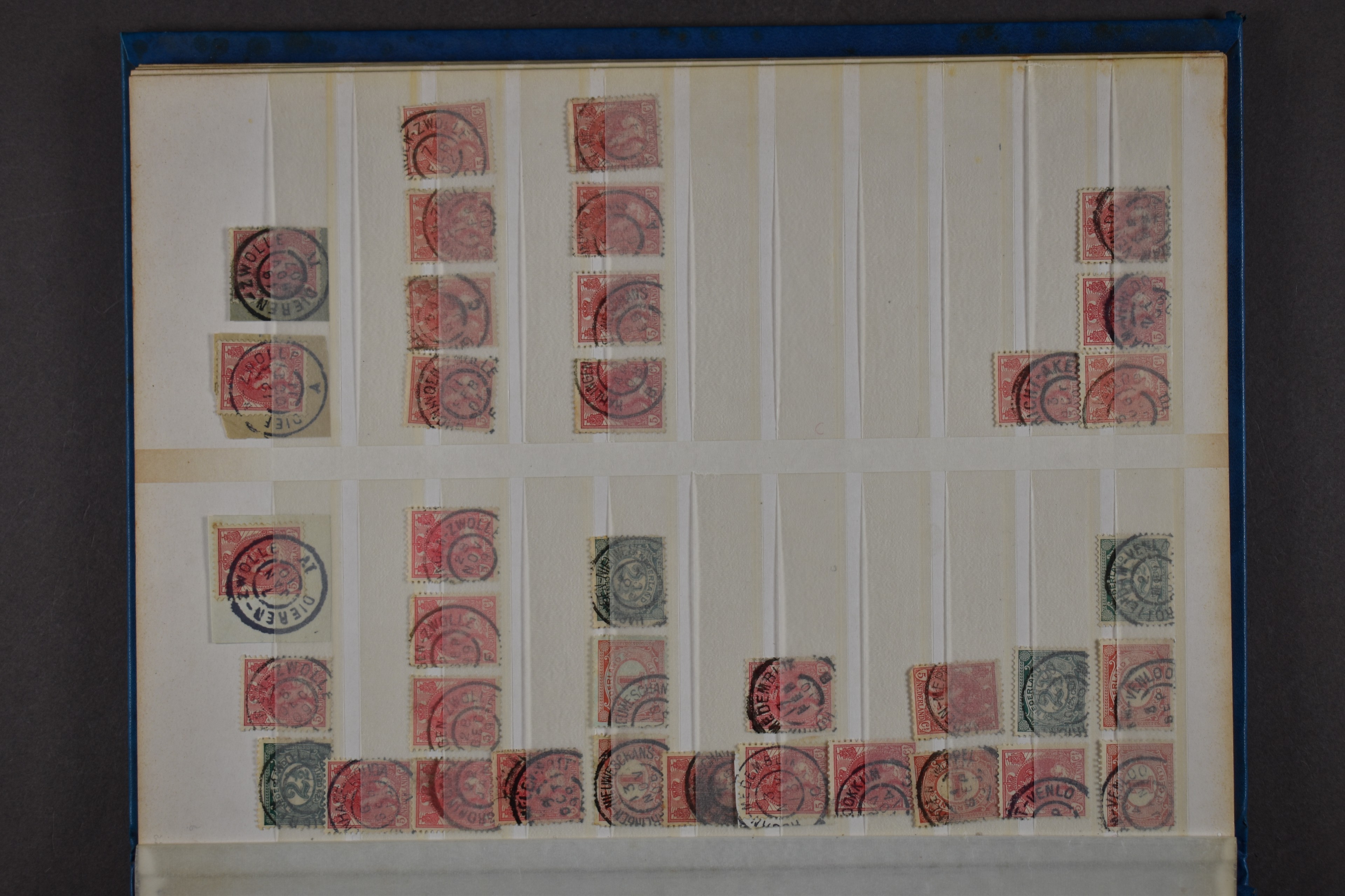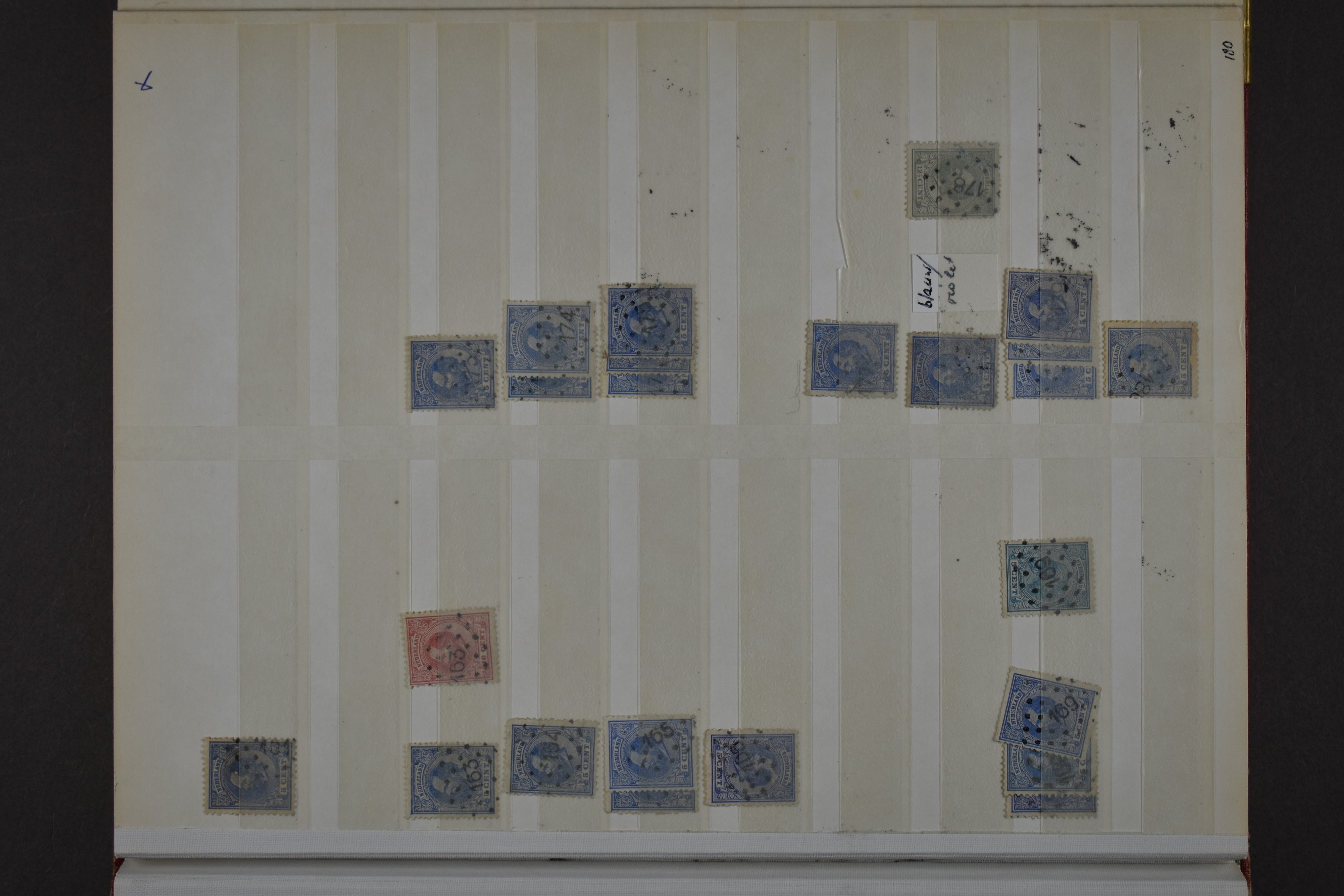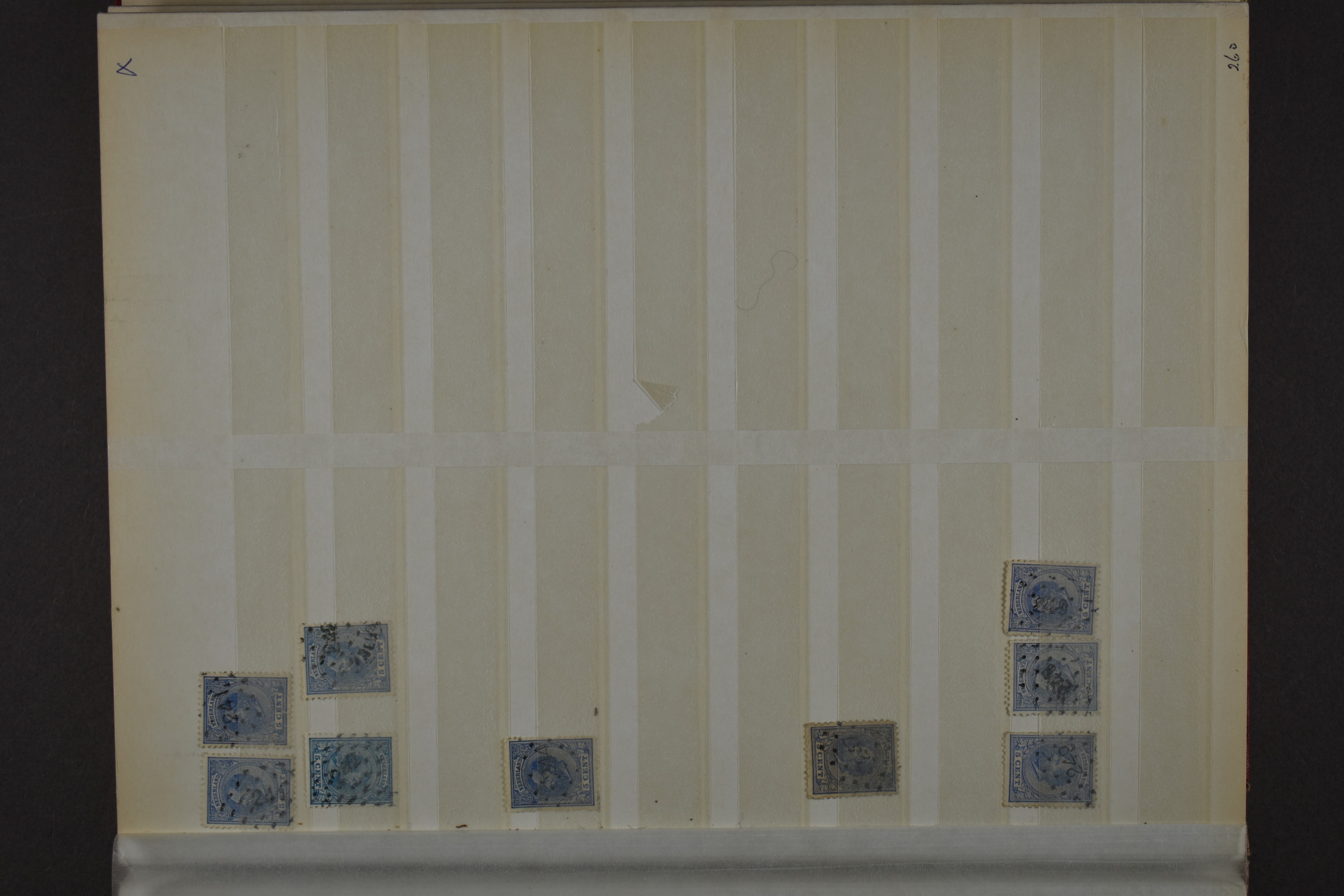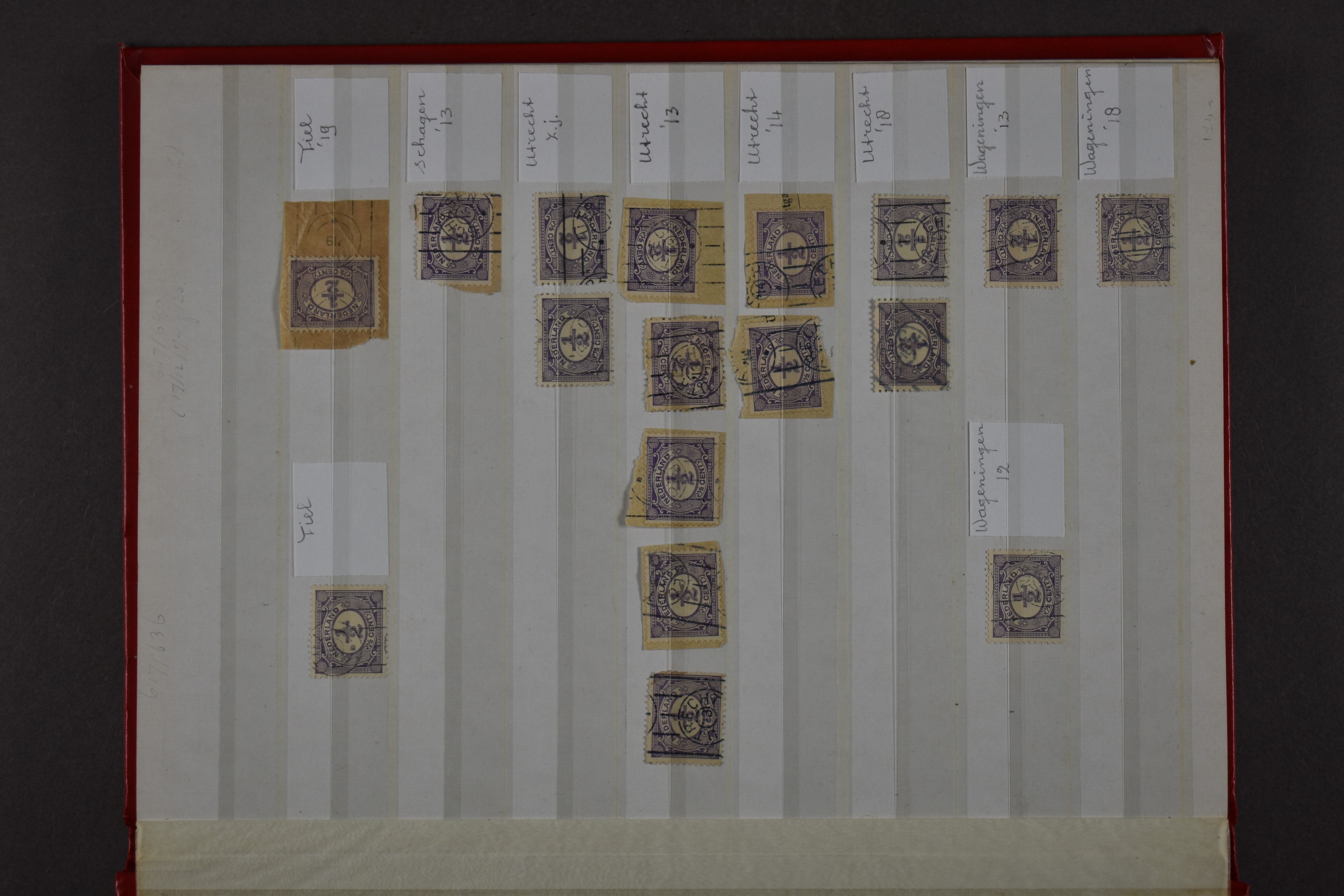 NEDERLAND, collectie afstempelingen in 12 insteekboeken waarbij punt-, kleinrond-, grootrond,- lange- en kortebalk- en drukwerkrolstempels, tevens insteekboek Ned.-Indië afstempelingen en insteekboek plaatfouten