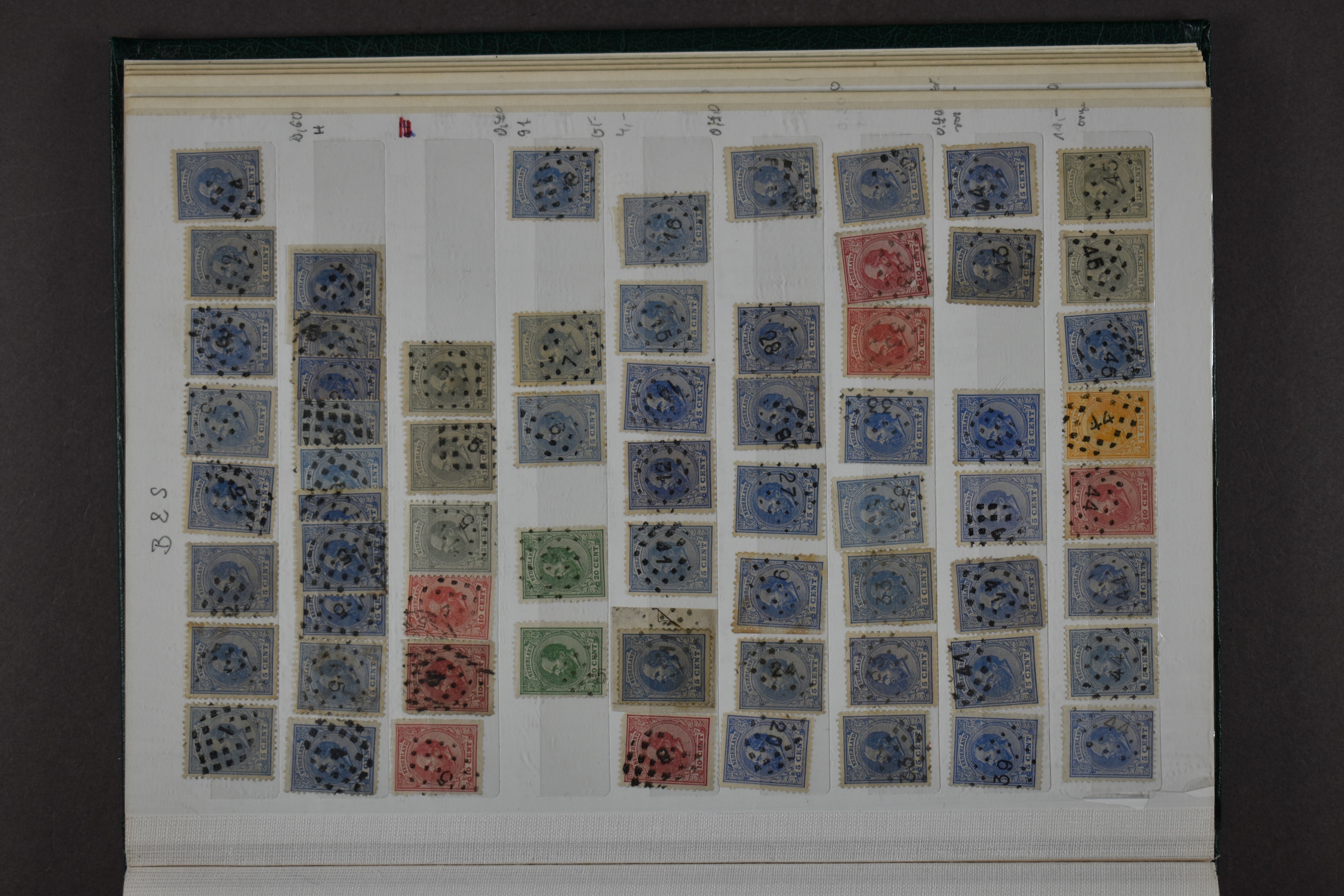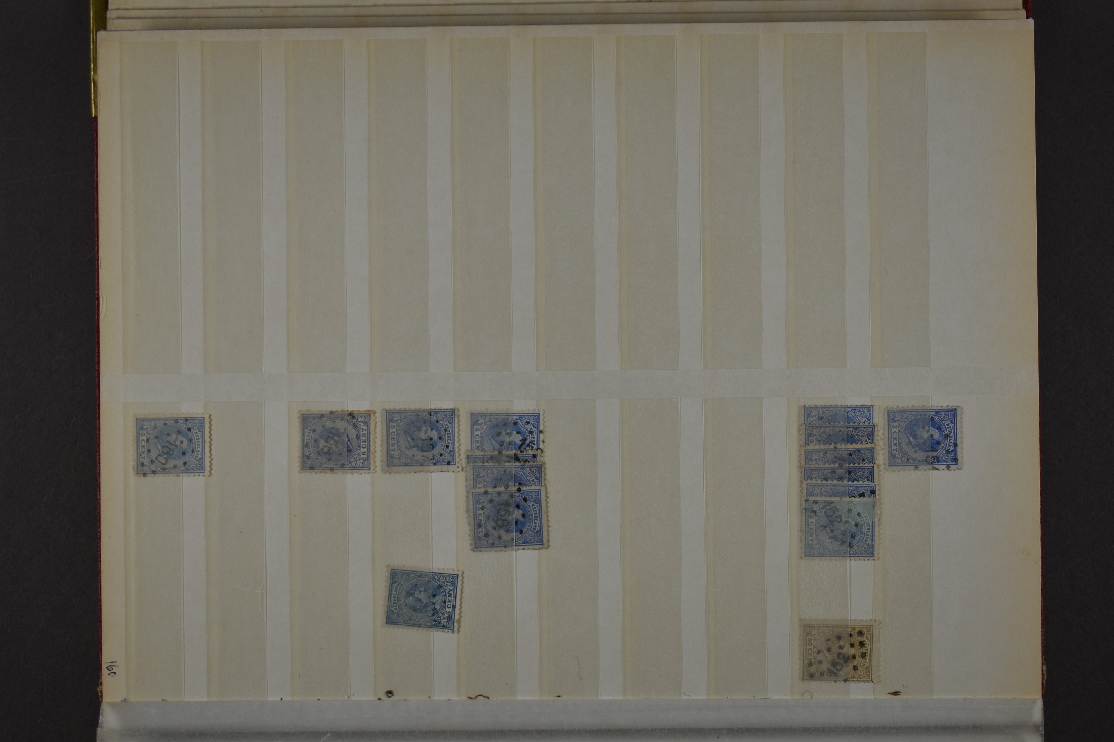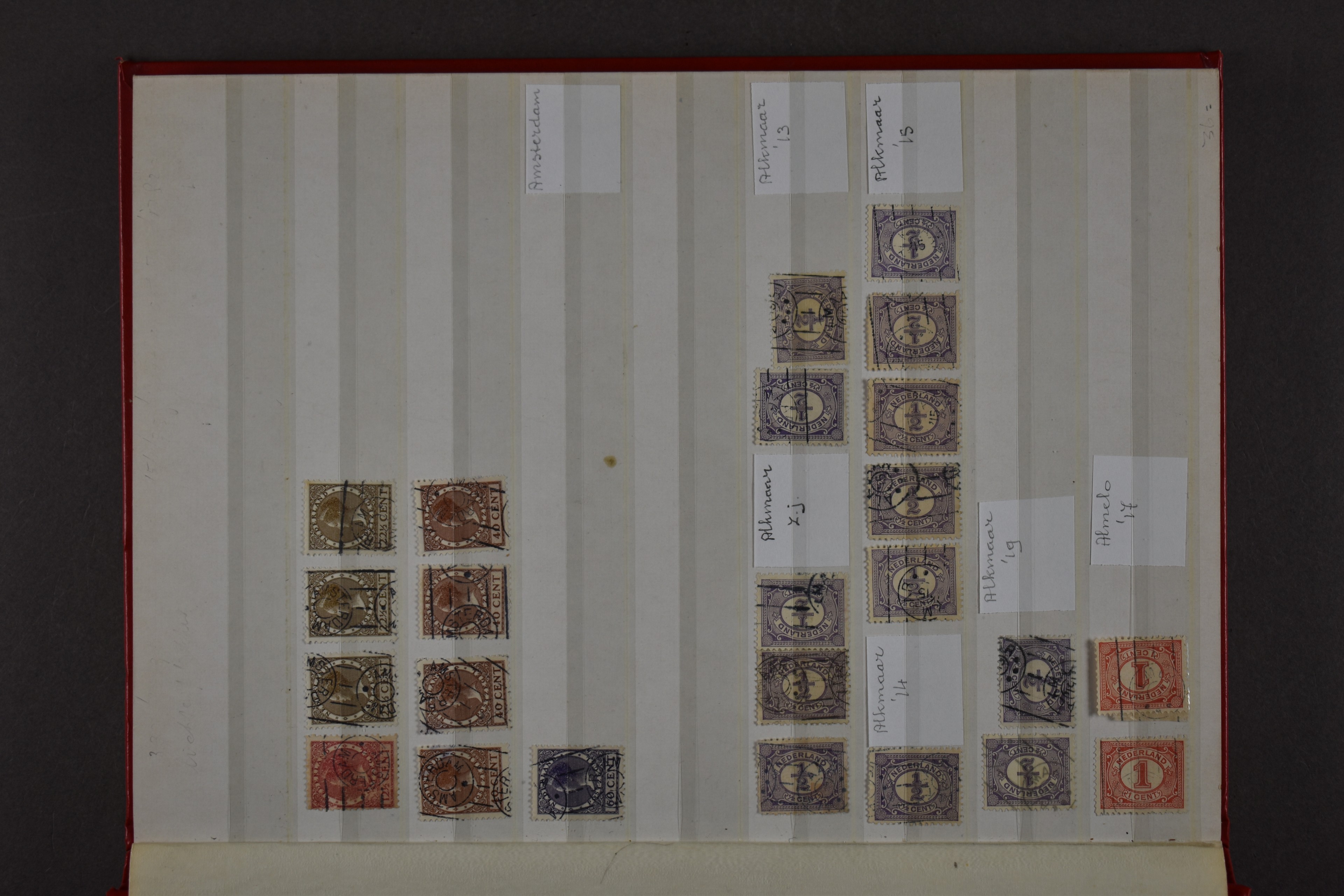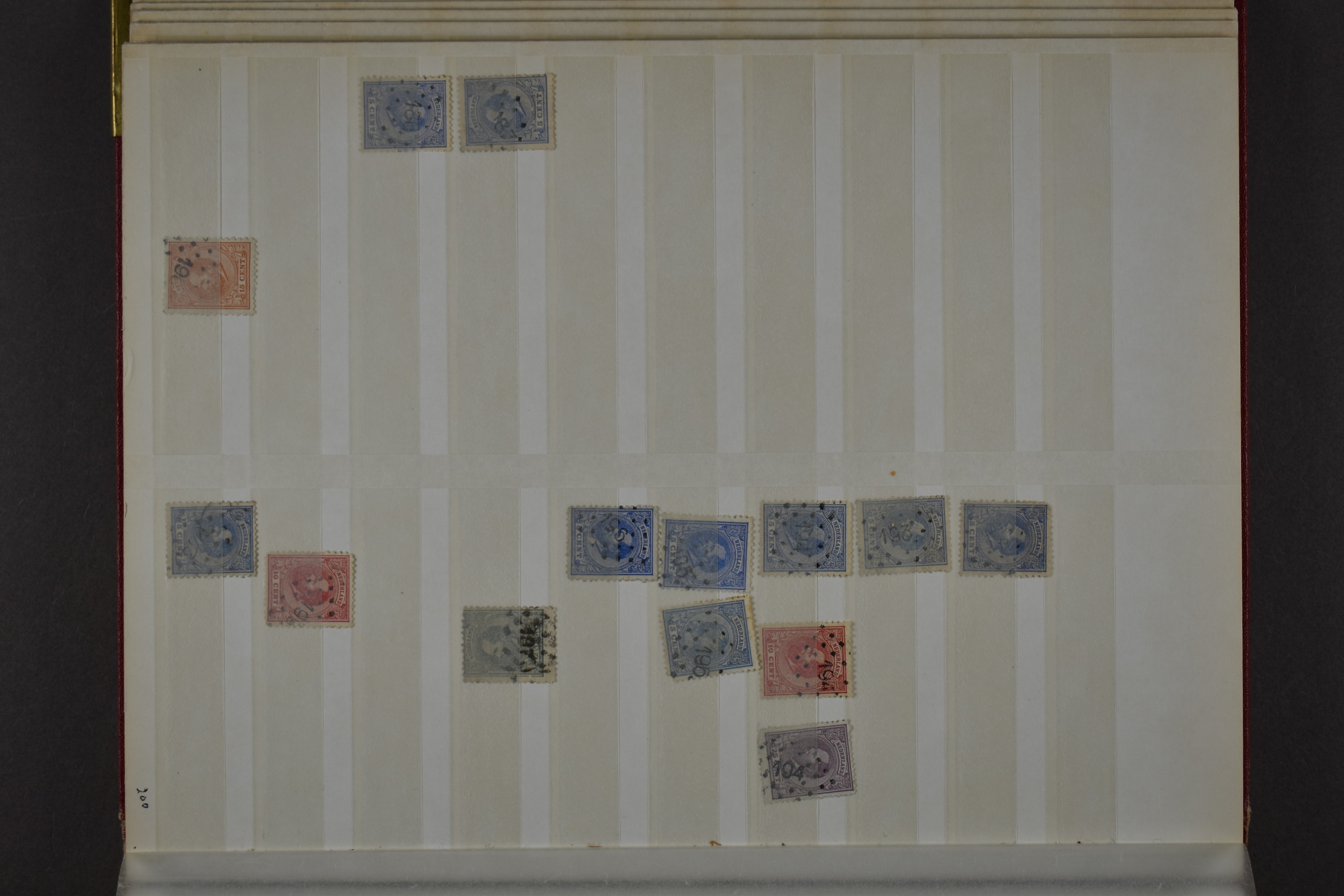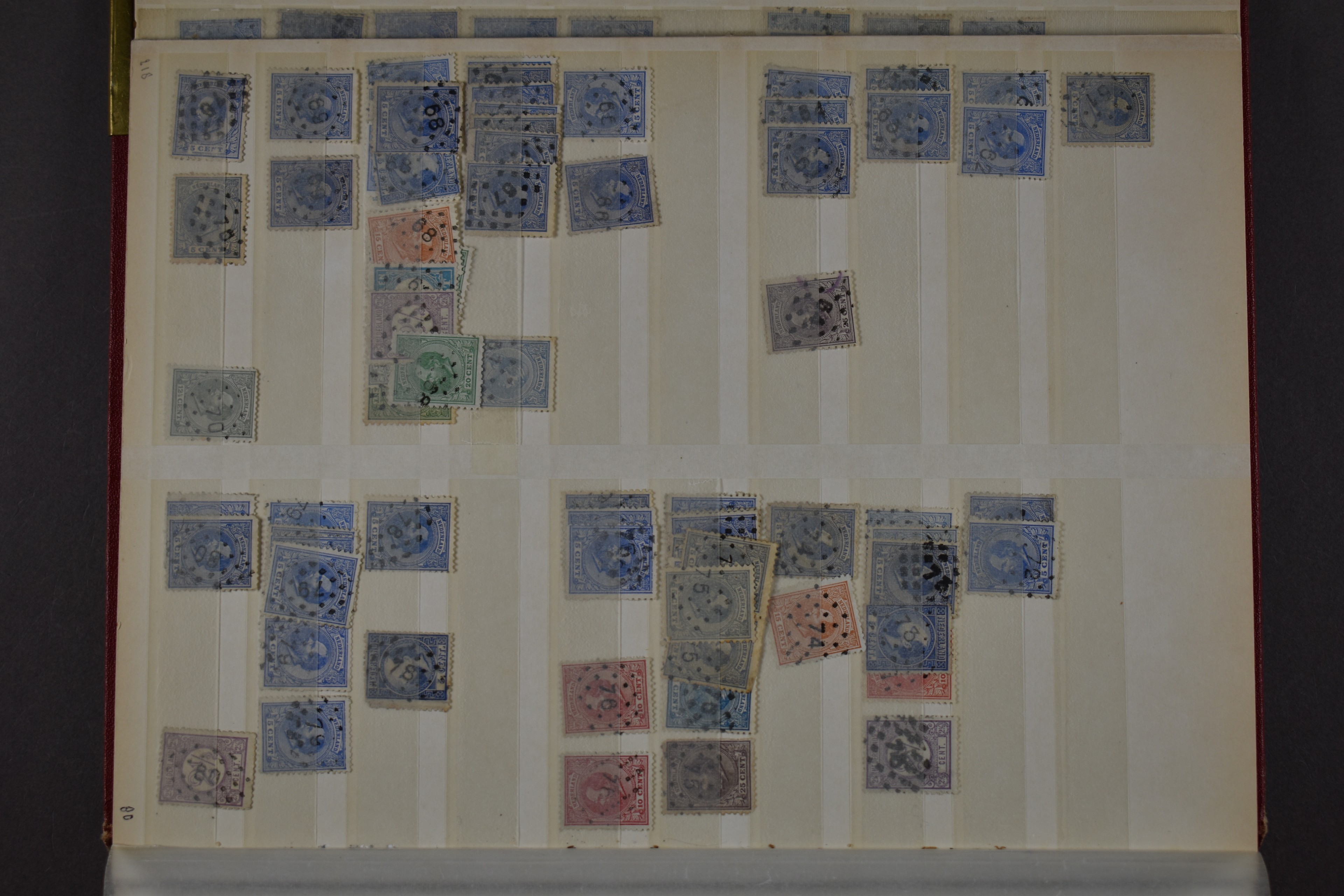 NEDERLAND, collectie afstempelingen in 12 insteekboeken waarbij punt-, kleinrond-, grootrond,- lange- en kortebalk- en drukwerkrolstempels, tevens insteekboek Ned.-Indië afstempelingen en insteekboek plaatfouten