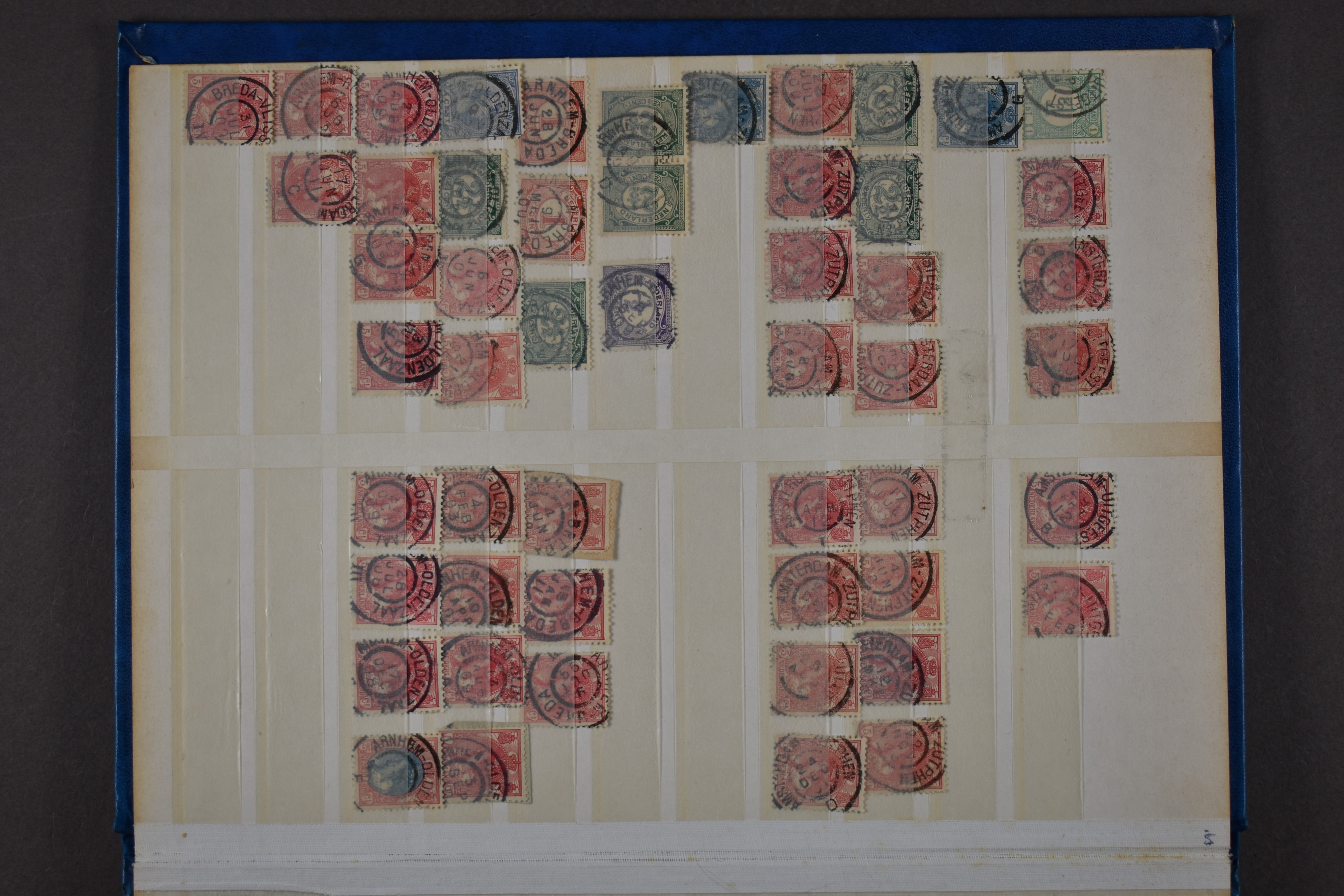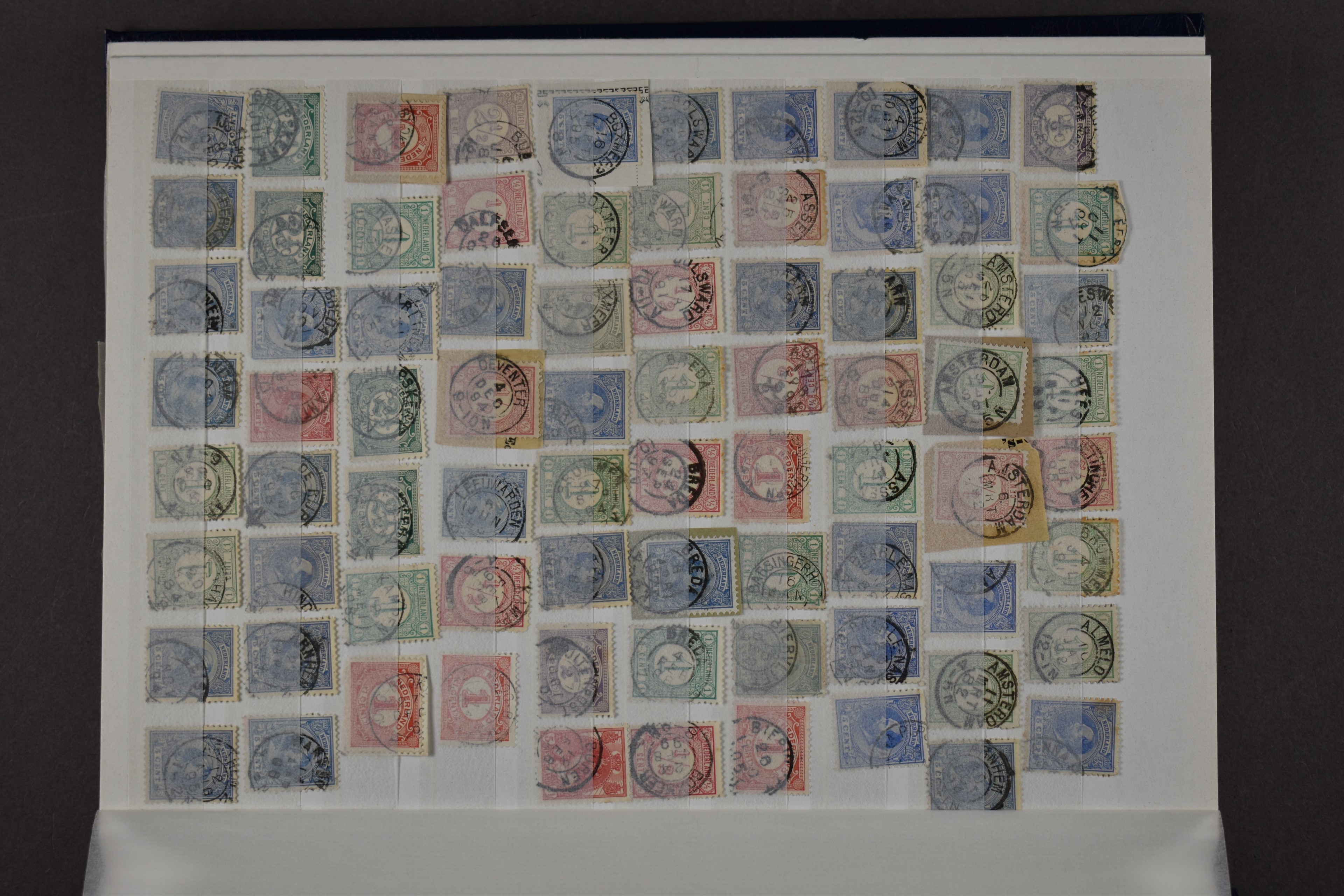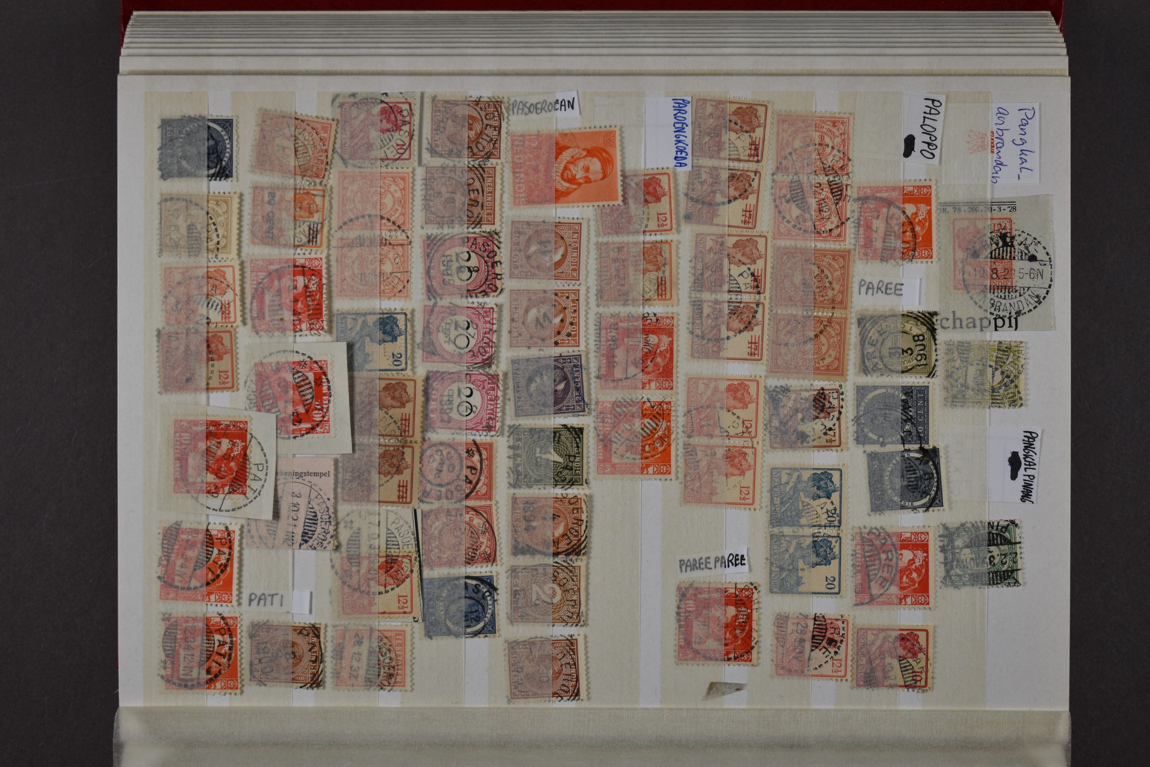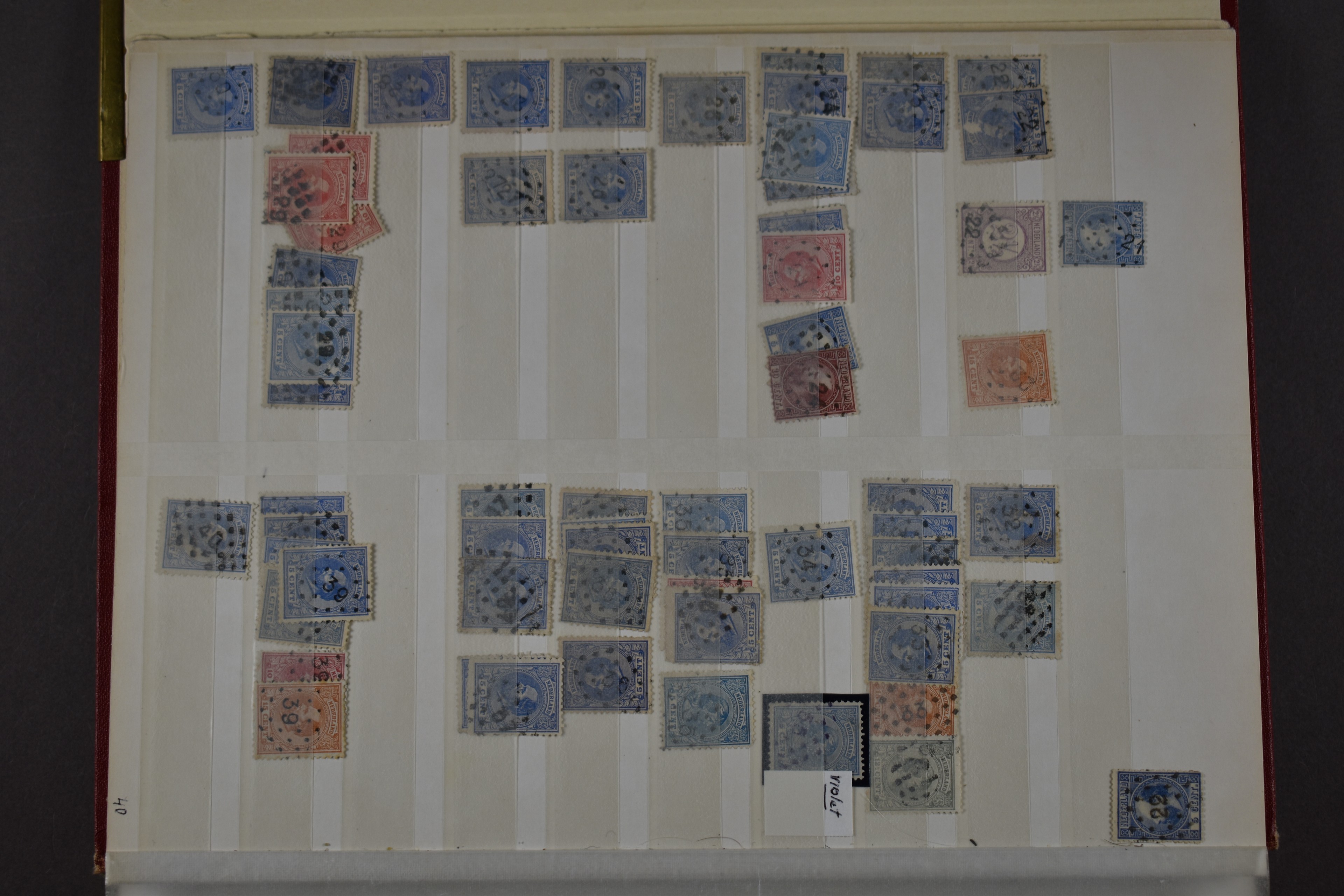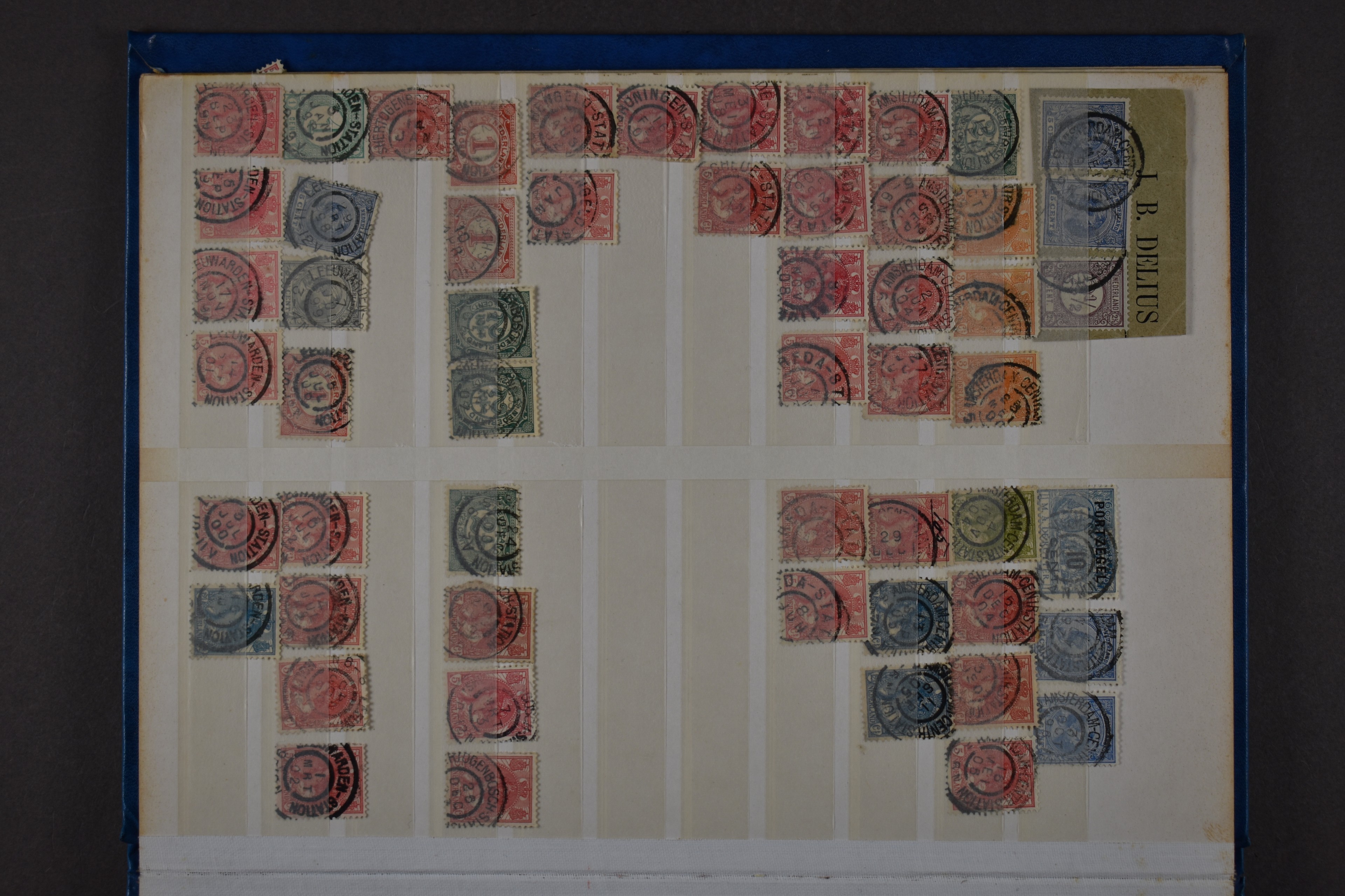 NEDERLAND, collectie afstempelingen in 12 insteekboeken waarbij punt-, kleinrond-, grootrond,- lange- en kortebalk- en drukwerkrolstempels, tevens insteekboek Ned.-Indië afstempelingen en insteekboek plaatfouten