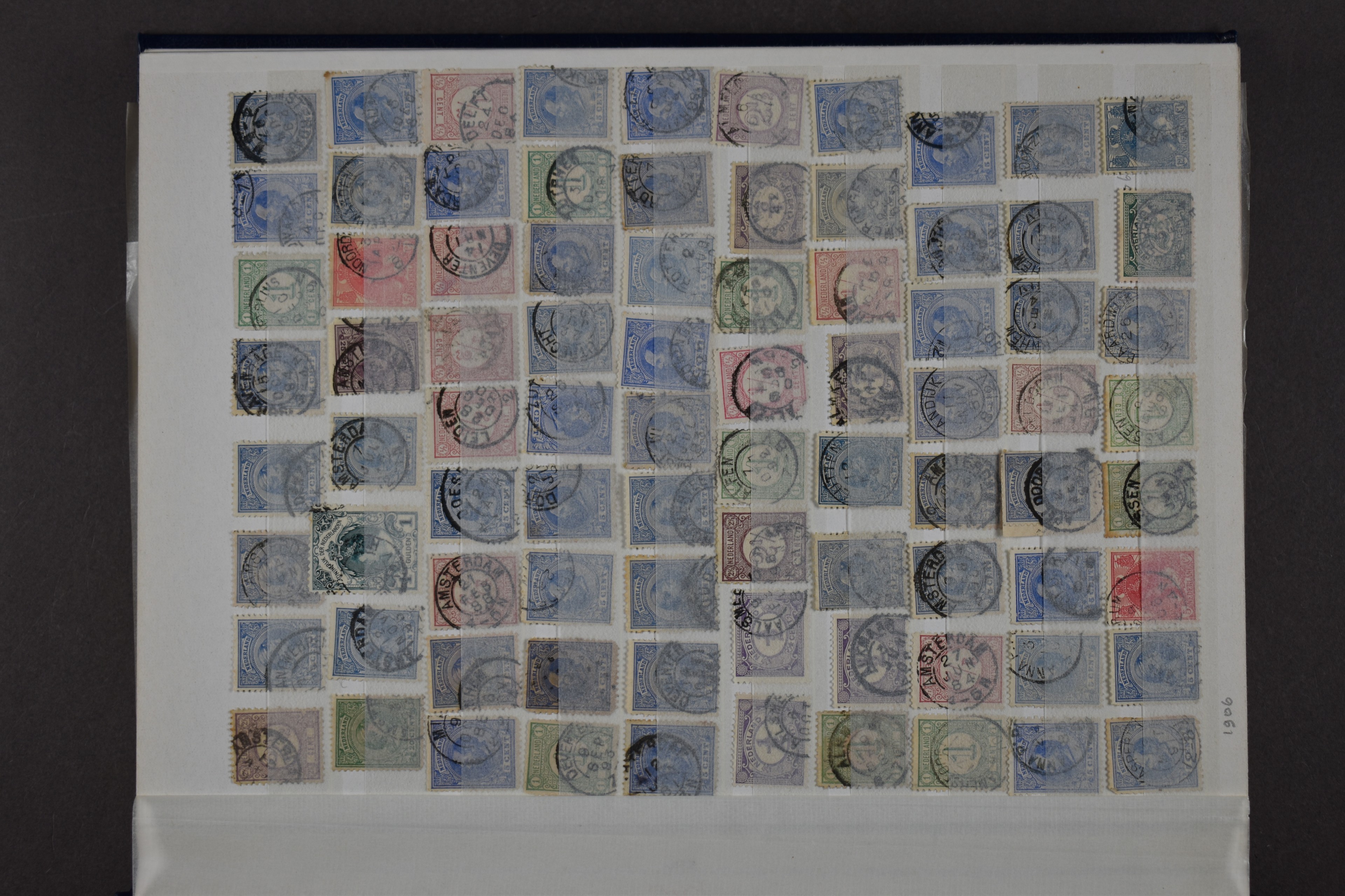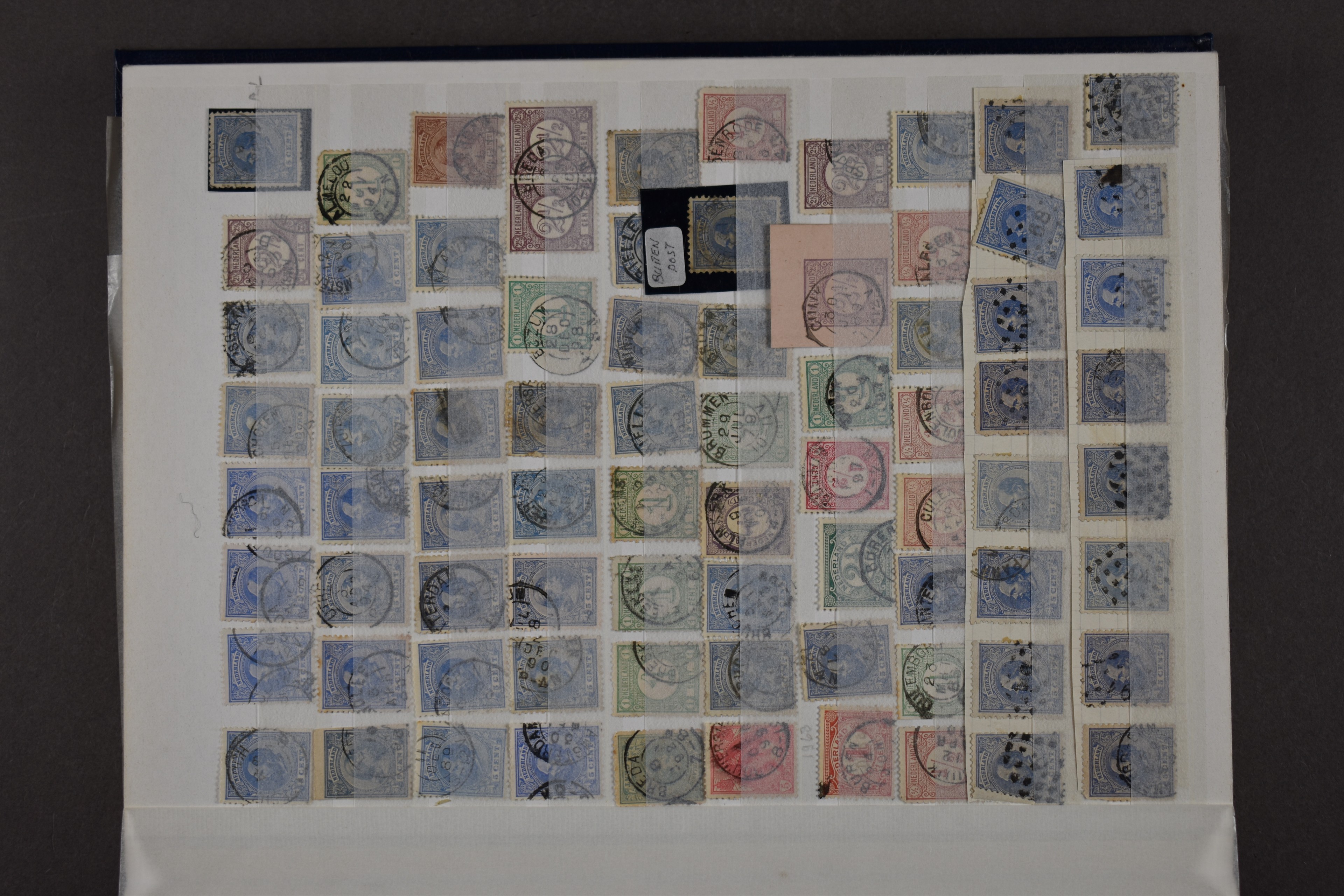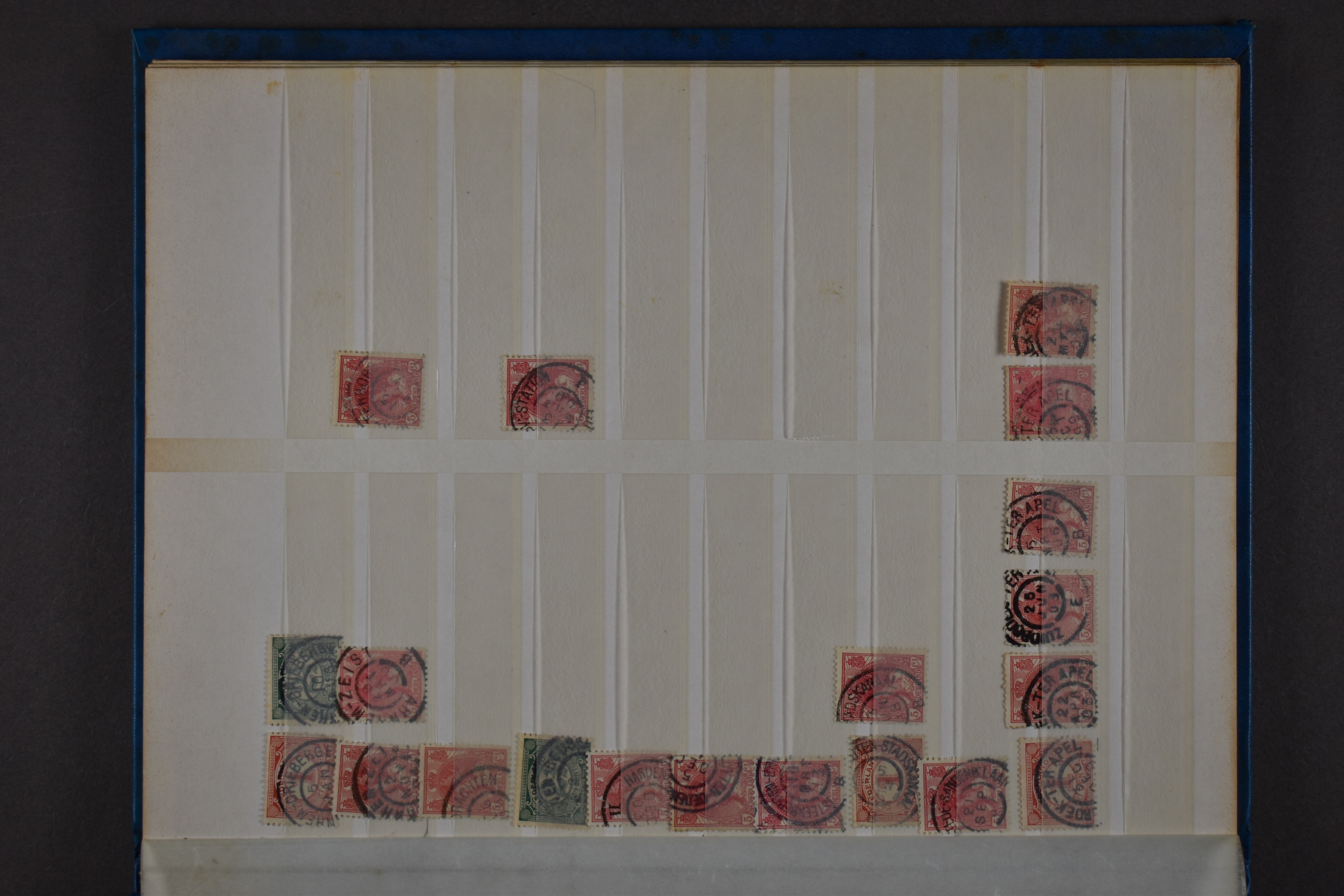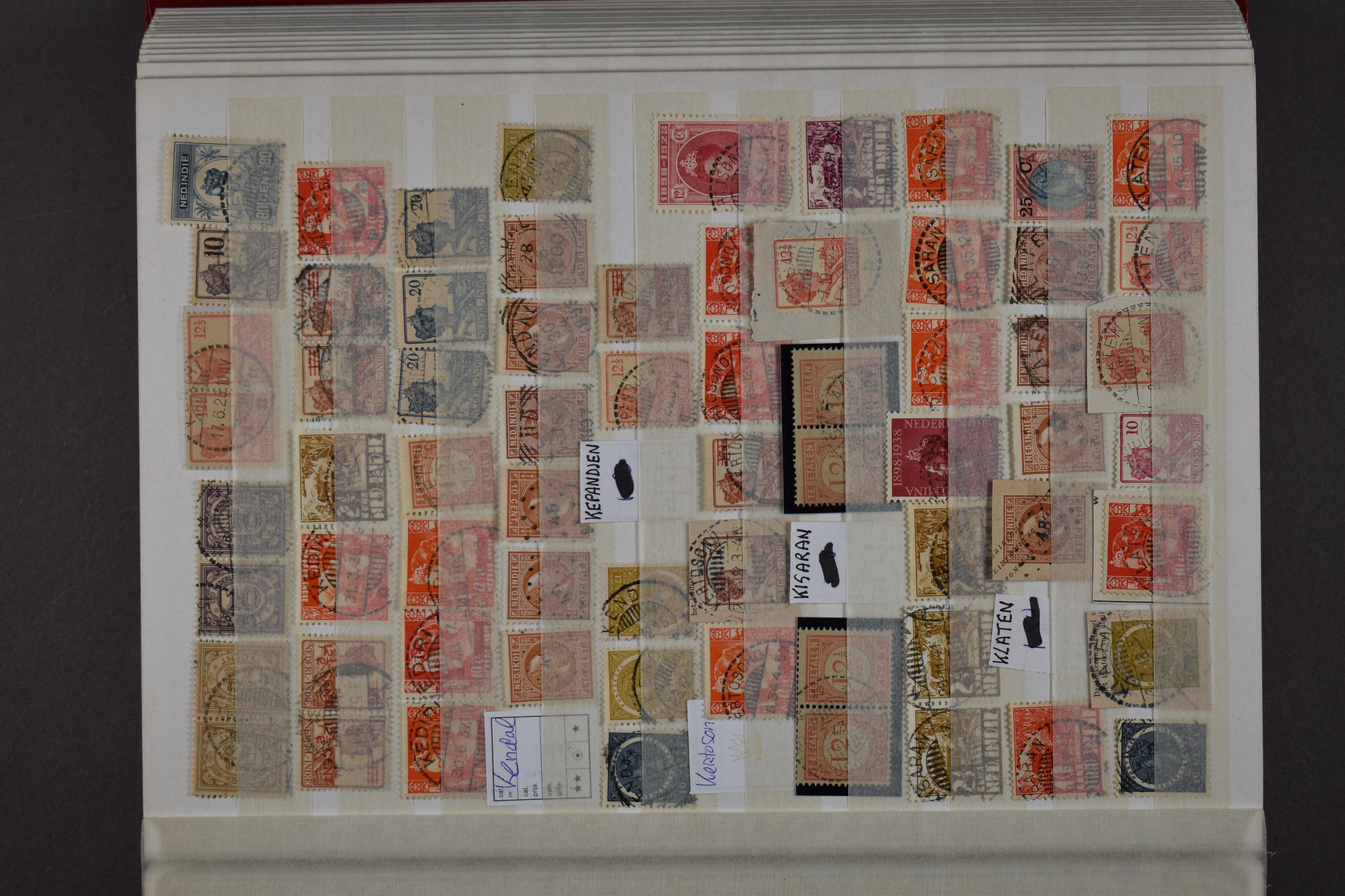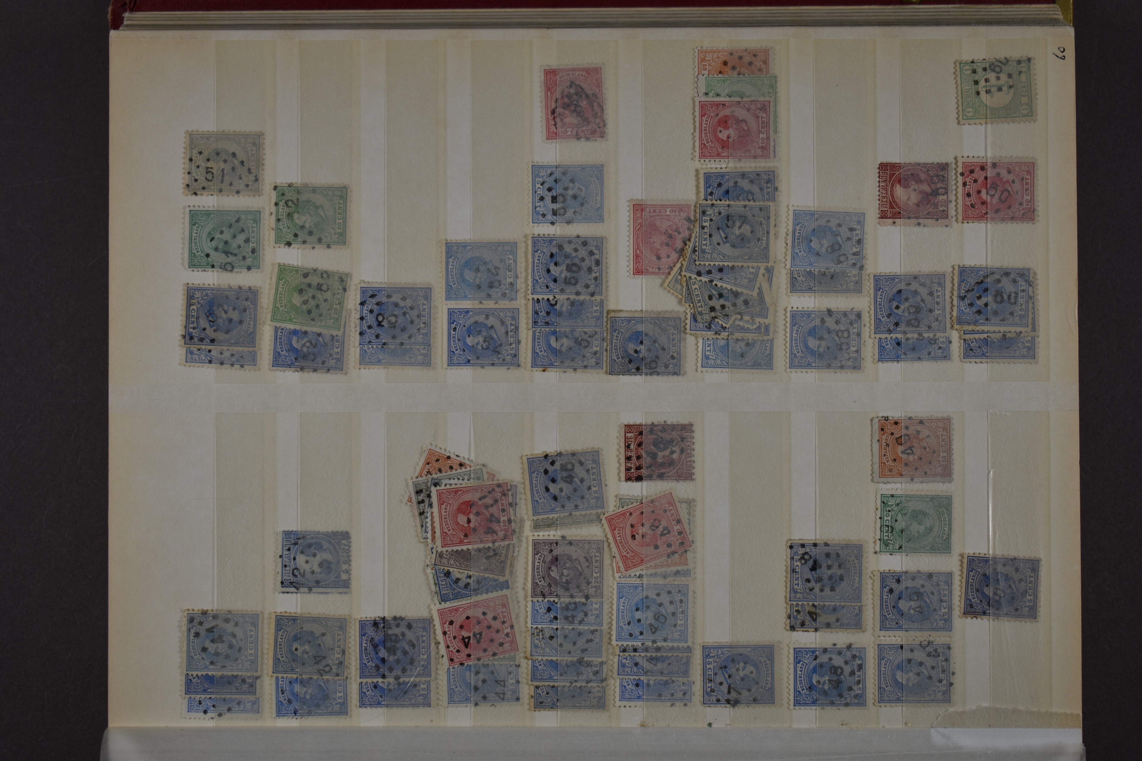 NEDERLAND, collectie afstempelingen in 12 insteekboeken waarbij punt-, kleinrond-, grootrond,- lange- en kortebalk- en drukwerkrolstempels, tevens insteekboek Ned.-Indië afstempelingen en insteekboek plaatfouten