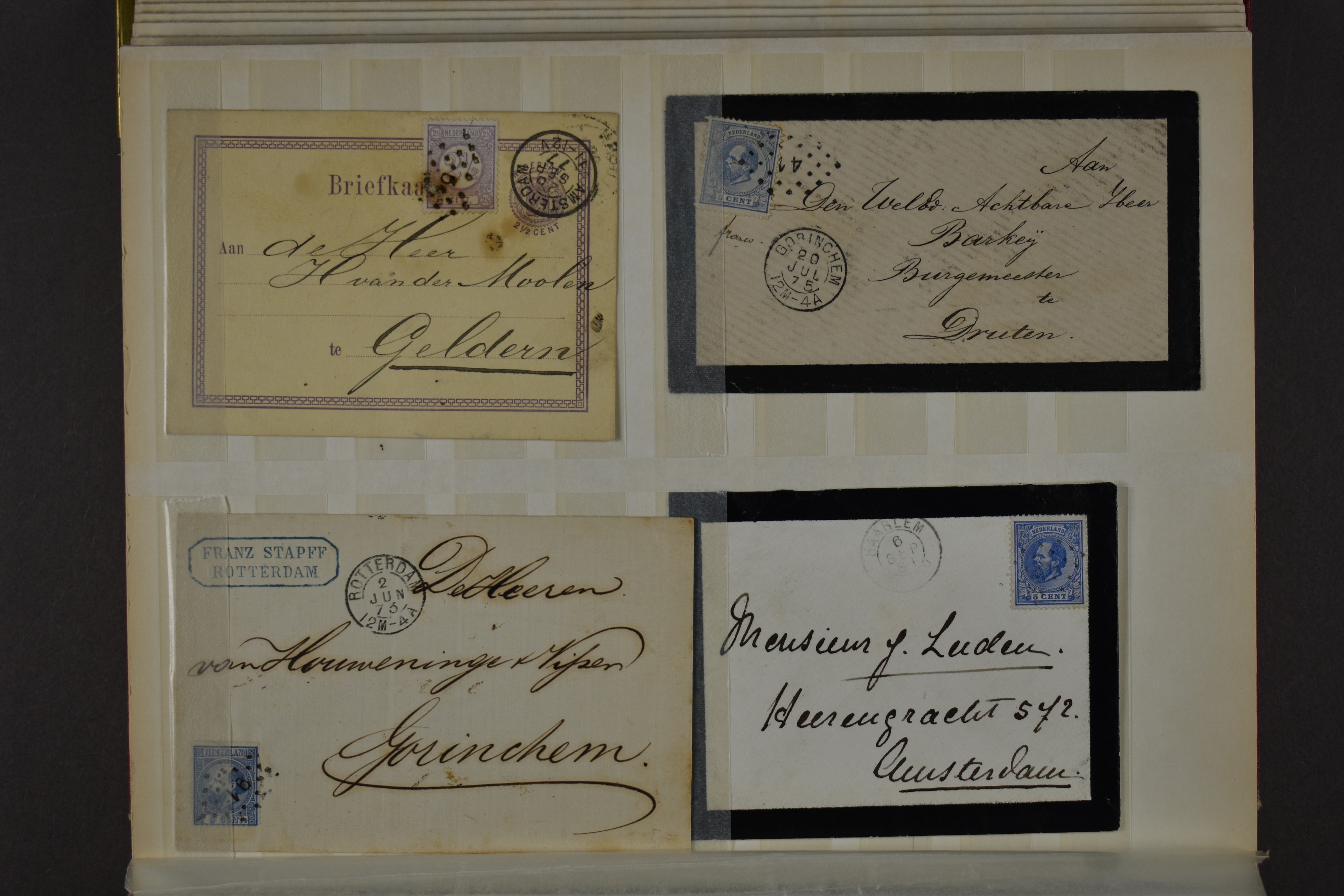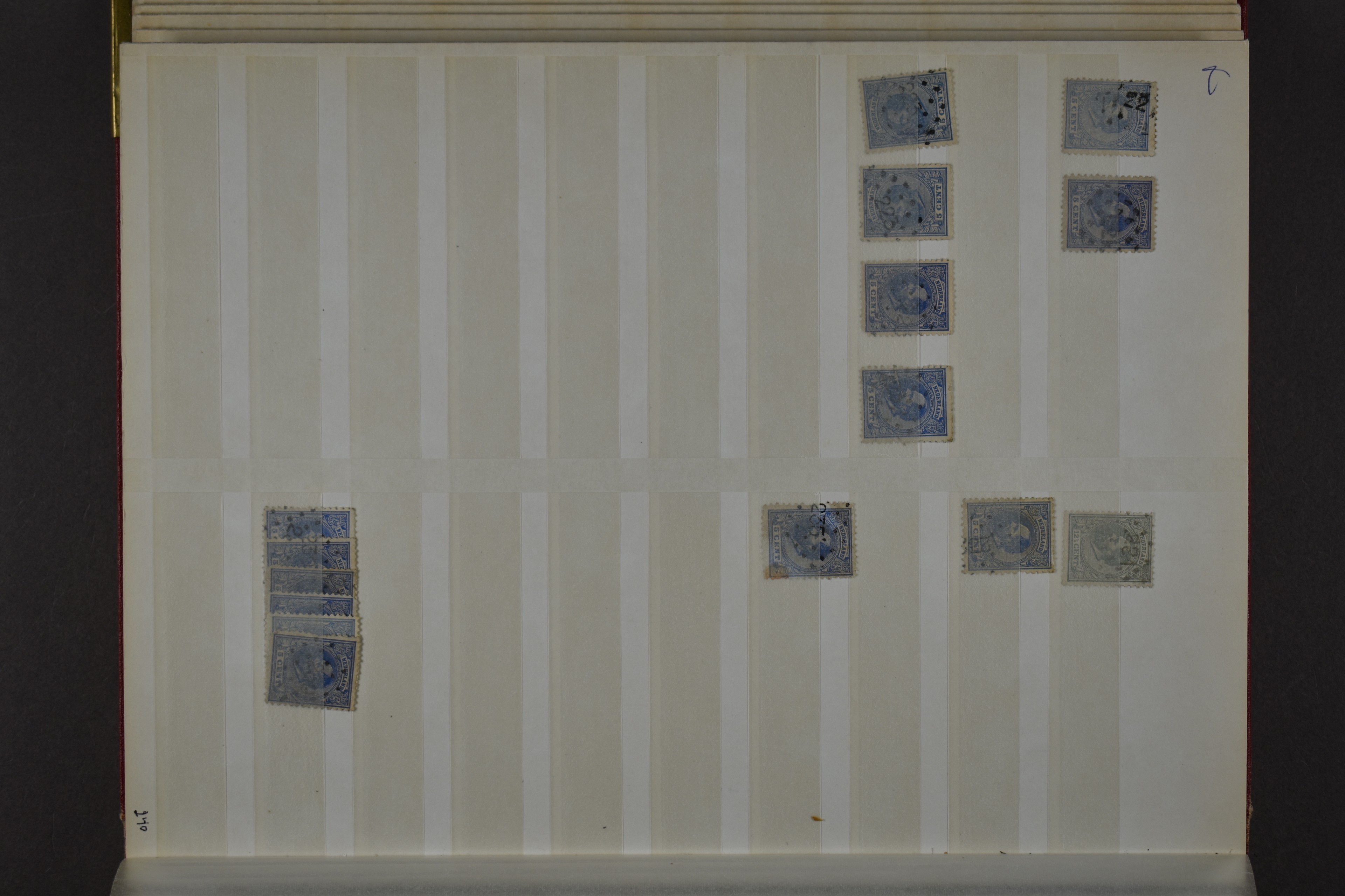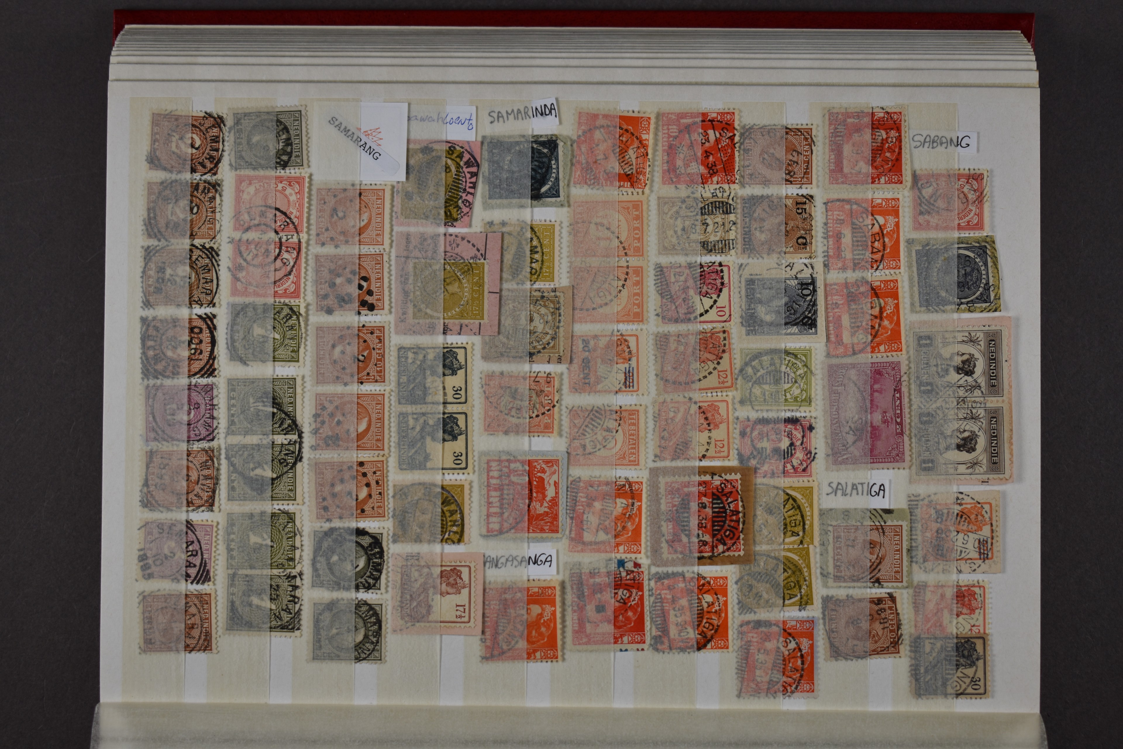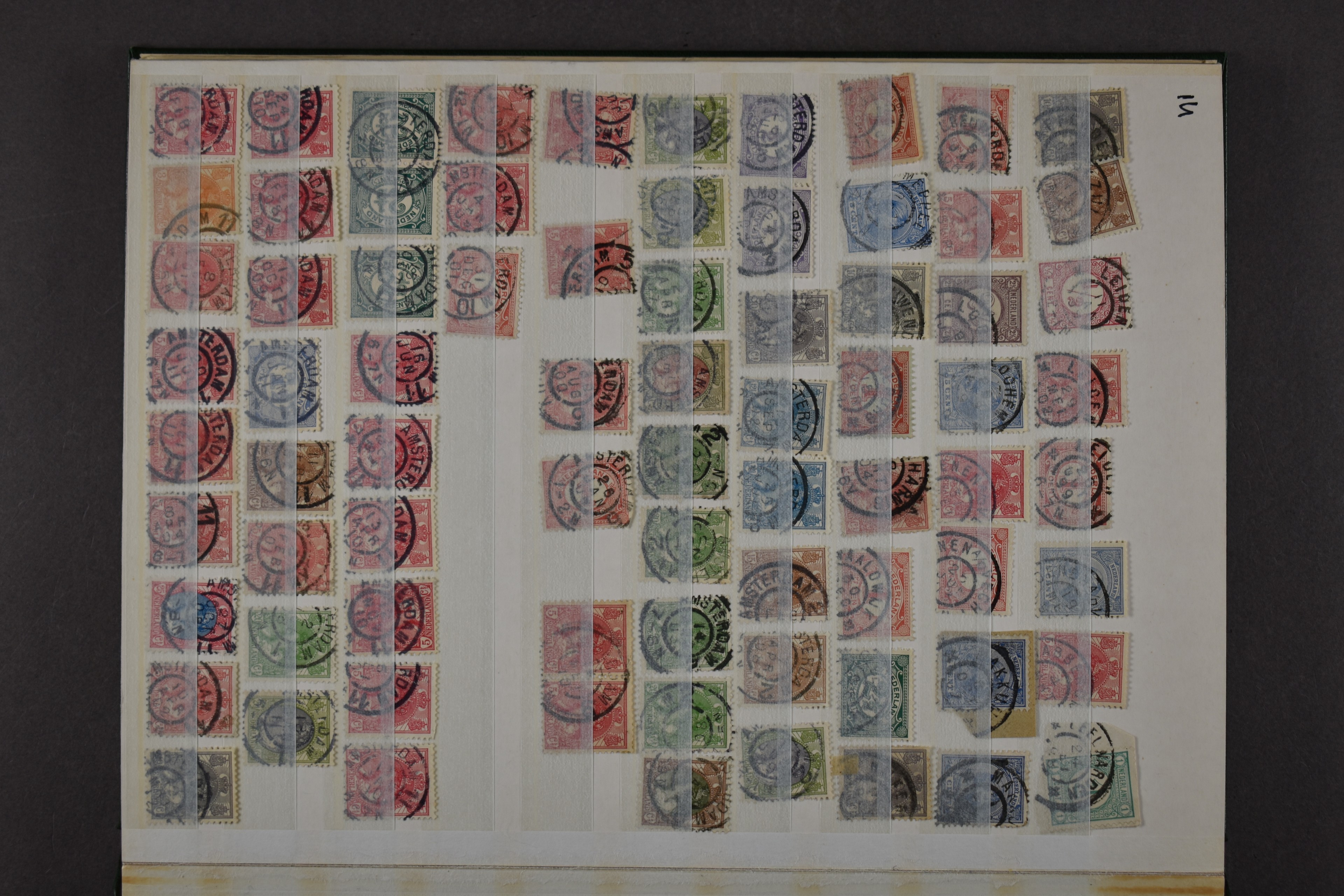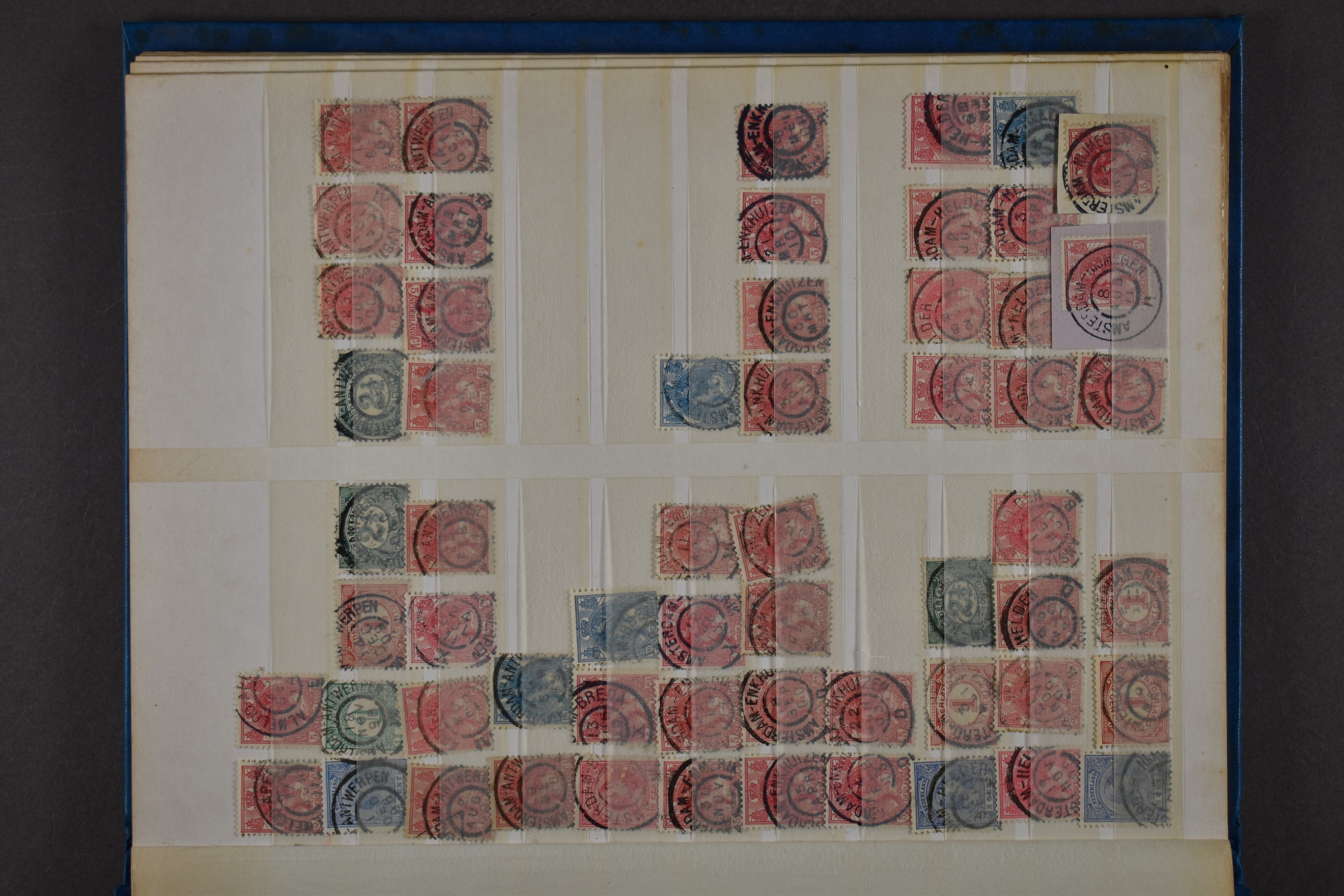 NEDERLAND, collectie afstempelingen in 12 insteekboeken waarbij punt-, kleinrond-, grootrond,- lange- en kortebalk- en drukwerkrolstempels, tevens insteekboek Ned.-Indië afstempelingen en insteekboek plaatfouten