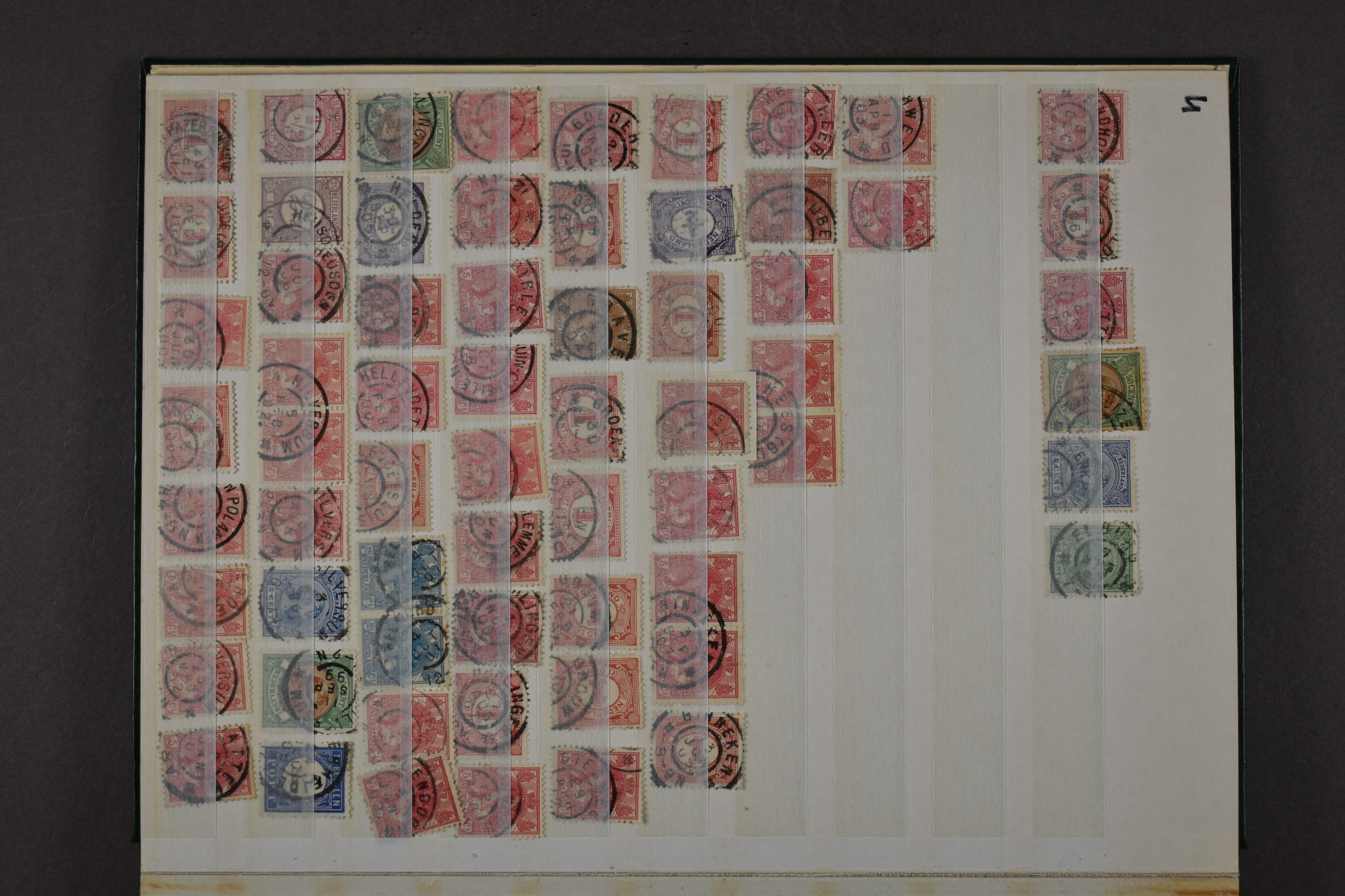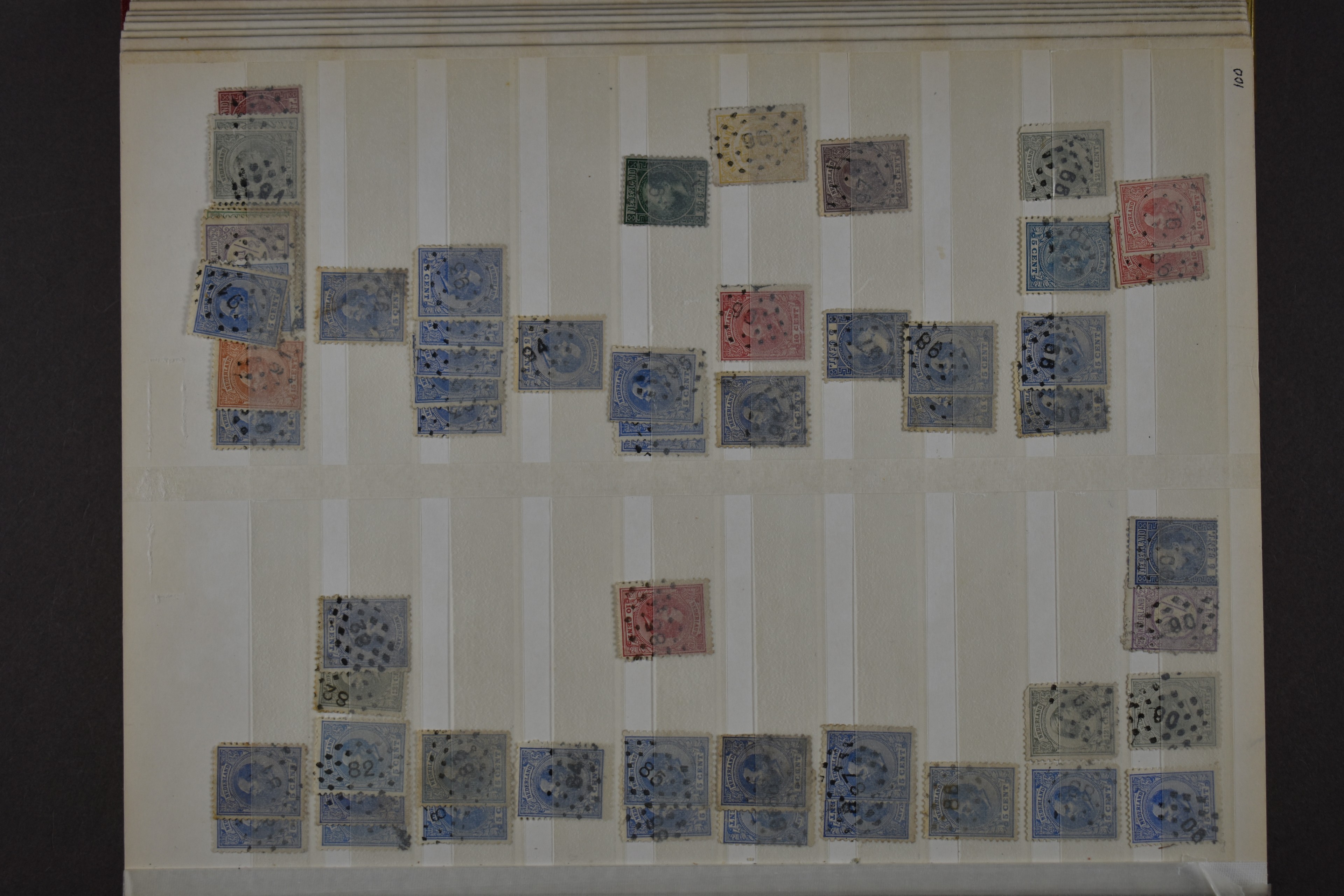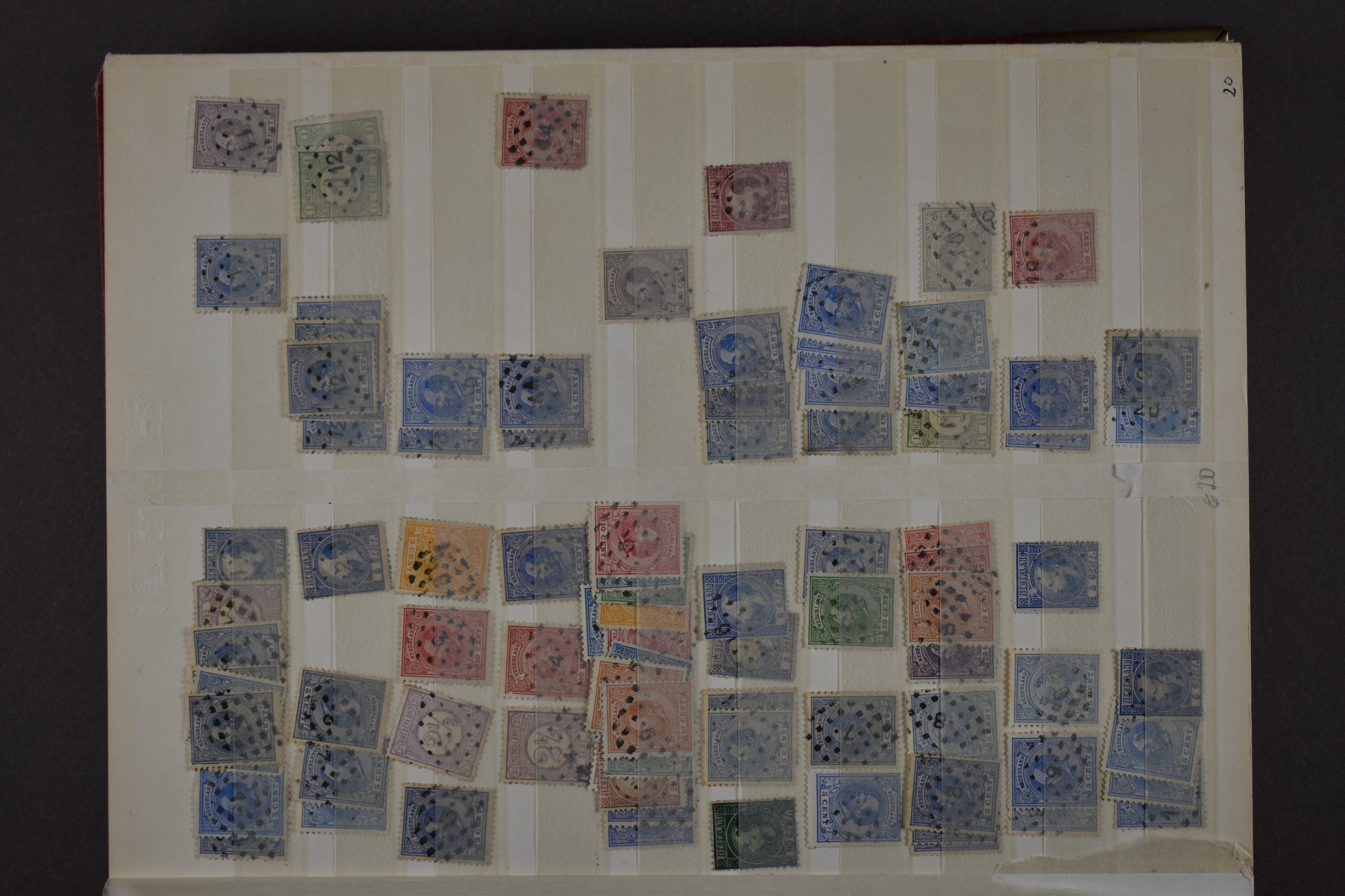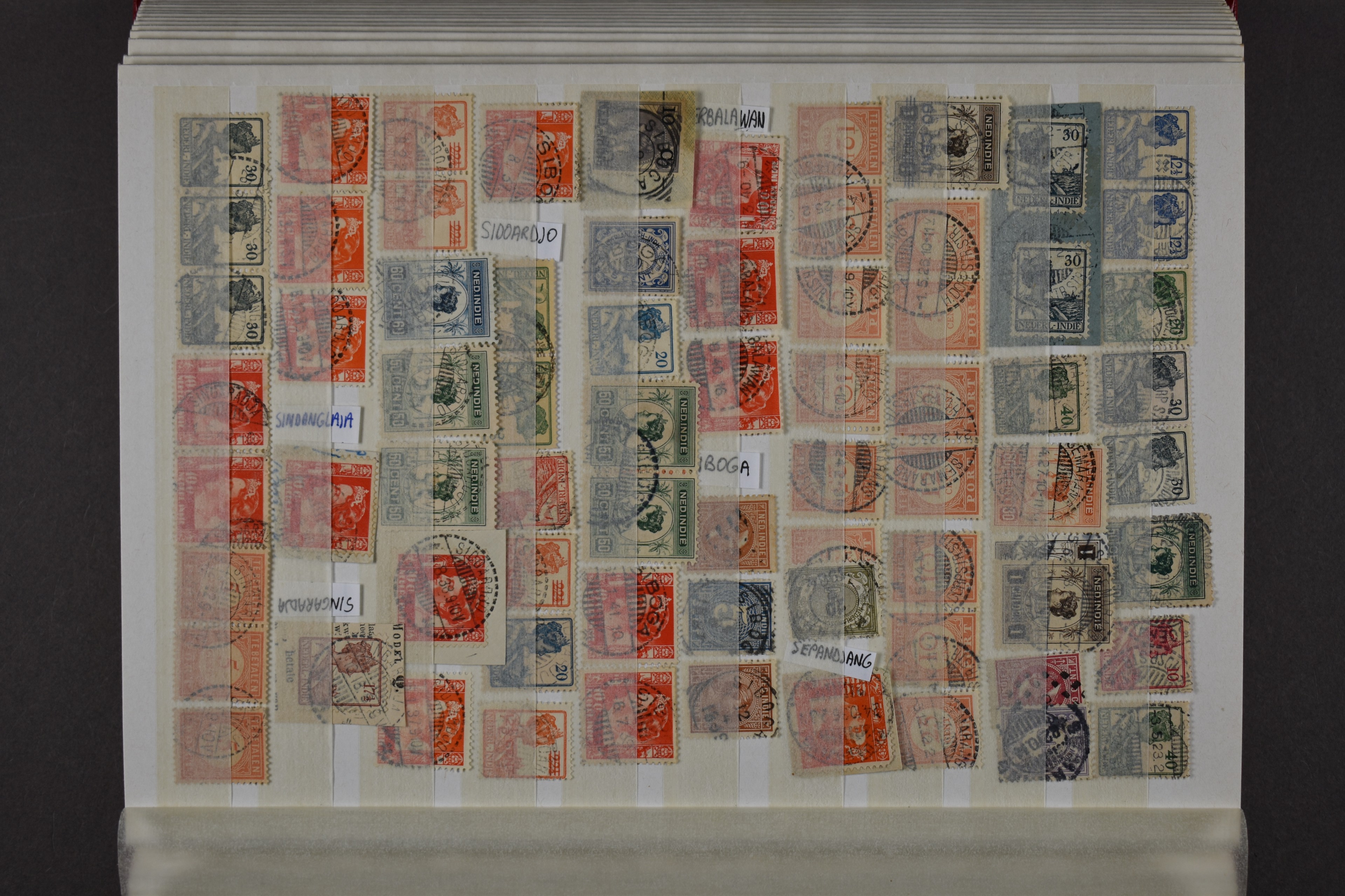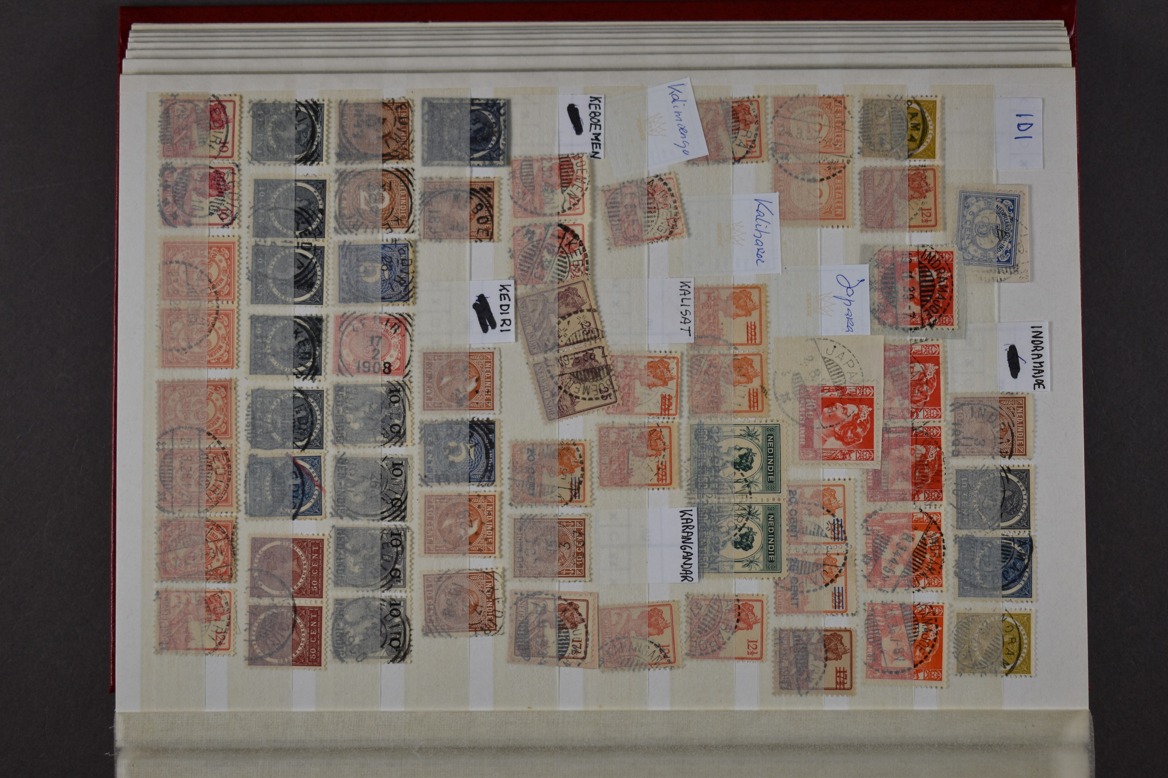 NEDERLAND, collectie afstempelingen in 12 insteekboeken waarbij punt-, kleinrond-, grootrond,- lange- en kortebalk- en drukwerkrolstempels, tevens insteekboek Ned.-Indië afstempelingen en insteekboek plaatfouten