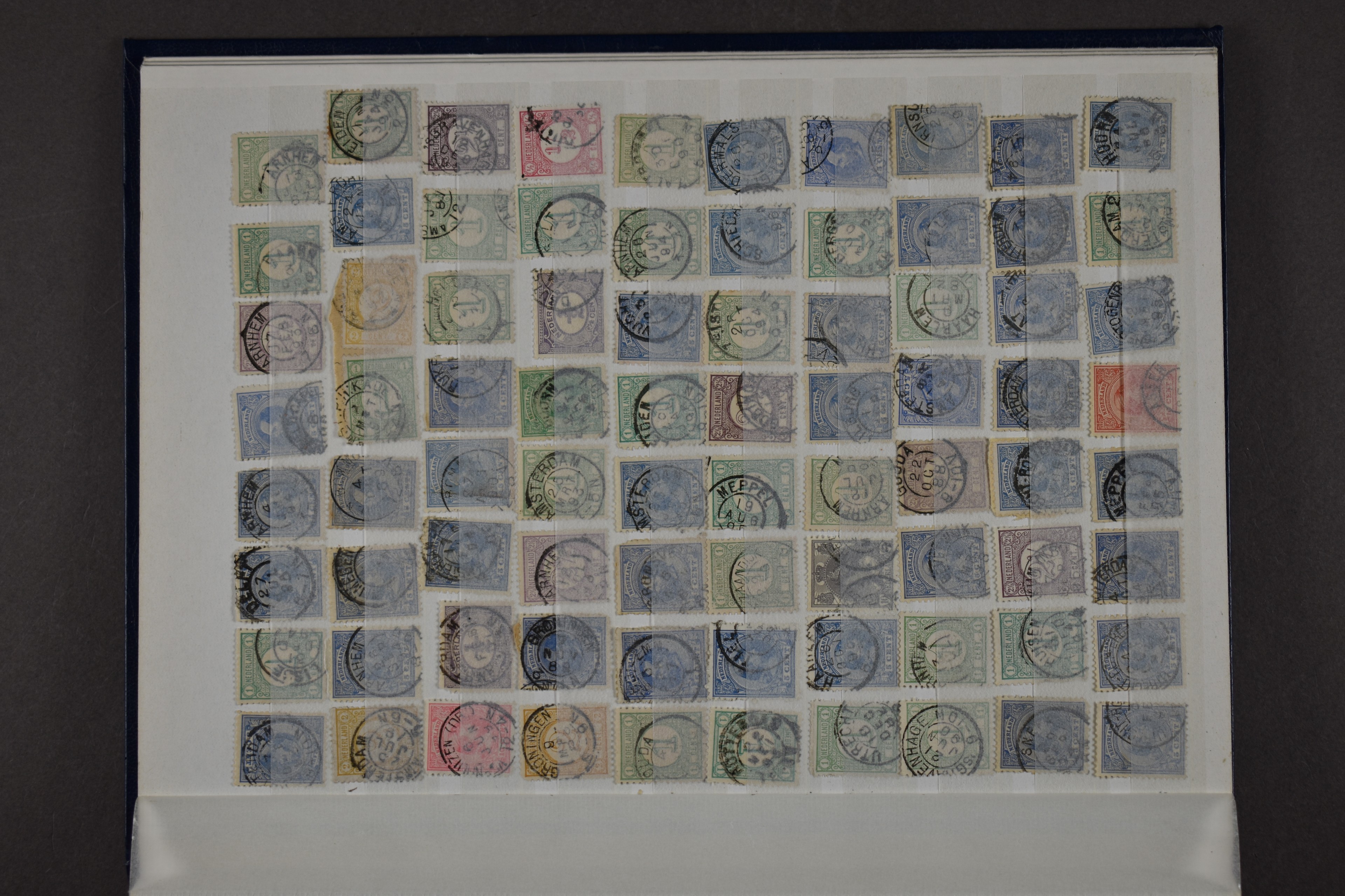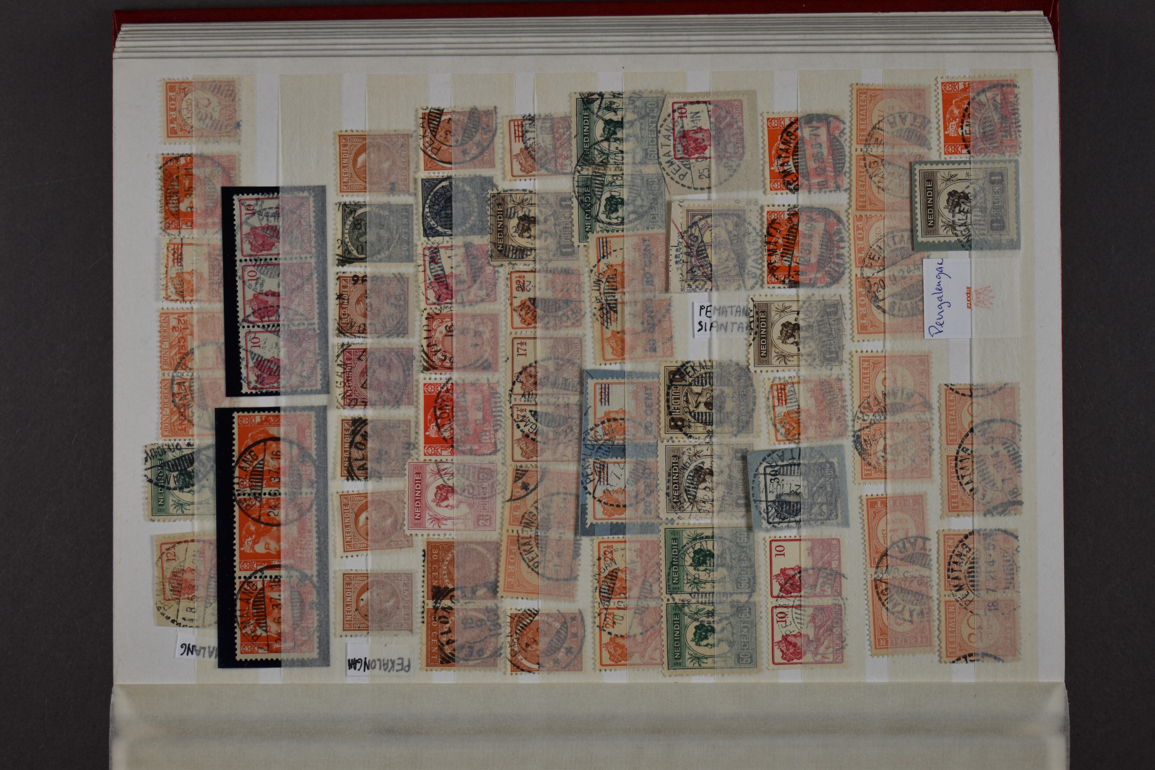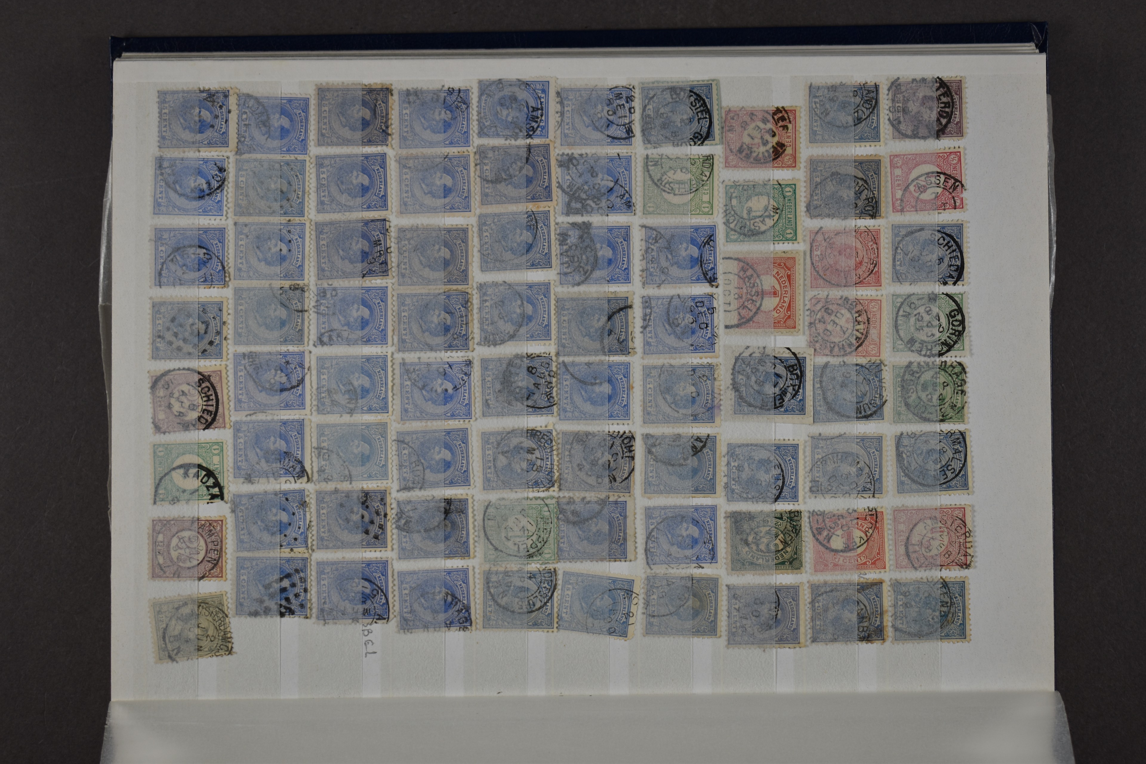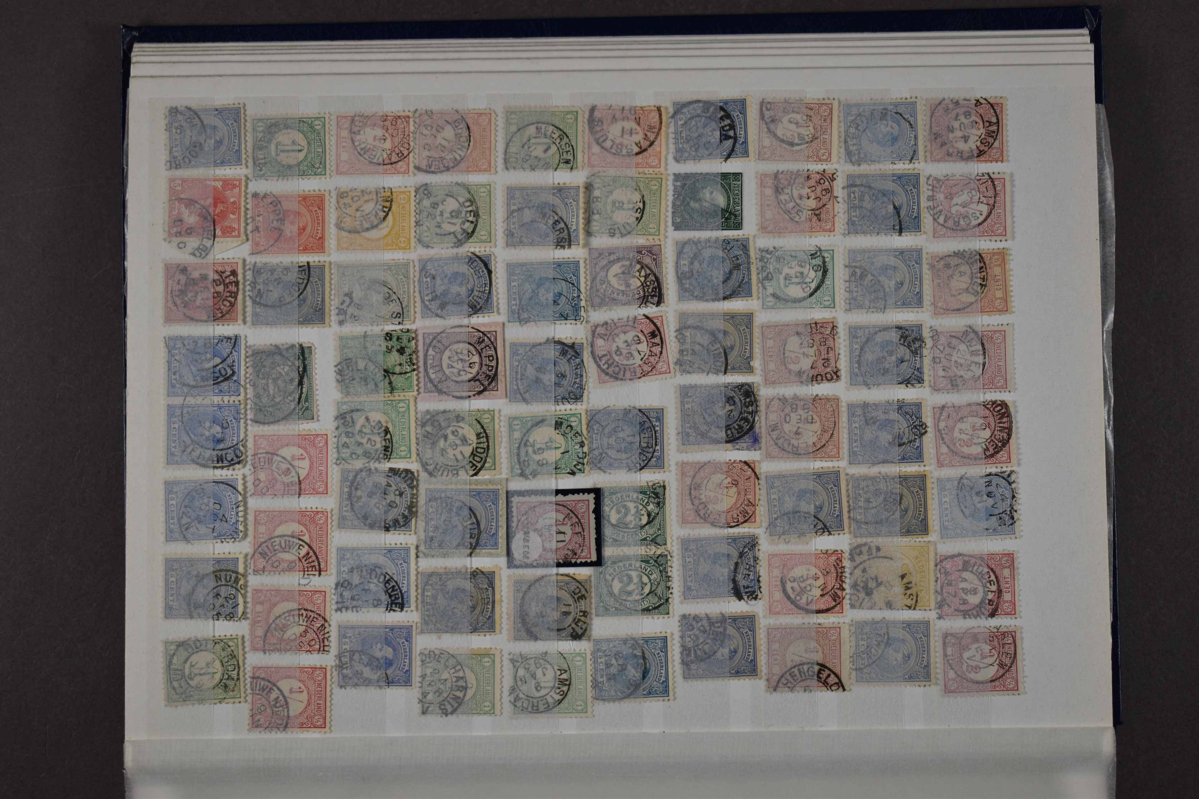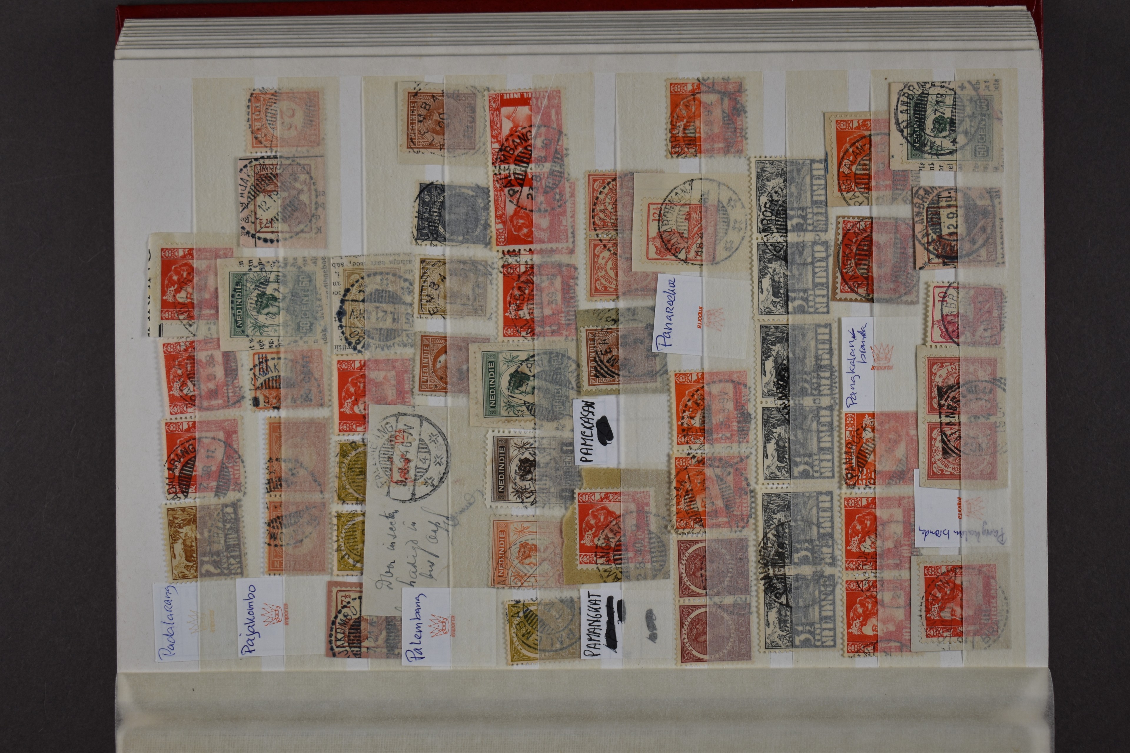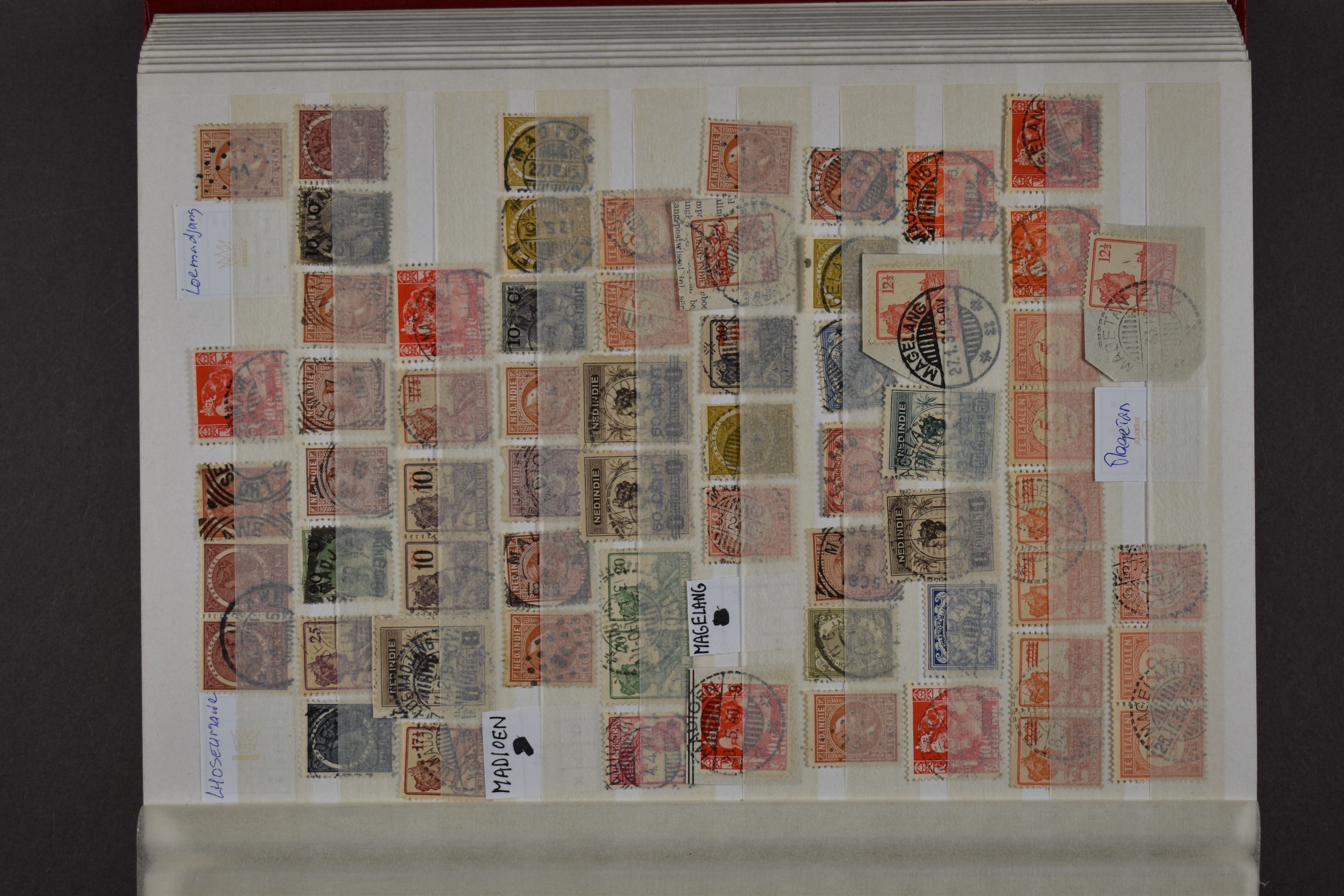 NEDERLAND, collectie afstempelingen in 12 insteekboeken waarbij punt-, kleinrond-, grootrond,- lange- en kortebalk- en drukwerkrolstempels, tevens insteekboek Ned.-Indië afstempelingen en insteekboek plaatfouten