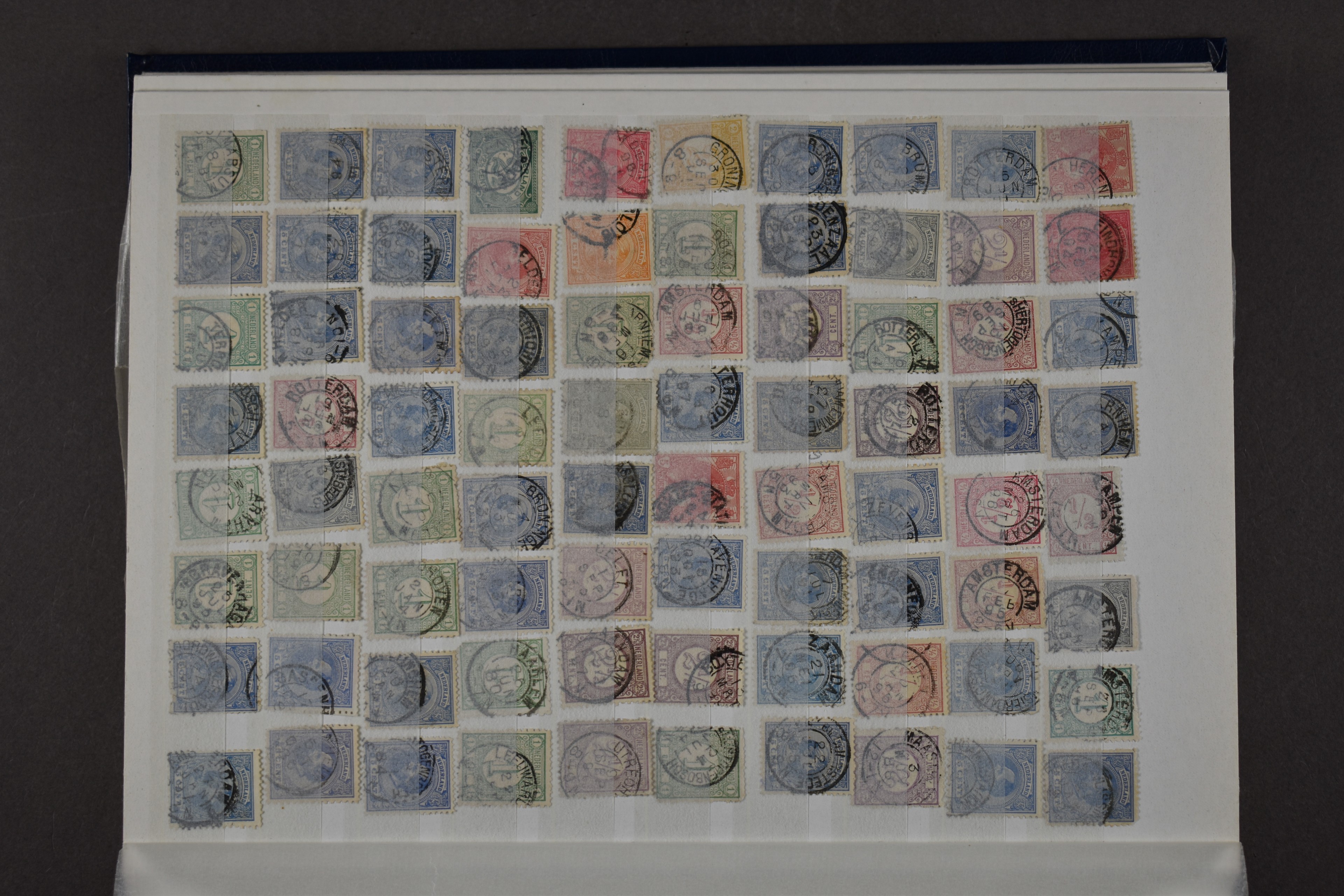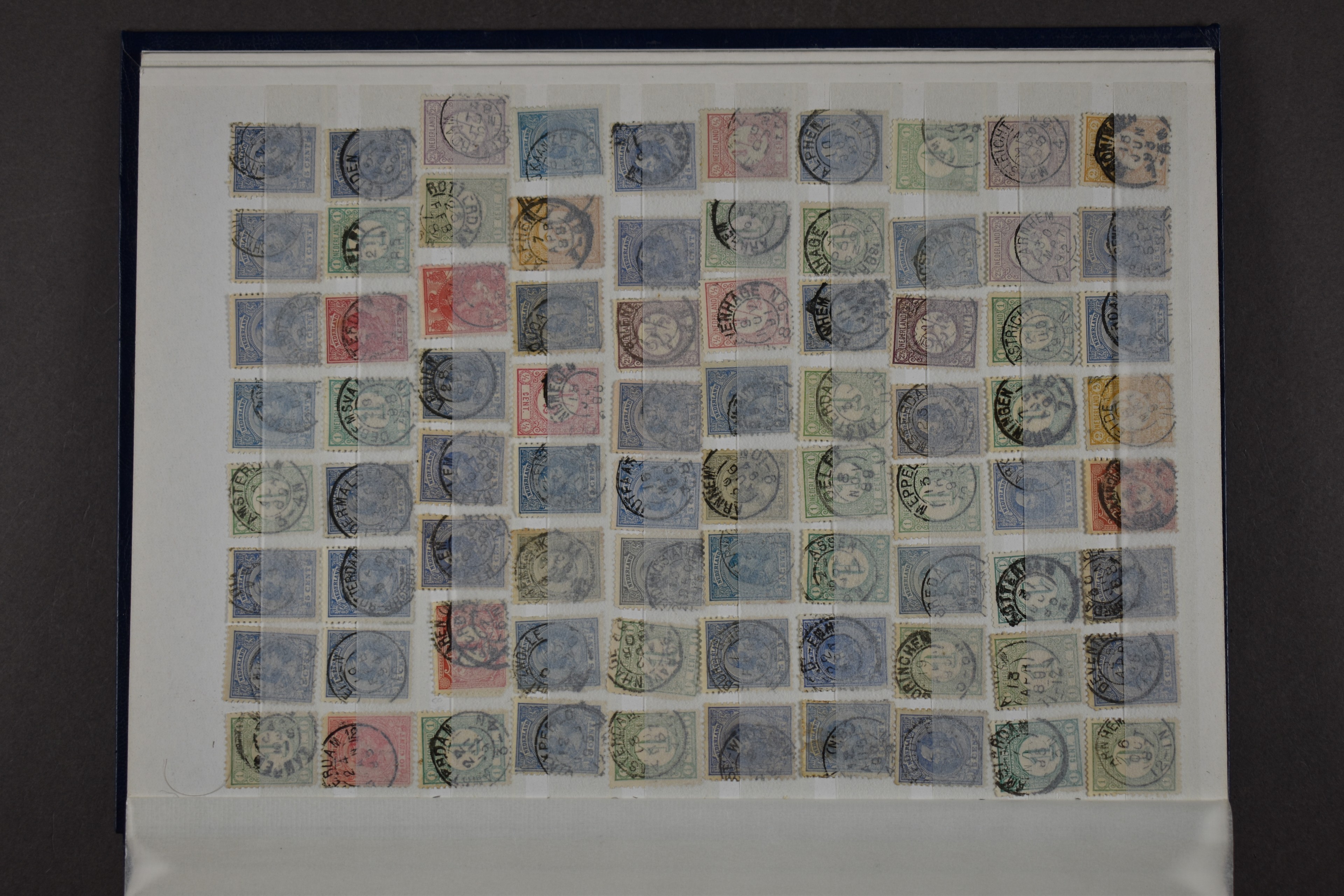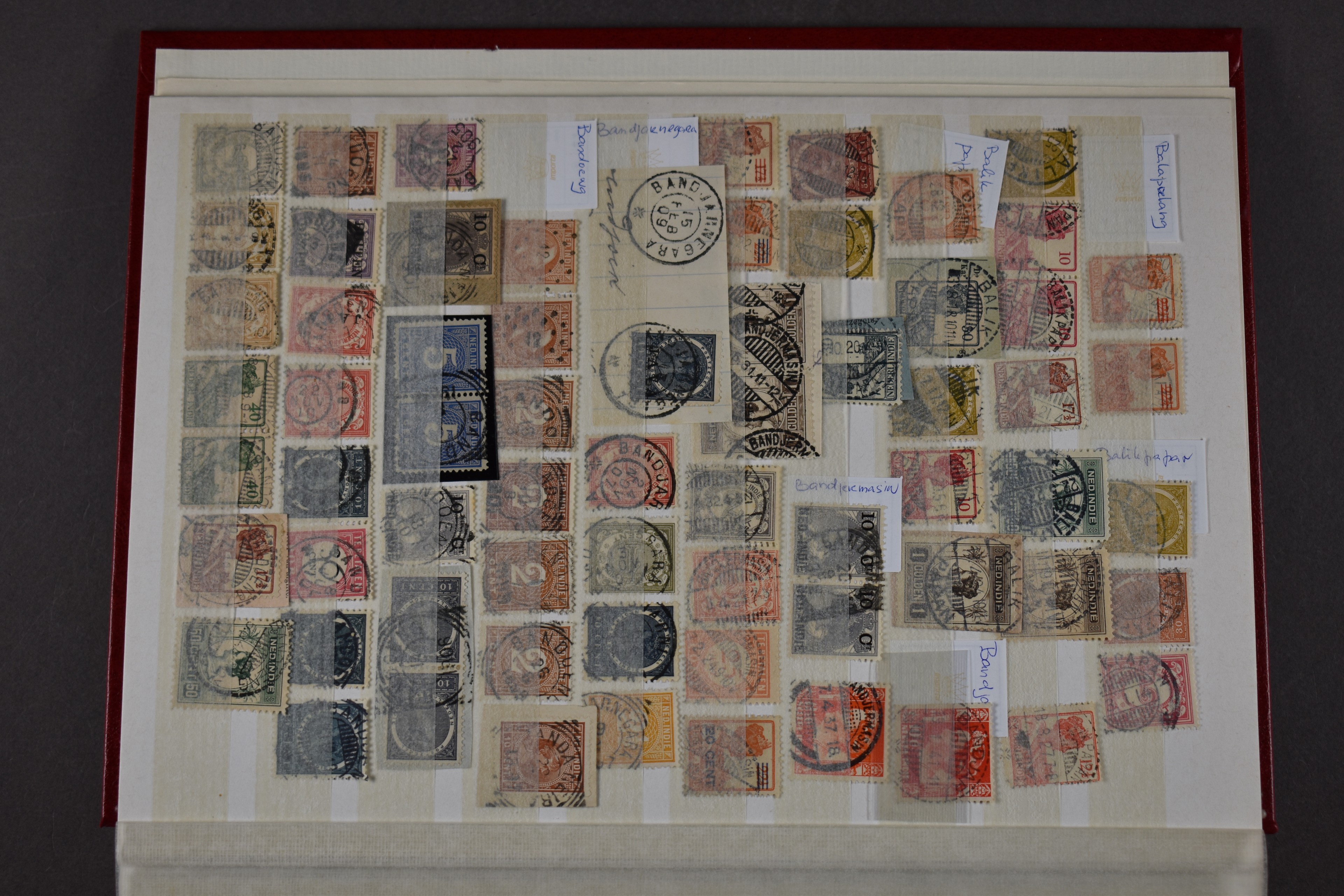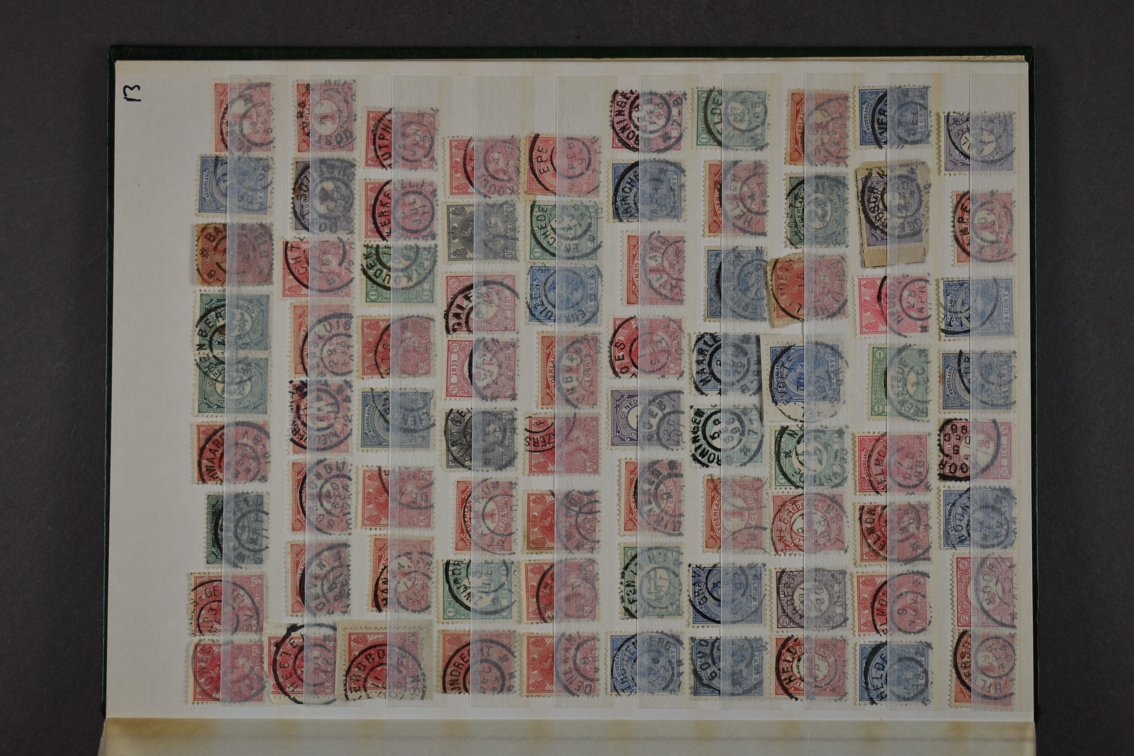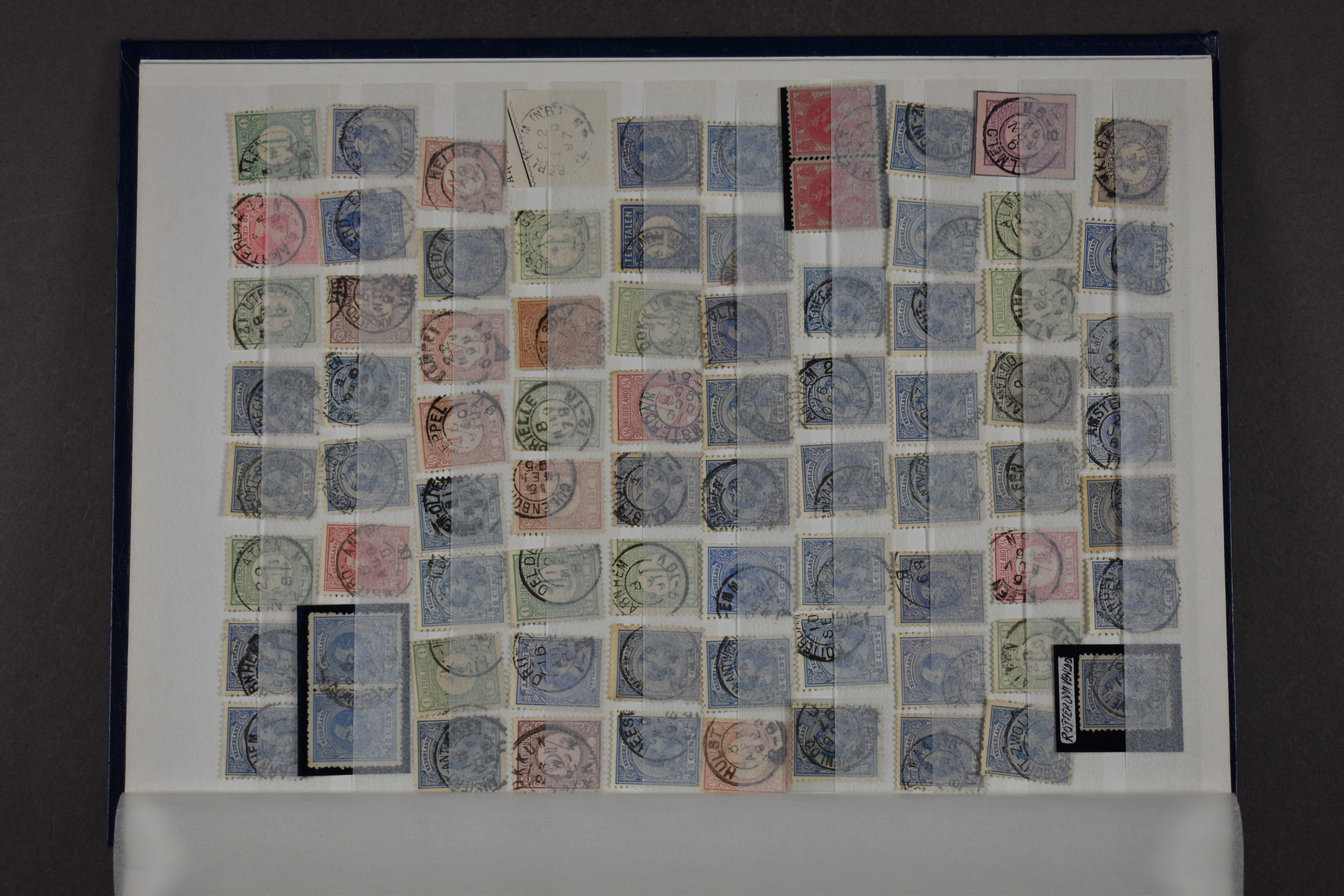 NEDERLAND, collectie afstempelingen in 12 insteekboeken waarbij punt-, kleinrond-, grootrond,- lange- en kortebalk- en drukwerkrolstempels, tevens insteekboek Ned.-Indië afstempelingen en insteekboek plaatfouten