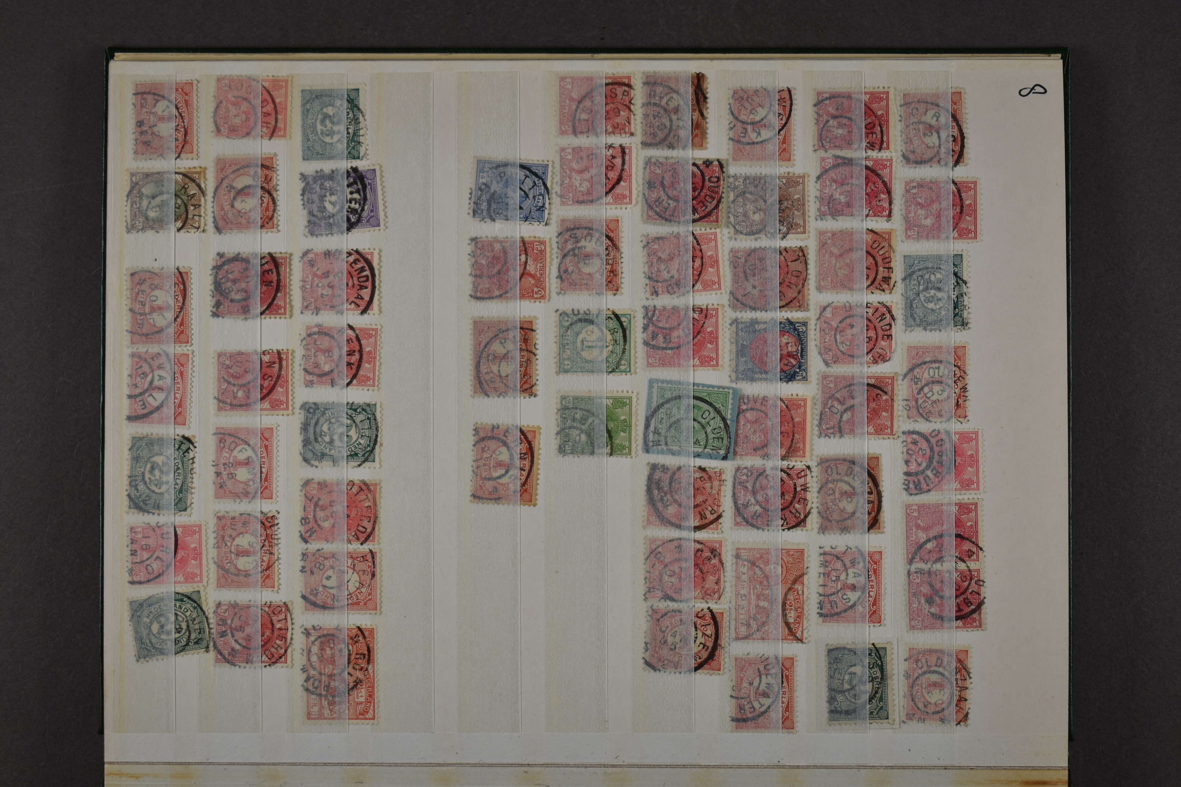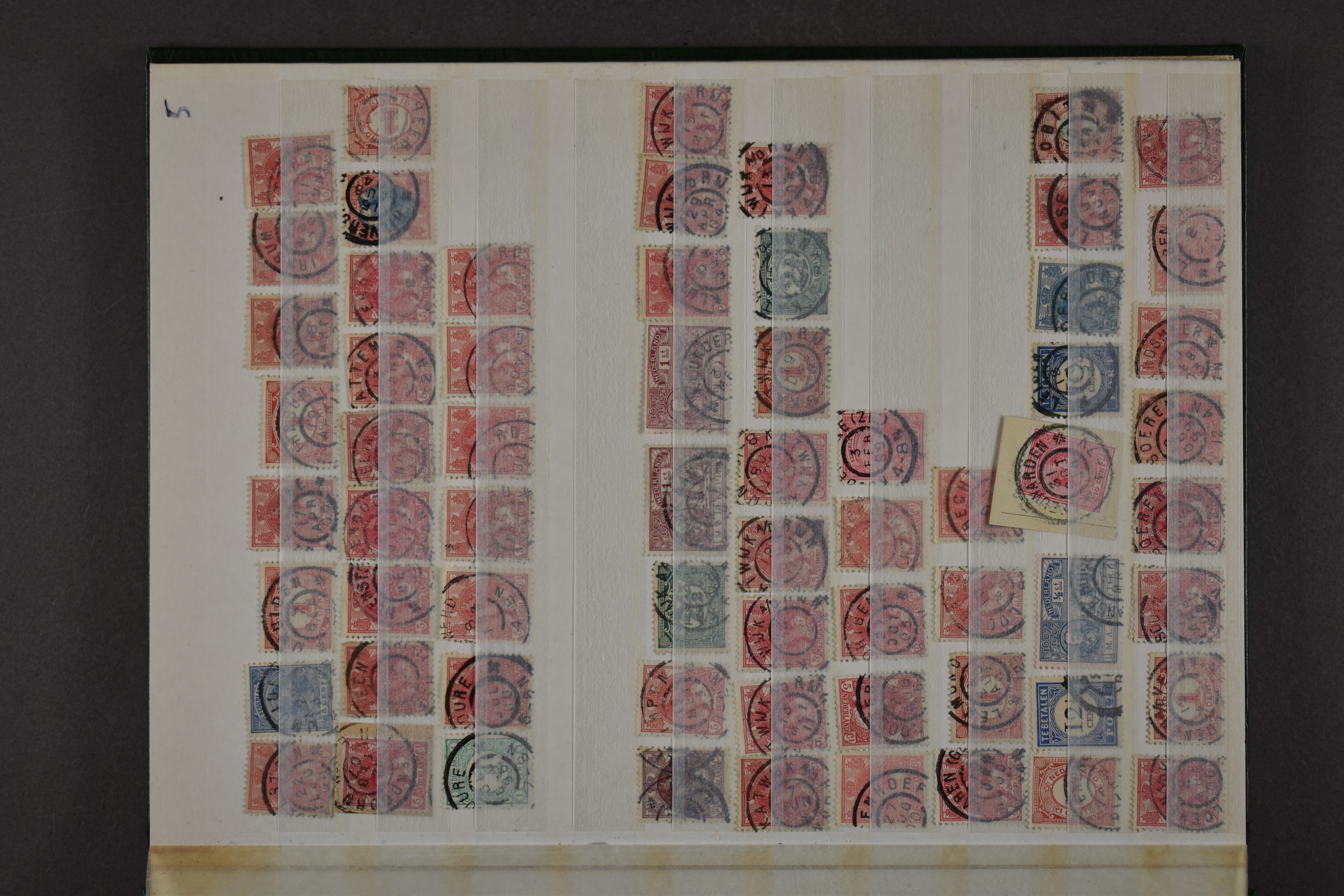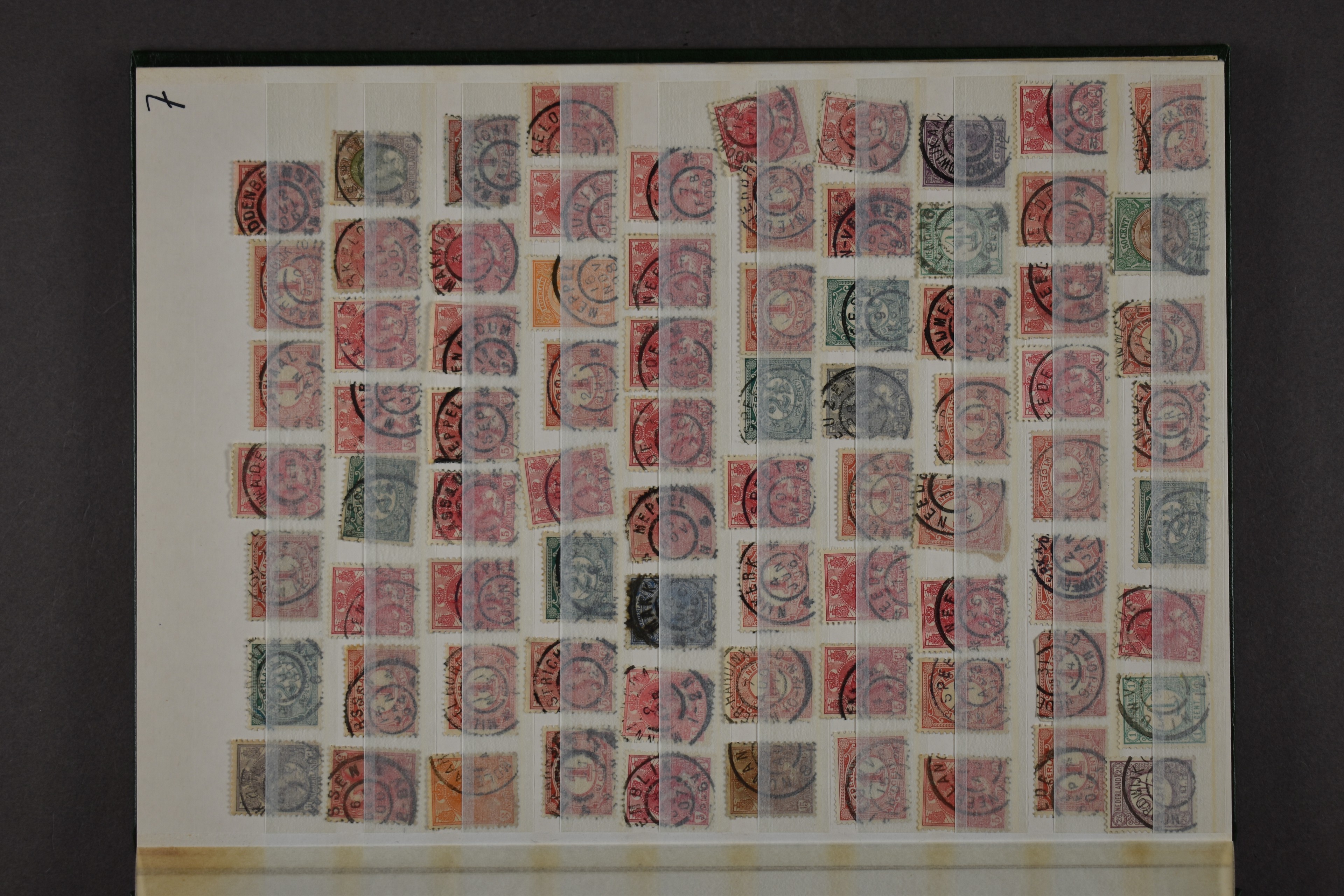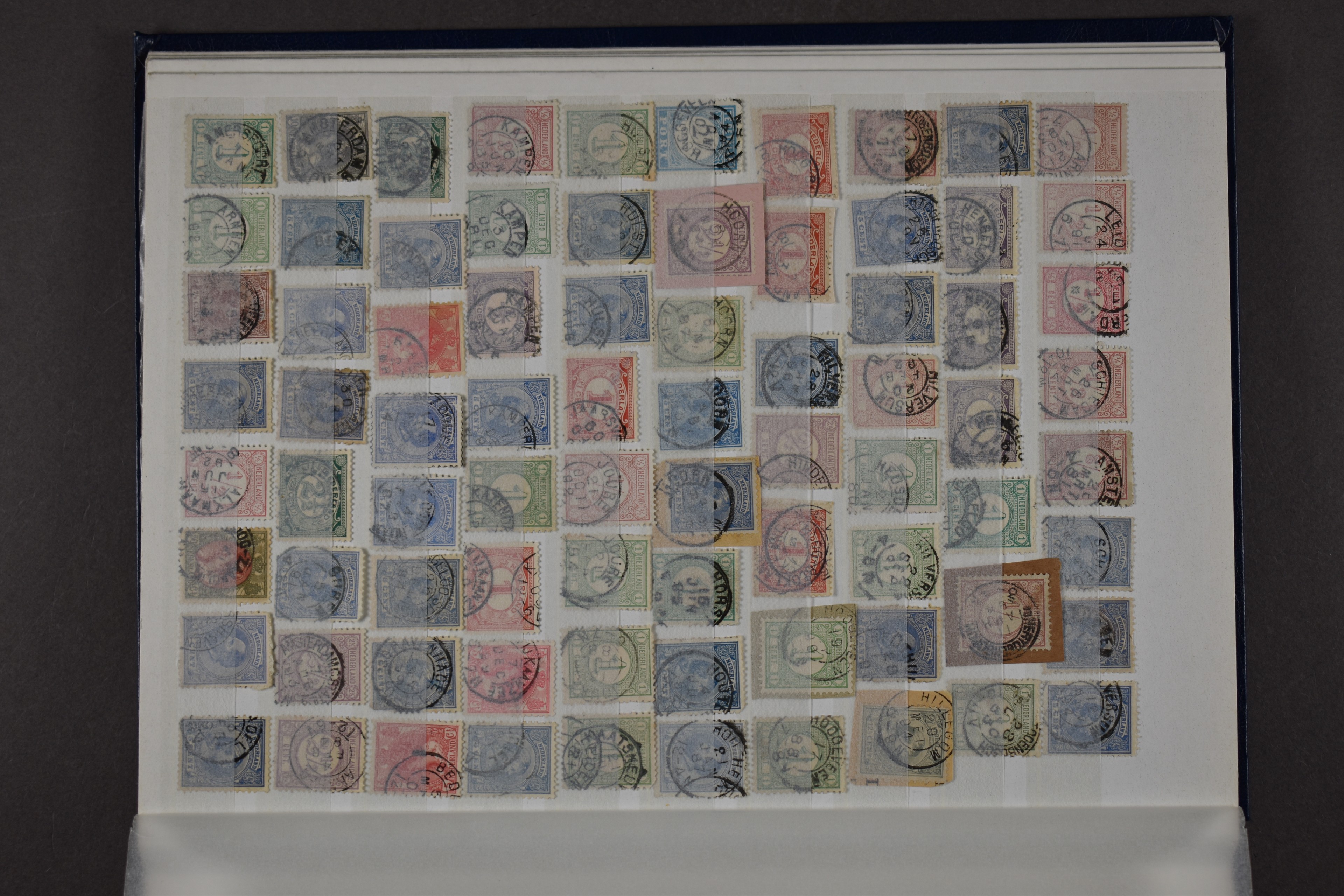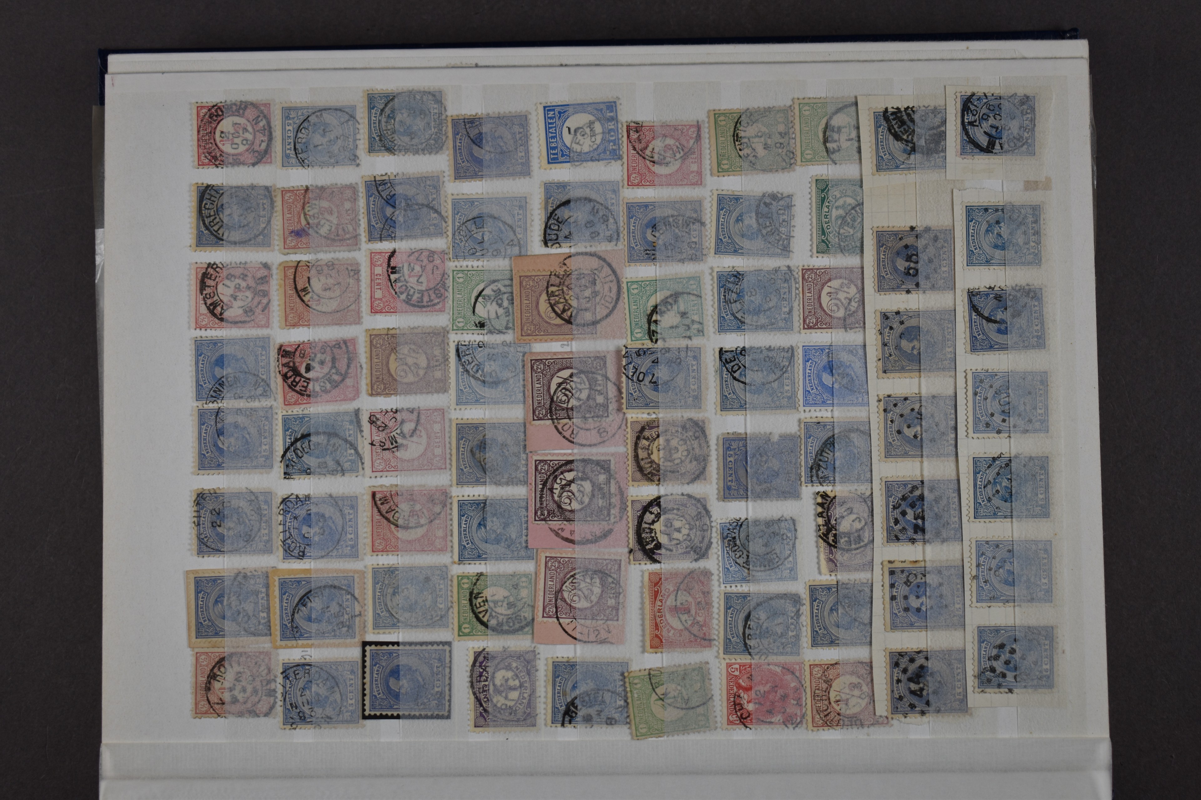 NEDERLAND, collectie afstempelingen in 12 insteekboeken waarbij punt-, kleinrond-, grootrond,- lange- en kortebalk- en drukwerkrolstempels, tevens insteekboek Ned.-Indië afstempelingen en insteekboek plaatfouten