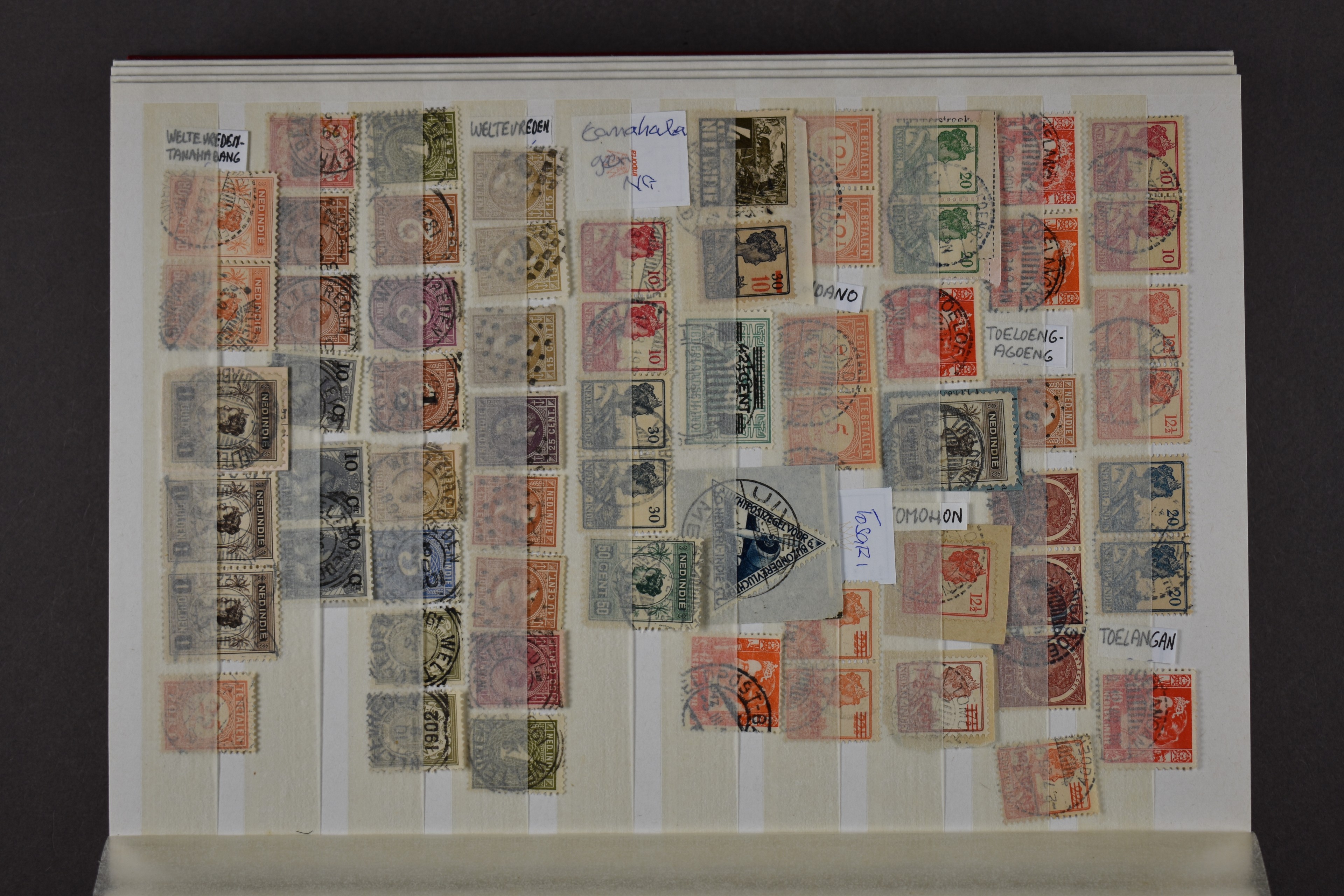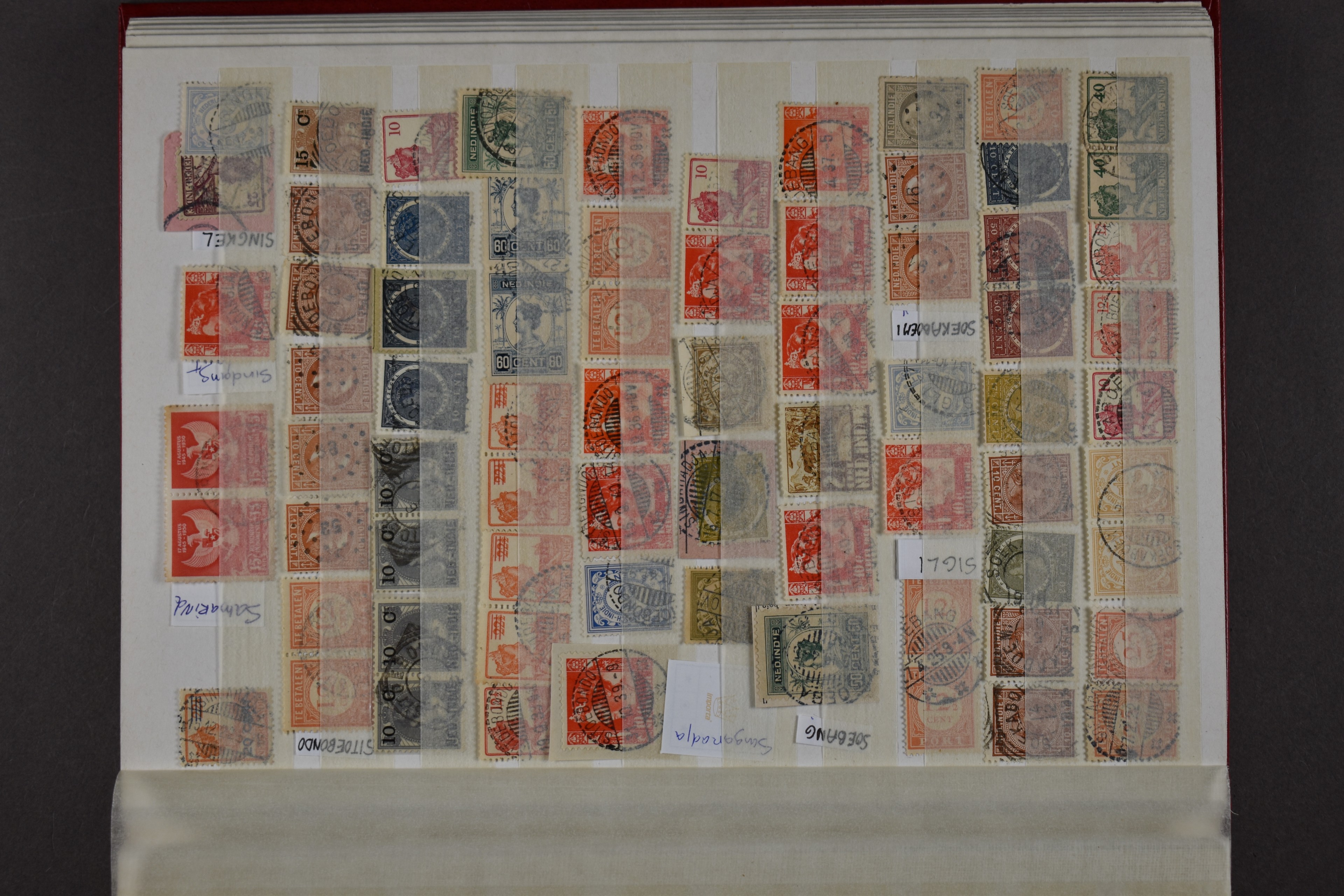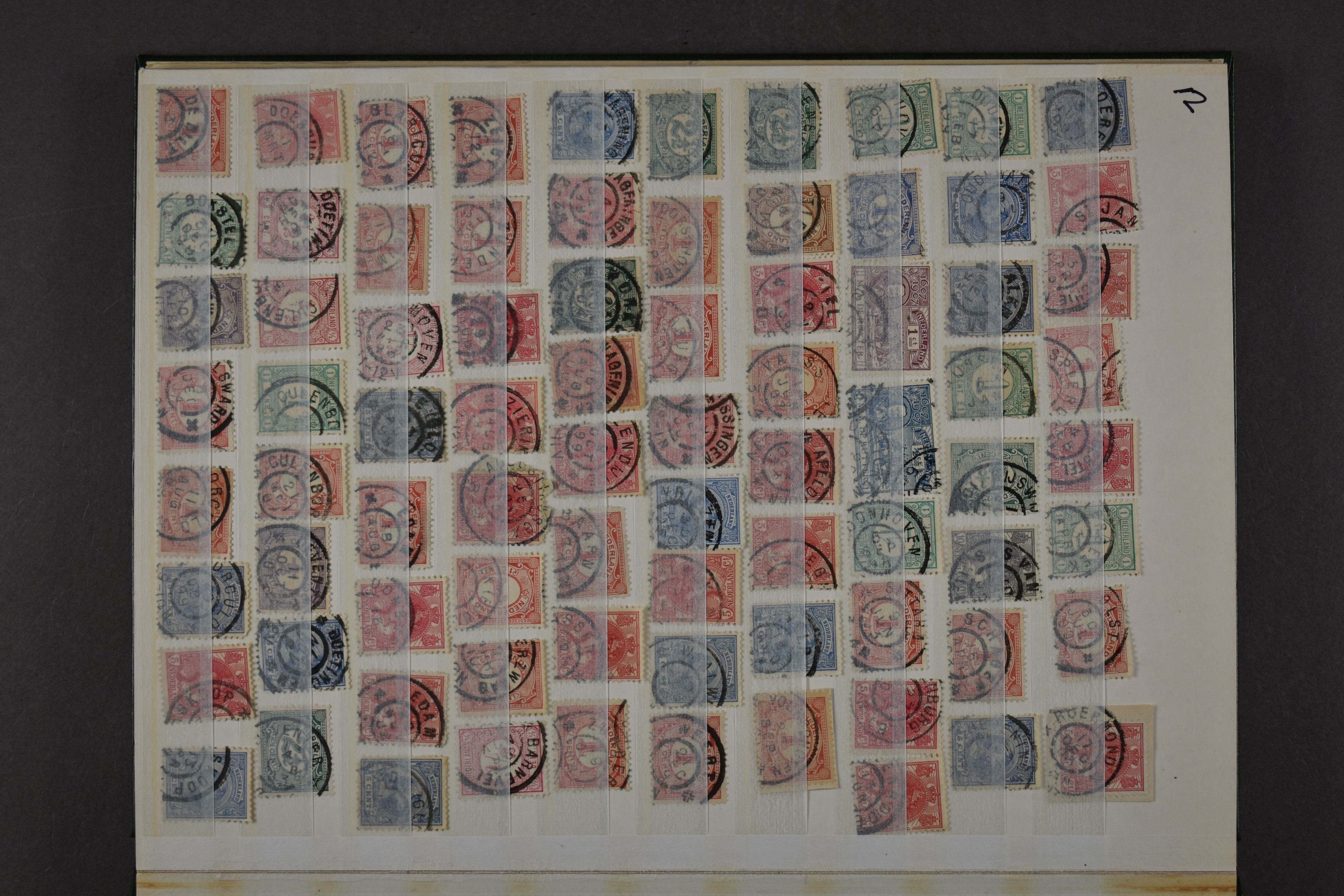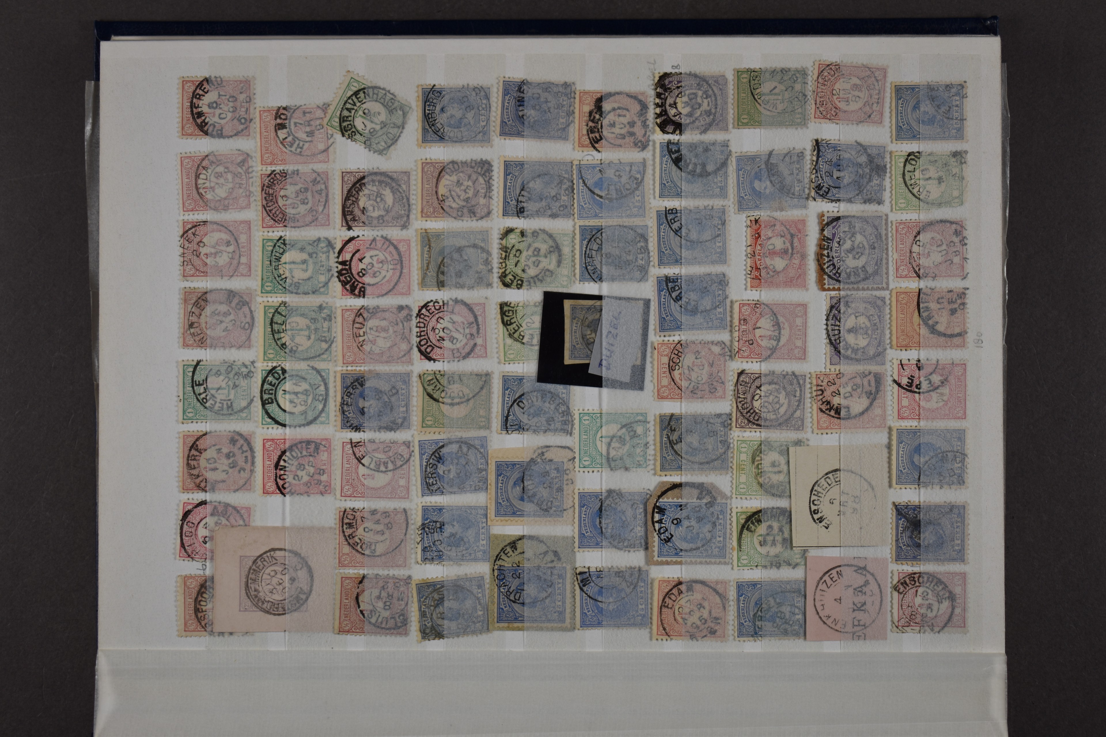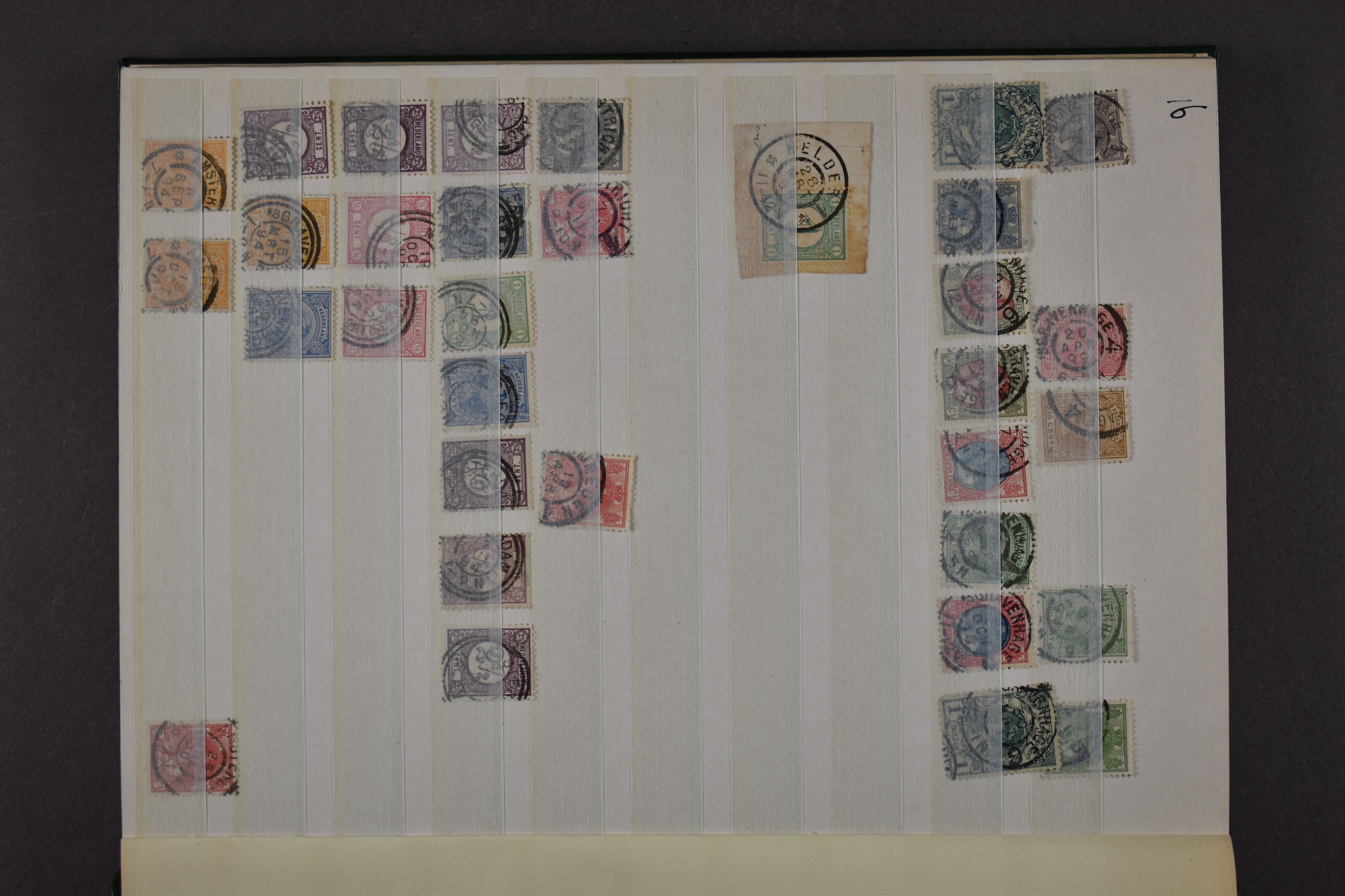 NEDERLAND, collectie afstempelingen in 12 insteekboeken waarbij punt-, kleinrond-, grootrond,- lange- en kortebalk- en drukwerkrolstempels, tevens insteekboek Ned.-Indië afstempelingen en insteekboek plaatfouten