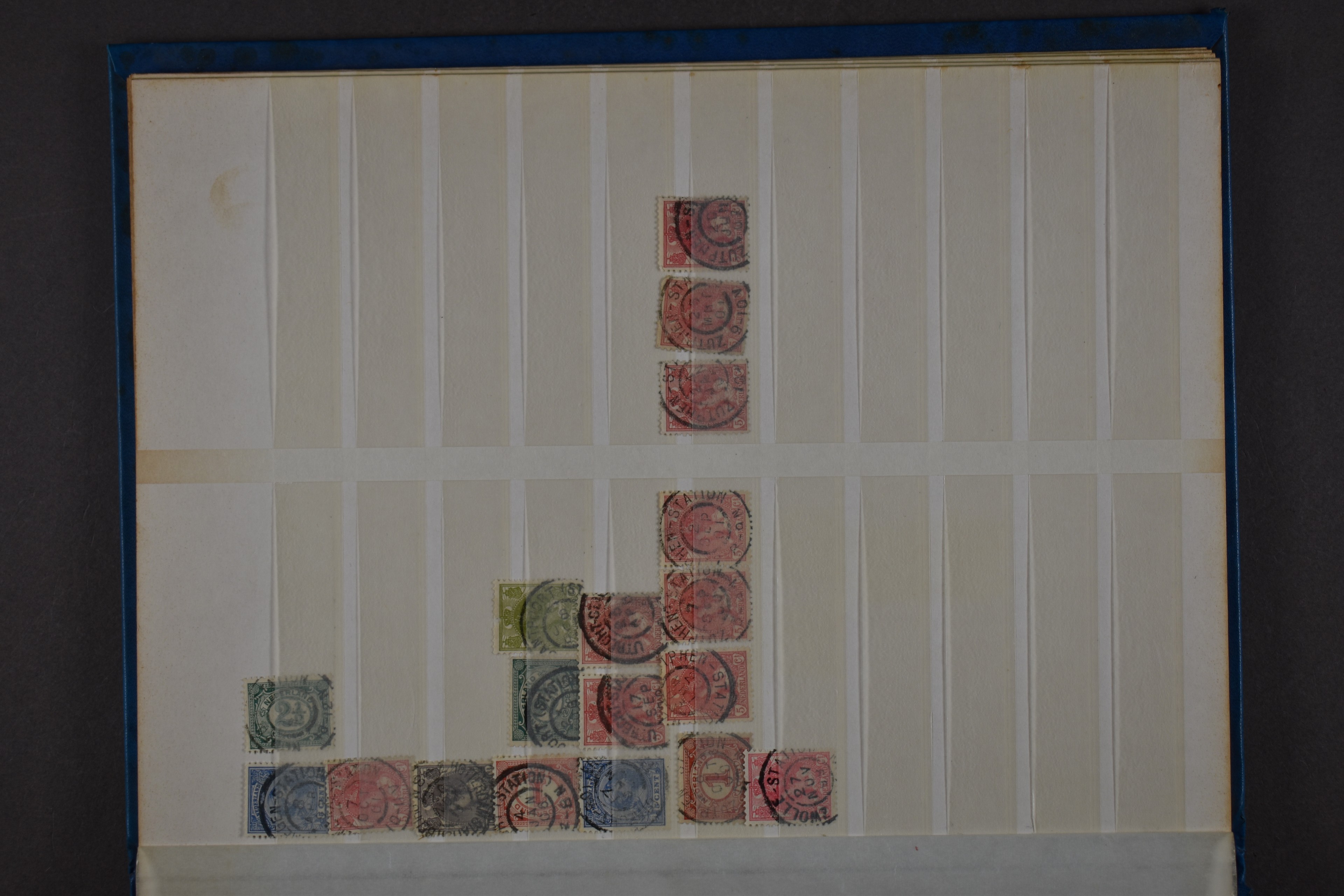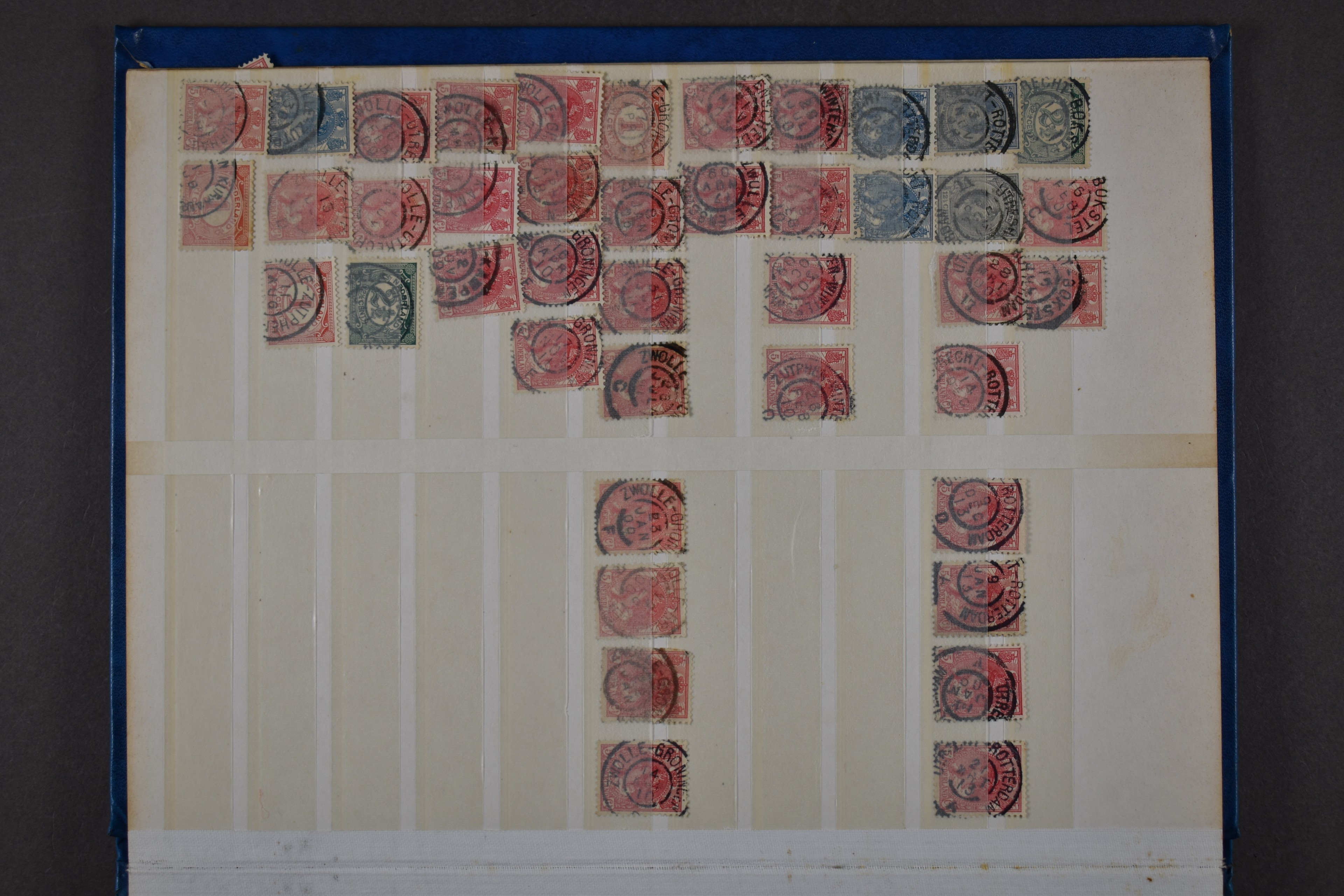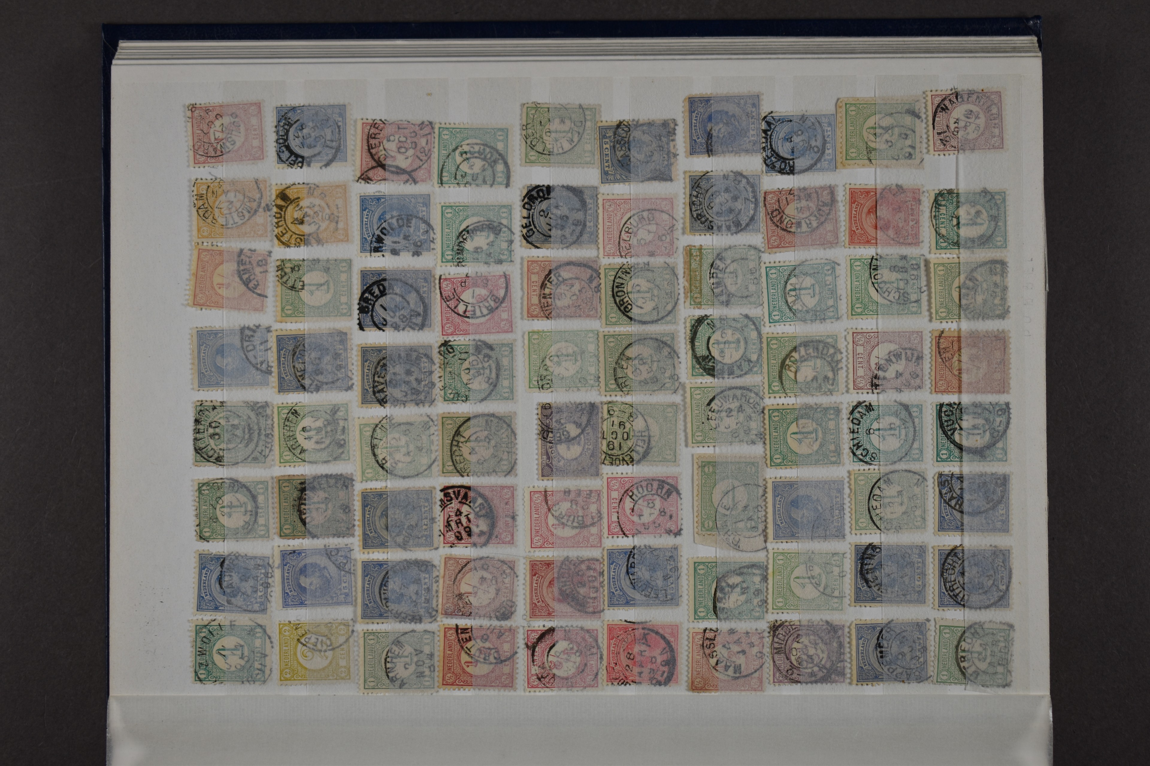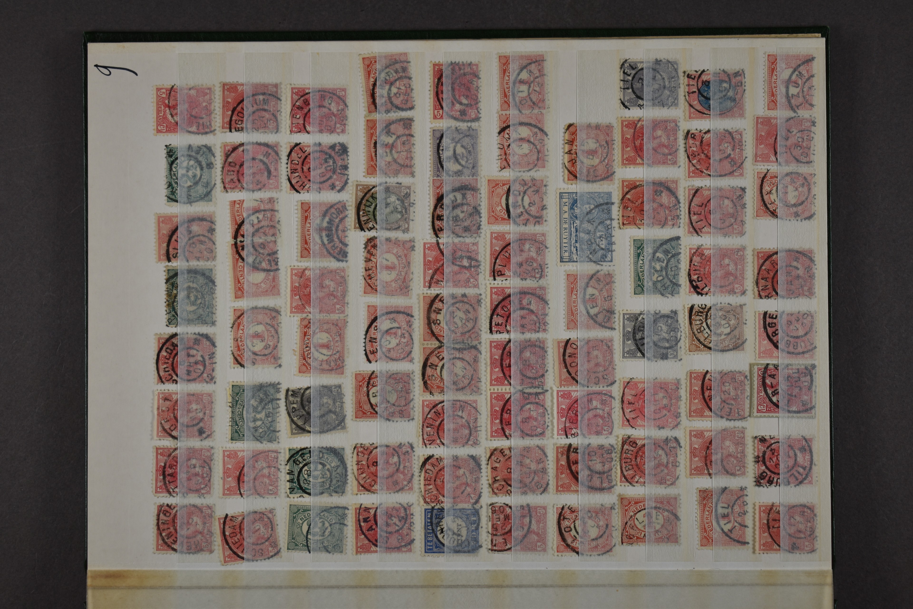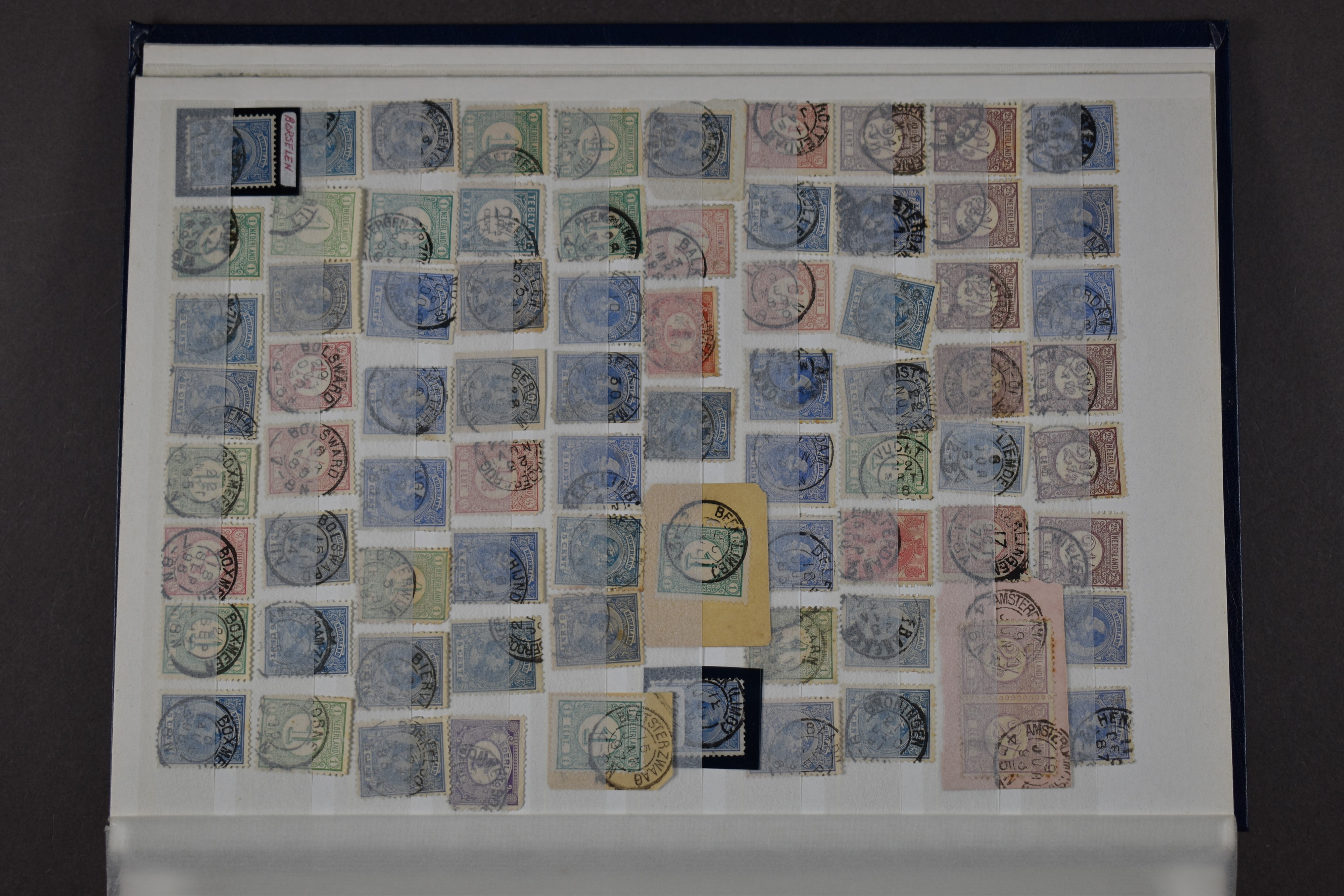 NEDERLAND, collectie afstempelingen in 12 insteekboeken waarbij punt-, kleinrond-, grootrond,- lange- en kortebalk- en drukwerkrolstempels, tevens insteekboek Ned.-Indië afstempelingen en insteekboek plaatfouten