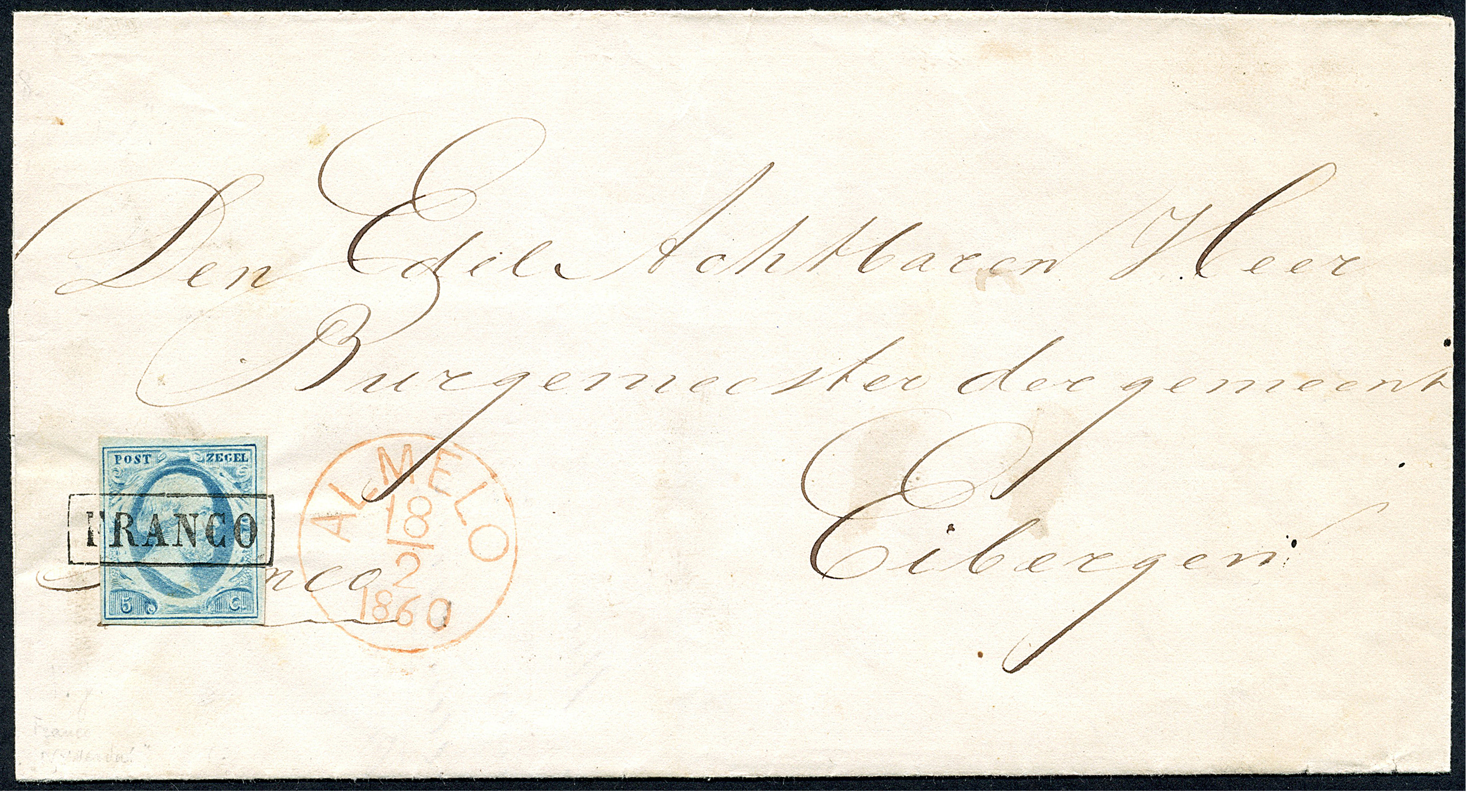 5 Cent, prachtex. op zeer frisse briefomslag van NYVERDAL (az. naamstempel) via Almelo 18-2-1860 naar Eibergen. Prachtige afstempelingen! Almelo beschikte in de periode 1-1-1860 tot 12-3-1860 nog niet over een nieuw halfrond-francostempel, de H/S C type II, en stempelde de zegel daarom met Franco af