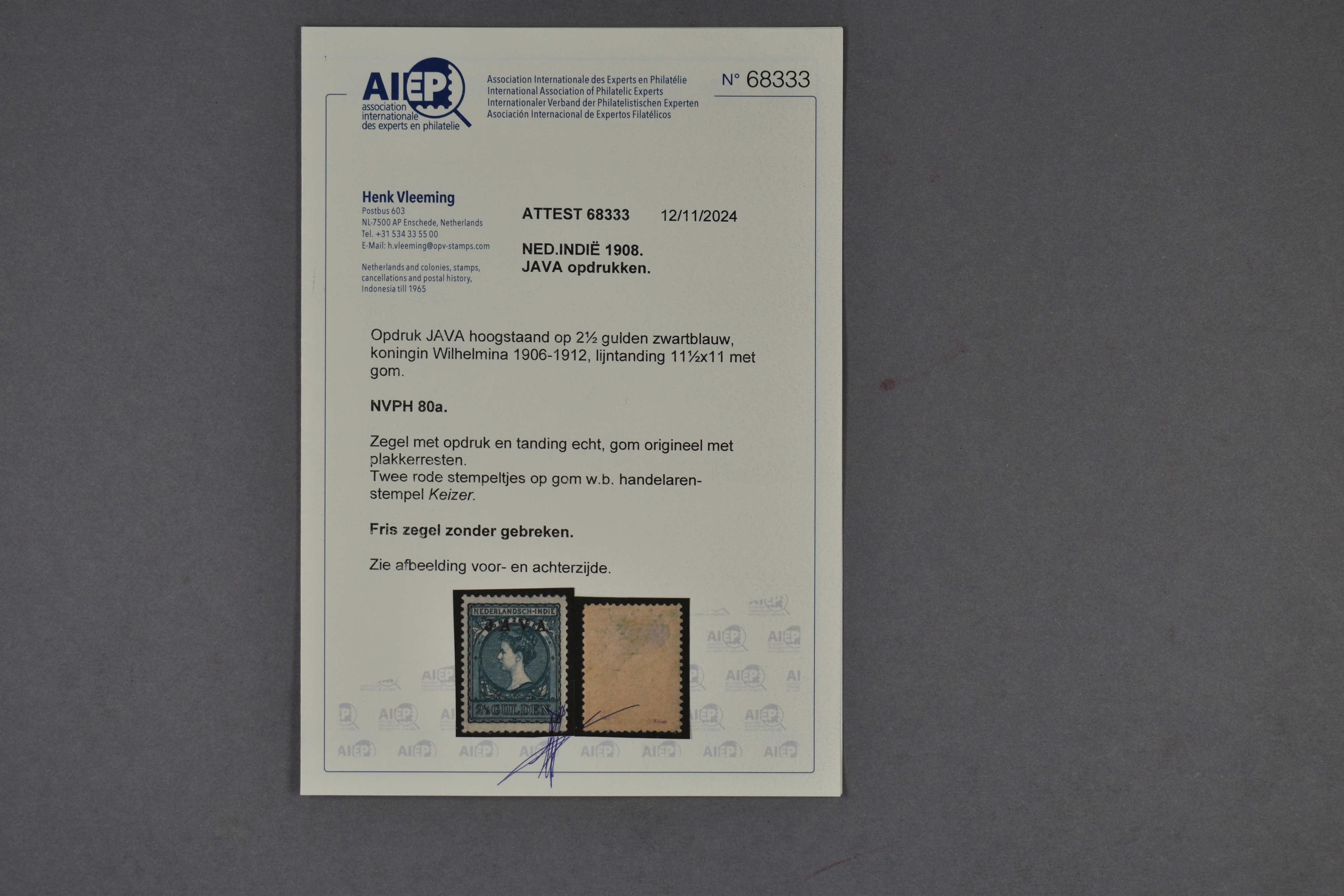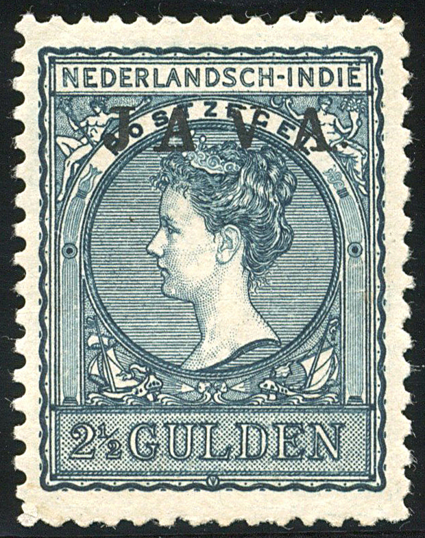 80a, 2½ gulden zwartblauw, Lt. 11½ x 11, met opdruk JAVA hoogstaand. Ongebruikt prachtex. met keur Keizer en certificaat Vleeming (2024) € 3850