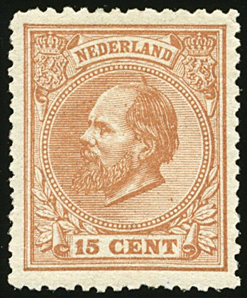 23C, 15 cent oranjebruin, Lt. 14¼ x 14, postfris prachtex. met certificaat Vleeming (2012): "Zegel en tanding echt, gom origineel en postfris, origineel papierpuntje en tanding licht onregelmatig, bij deze tanding gebruikelijk..Fris zegel" € 5000