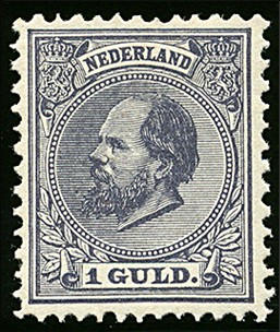 28, 1 Gulden grijsviolet, postfris prachtex. met certificaat C. Muis (2000) € 2500