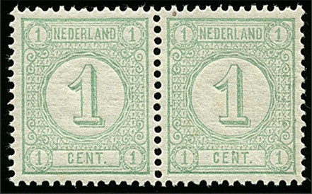 31Fx, 1 cent groen op horizontaal gestreept papier, postfris paar (enkele bruine puntjes) met keur Keizer € 300
