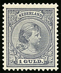 44, Hangend Haar, 1 Gulden grijsviolet, ongebruikt prachtex. met lichte plakkerrest € 1000