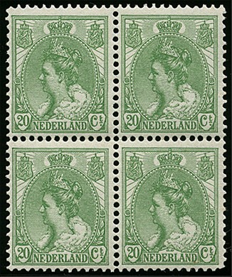 68, 20 cent groen in blok van vier, waarvan de twee bovenste ex. met licht plakkerspoor, het rechter-onder ex. lichte oxidatie en ronde hoek, en het linker-onder ex. luxe postfris. Cert. Bakker (2010) ca. € 2200 +