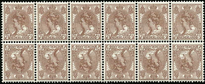61b, 7½ cent Bontkraag in prachtblok van zes keerdrukparen met 2 plakkerresten links- en rechtsboven, middelste twee paren postfris. € 660