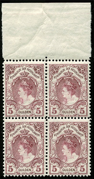 79A, 5 Gulden Bontkraag in Lijntanding 11, postfris luxe randblok van vier € 4000