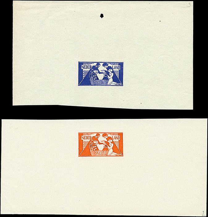 Toorop 1923. Kleurproef van de 2 cent in de gekozen kleur oranjerood voor de 10 cent (onderste helft van in tweeën geknipt velletje), alsmede kleurproef van de 2 cent in de gekozen kleur violetblauw, doch niet in de gekozen waarde-aanduiding (bovenste helft van in tweeën geknipt velletje), ongegomd en op crème getint papier