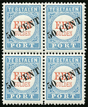 27/28 Type III, 3 cent op 1 gulden en 50 cent op 1 gulden, postfrisse prachtblokken van vier (3 cent met velrand). € 3200