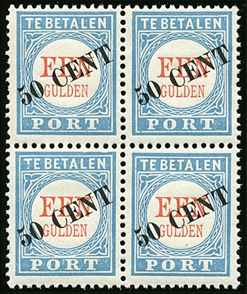 27/28 Type III, 3 cent op 1 gulden en 50 cent op 1 gulden, postfrisse prachtblokken van vier (3 cent met velrand). € 3200