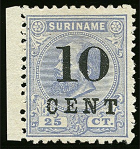 32aD, 10 cent op 25 ct. ultramarijn, Kt. 11½ x 12, ongebruikt prachtex. met cert. NVPH (1977) € 825