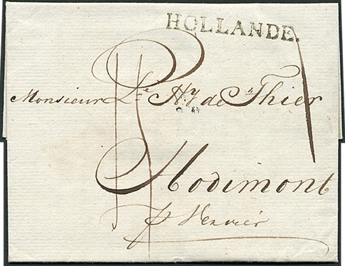 Negen luxe cpl. vouwbrieven 1798-1807 naar Frankrijk (8x) of de Zuidelijke Nederlanden (1x) via diverse uitwisselingskantoren, waar de brieven werden versierd met een stempel 'H' of luxe (!) afdrukken 'HOLLANDE' (o.a. VdL. 1719 in zwart, 1721 en 1721A). Goed gedocumenteerd en van bijzondere kwaliteit!
