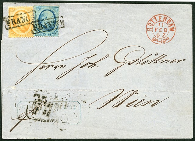 5 Cent en 10 cent nrs. 4-5 (prachtex.) op rouwcouvert van Utrecht 18-4-1866 naar Emden (D) 19-4, alsmede 5 cent en 15 cent nrs. 4 en 6 (prachtex.) op vouwbrief van Rotterdam 11-2-1867 (type K.53) naar Wenen 14-2