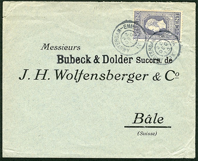 12½ Cent Jub. '13 als enkelfrankering op firmacouvert afgest. grootrond Amsterdam-Emmerik IX 22-12-1913 naar Bazel