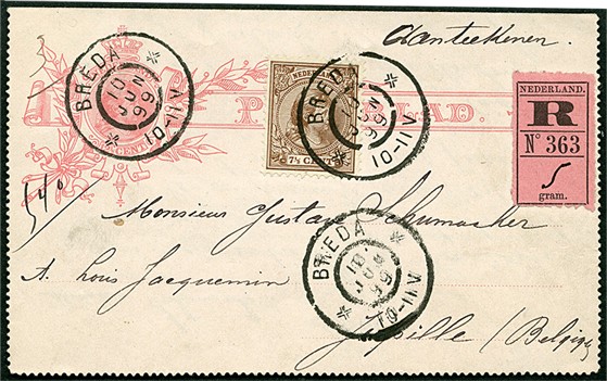 Pb. G7 bijgefr. met 7½c Hangend Haar aangetekend van Breda 10-6-1899 naar Jupille 11-6