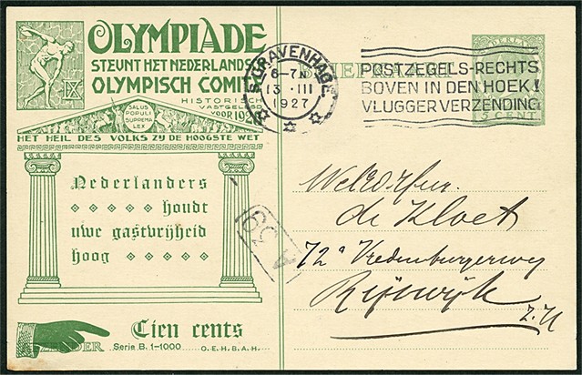 Particulier bedrukte bk. Olympiade 1928, OL18 (Serie B. 1-1000), van 'sGravenhage 13-3-1927 naar Rijswijk