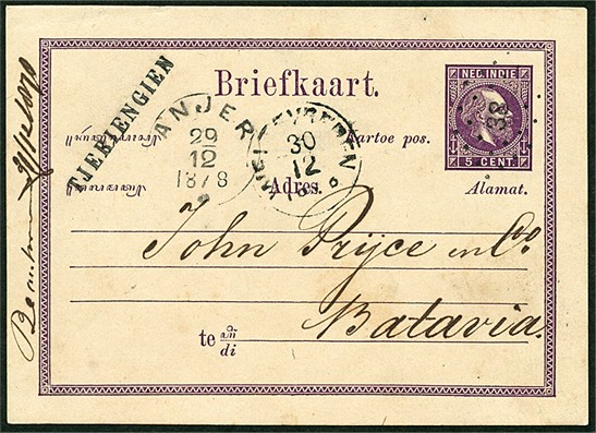 Bk. G1b van TJERIENGIEN via Anjer 29-12-1878 (met puntstempel 38) naar Weltevreden 30-12. Tjeriengien werd op 27-8-1883 door een vloedgolf van 36 meter hoog weggevaagd, het gevolg van de uitbarsting van de Krakatau