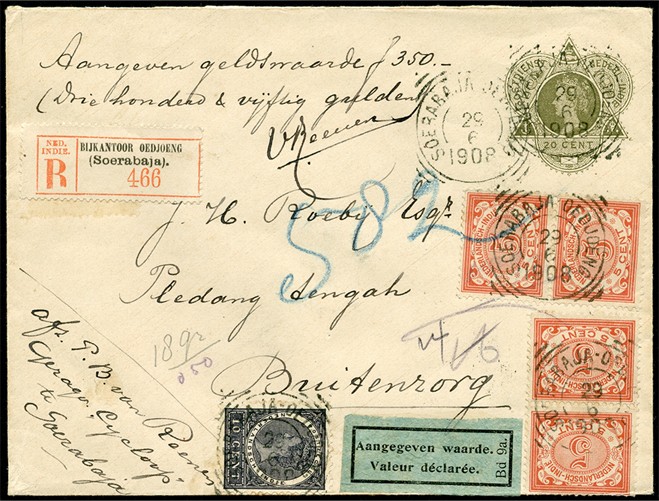 Env. G28 van 18 gram bijgefr. met 4x 5c cijfer en 10c Veth verz. met aangegeven waarde van ƒ 350 van Soerabaja-Oedjoeng 29-6-1908 naar Buitenzorg 1-7