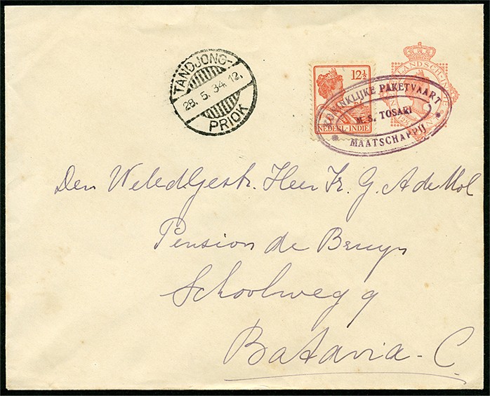 Env. G47 bijgefr. met 12½c afgest. met KPM-ovaalstempel 'M.S. TOSARI' via Tandjongpriok 28-5-1934 naar Batavia-C. 28-5