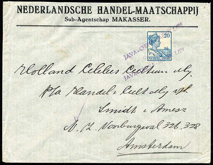 Java-China-Japan Lijn. Env. uit Makasser gefr. met 20c in violet 2x afgest. met J.C.J.L.-naamstempel 'JAVA-CHINA-JAPAN LIJN', via Soerabaja 7-9-1928 naar Amsterdam. Een hoogst ongebruikelijke afstempeling!