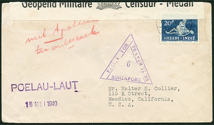 Stoomvaart Mij. Nederland. SMN-naamstempel 'POELAU-LAUT' met datumstempel '16 MEI 1940' op env. gefr. met 20c van Sabang 17-5-1940 over Medan en Singapore, daar beide gecensureerd, naar de USA. Uiterst zeldzaam scheepsstempel!