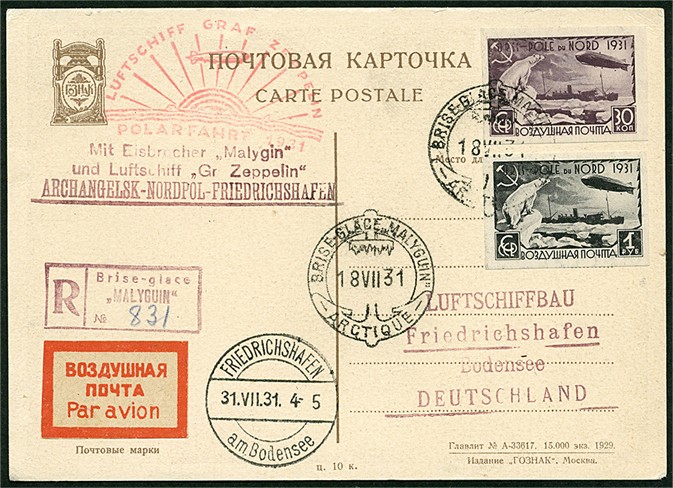 Zeppelinpost. Rusland. Poolvaart 24-31 juli 1931. Envelop en briefkaart gefr. met ongetande zegels Mi.403B + 405B resp. 402B + 404B, met R-stempels van Leningrad resp. de Malyguin. S.120Bb en 120Aa. € 250