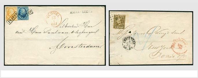 POSTHISTORIE. Acht betere poststukken gefr. met emissies 1852 (15c van Amersfoort naar Bentheim), 1864 (5c+15c uit Aarle-Rixtel), 1867 (5c+10c naar Nimes, 2x5c+10c naar Italië, 2x10c naar Parijs, 20c naar Bordeaux en 50c naar New York) en 1869 (2x1c zwart). De zegels zijn prima, de poststukken redelijk tot goed