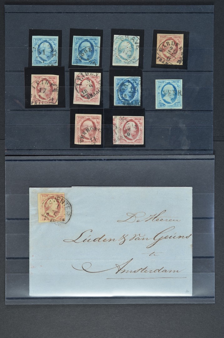 EMISSIE 1852. Halfrond-francostempels Beverwyk A1, Goor B1, Grave C1, Harderwyk A2, Leiden B2 (2x), Naarden B1, naamstempel Venr(ay) op 5c (az. miniem dun plekje), 2b, 2g alsmede Deventer C2 op briefomslag