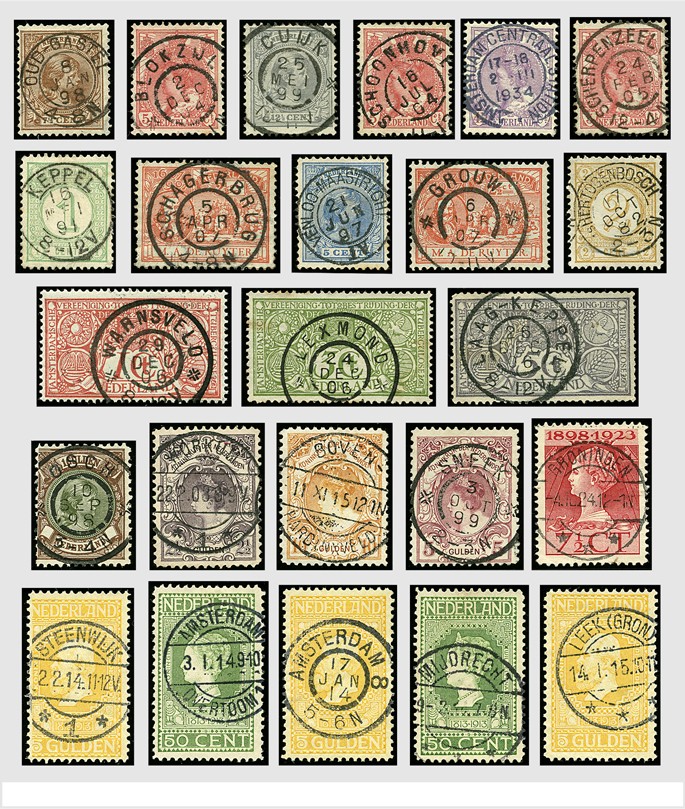POSTHISTORIE. Stempelverzameling op duizenden zegels 1852-1968, keurig gerangschikt op volgorde, alle denkbare en onverwachte stempeltypen, veel van de kleinste bij- en hulppostkantoren waarbij van gehuchten waar u nog niet eerder van heeft gehoord, overzichtelijk opgezet in 6 insteekboeken. Een kavel dat u maanden uitzoekplezier geeft