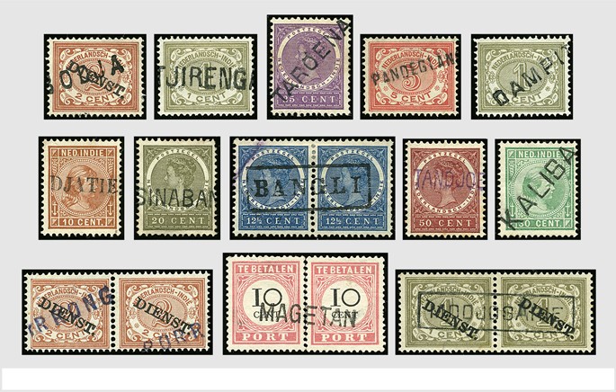 NED.- INDIË POSTHISTORIE, Naamstempels (zgn. 'langstempels') van (fungerende) hulppostkantoren van A t/m W in diverse typen en kleuren op ca. 4500 zegels van verschillende emissies en waarden, veel mooie afdrukken, ook in aantallen, waarbij (zeer) zeldzame en gezochte kantoren als Amahei, Bangli, Bawean, Bima, Celebes, Djasinga, Ende, Geser, Koeta Tjane, Laboean, Loewoek, Madjene, Mamoedjoe, Manakwari, Paloe, Sipirok, Soengeislan, Takalar, Tjipanas, Tobelo, Wahaai, etc. Door zijn omvang en veelzijdigheid (typen, kleuren, diverse zegels) een zeer aantrekkelijke prachtkoop