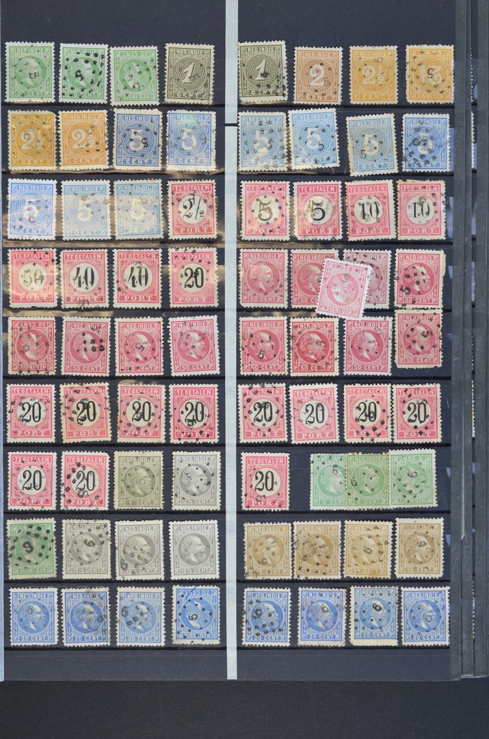 NED.- INDIË POSTHISTORIE. Puntstempels tussen 1-120 (zonder 74, 112 en echte 114) in aantallen in kwaliteit variërend van fraaie tot prachtex. op diverse emissies en waarden, merendeels 1870, in 2 dikke insteekboeken (1½ gevuld). Aantrekkelijk kavel voor de liefhebber van onderzoek naar en het opzetten van de verschillende typen van vooral de grote kantoren